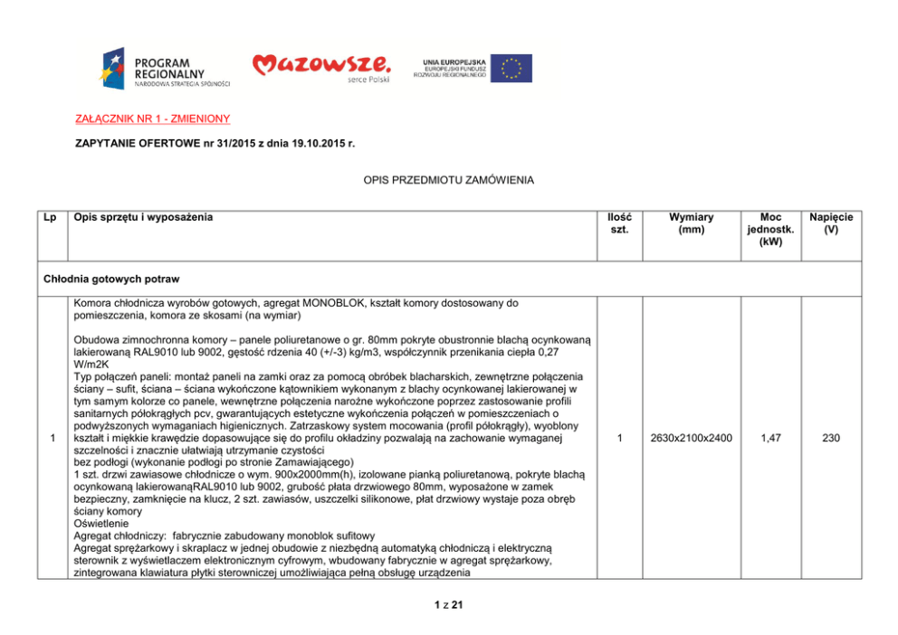 ZAŁĄCZNIK NR 1 - ZMIENIONY ZAPYTANIE OFERTOWE nr 31/2015 z dnia 19.10.2015 r. OPIS PRZEDMIOTU ZAMÓWIENIA Lp Opis sprzętu i wyposażenia Ilość szt. Wymiary (mm) Moc jednostk. (kW) Napięcie (V) 1 2630x2100x2400 1,47 230 Chłodnia gotowych potraw Komora chłodnicza wyrobów gotowych, agregat MONOBLOK, kształt komory dostosowany do pomieszczenia, komora ze skosami (na wymiar) 1 Obudowa zimnochronna komory – panele poliuretanowe o gr. 80mm pokryte obustronnie blachą ocynkowaną lakierowaną RAL9010 lub 9002, gęstość rdzenia 40 (+/-3) kg/m3, współczynnik przenikania ciepła 0,27 W/m2K Typ połączeń paneli: montaż paneli na zamki oraz za pomocą obróbek blacharskich, zewnętrzne połączenia ściany – sufit, ściana – ściana wykończone kątownikiem wykonanym z blachy ocynkowanej lakierowanej w tym samym kolorze co panele, wewnętrzne połączenia narożne wykończone poprzez zastosowanie profili sanitarnych półokrągłych pcv, gwarantujących estetyczne wykończenia połączeń w pomieszczeniach o podwyższonych wymaganiach higienicznych. Zatrzaskowy system mocowania (profil półokrągły), wyoblony kształt i miękkie krawędzie dopasowujące się do profilu okładziny pozwalają na zachowanie wymaganej szczelności i znacznie ułatwiają utrzymanie czystości bez podłogi (wykonanie podłogi po stronie Zamawiającego) 1 szt. drzwi zawiasowe chłodnicze o wym. 900x2000mm(h), izolowane pianką poliuretanową, pokryte blachą ocynkowaną lakierowanąRAL9010 lub 9002, grubość płata drzwiowego 80mm, wyposażone w zamek bezpieczny, zamknięcie na klucz, 2 szt. zawiasów, uszczelki silikonowe, płat drzwiowy wystaje poza obręb ściany komory Oświetlenie Agregat chłodniczy: fabrycznie zabudowany monoblok sufitowy Agregat sprężarkowy i skraplacz w jednej obudowie z niezbędną automatyką chłodniczą i elektryczną sterownik z wyświetlaczem elektronicznym cyfrowym, wbudowany fabrycznie w agregat sprężarkowy, zintegrowana klawiatura płytki sterowniczej umożliwiająca pełną obsługę urządzenia 1 z 21 wydajność chłodnicza 1480W przy temp. w komorze 0 C, otoczenia +32C, pobór mocy 1,47kW, zasilanie 230/1/50 Volt/Ph/Hz , wymiary agregatu: 760x540x806(h)mm, waga 83kg chłodnica wyposażona w kapilarę, odszranianie gorącym gazem przechowywanie wychłodzonych produktów w temp. 0/+5C Regał z 4 półkami (na wymiar) 2 Konstrukcja aluminiowa, anodyzowana. Półki polietylenowe przeznaczone do kontaktu z żywnością.Półki mogą być montowane na różnych wysokościach, w zależności od potrzeb i przeznaczenia (odstępy między poziomami co 150 mm). Łatwy montaż bez użycia specjalistycznych narzędzi. Łatwe w czyszczeniu i konserwacji. Wkłady polietylenowe dające się w prosty sposób zdjąć i myć w profesjonalnych zmywarkach. 1 790x500x1750 - - 1 1390x500x1750 - - 1 1000x500x1800 - - 1 - - - Regał z 4 półkami (na wymiar) 3 Konstrukcja aluminiowa, anodyzowana. Półki polietylenowe przeznaczone do kontaktu z żywnością. Półki mogą być montowane na różnych wysokościach, w zależności od potrzeb i przeznaczenia (odstępy między poziomami co 150 mm). Łatwy montaż bez użycia specjalistycznych narzędzi. Łatwe w czyszczeniu i konserwacji. Wkłady polietylenowe dające się w prosty sposób zdjąć i myć w profesjonalnych zmywarkach. Komunikacja Szafa porządkowa z wbudowanym nisko zlewem + bateria sztorcowa z wyciąganą wylewką (na wymiar) 4 Stal nierdzewna kwasoodporna 1.4301, Sprawna konstrukcja szkieletowa lub korpusowa zapewniająca sztywność i wytrzymałość na obciążenia pionowe (min. 2000 N) i boczne (min. 1000 N) Bateria z wysoko uniesiona wylewką 5 Bateria zlewozmywakowa stojąca, jednootworowa, jednouchwytowa. Wylewka obrotowa. Mieszacz ceramiczny. W komplecie dwa elastyczne wężyki przyłączeniowe w oplocie stalowym z końcówką 3/8". 2 z 21 Szatnia personelu z aneksem socjalnym Szafka szatniowa dwudzielna, z ławką (na wymiar) 6 Solidna konstrukcja stalowa z wysokiej jakości blachy europejskich producentów, drzwi z profilem wzmacniającym, osadzone na ukrytych zawiasach, na drzwiach otwory wentylacyjne oraz ramka na etykietę, nogi ze stópkami regulacyjnymi, ułatwiają sprzątanie pod szafą oraz poziomowanie, łatwość utrzymania czystości dzięki gładkiej, jednolitej powierzchni oraz wentylacji otworowej. 5 400x700x1800 - - 1 700x760x850 - - 1 790x570x799 (tolerancja +/ - 50 mm) - - Zmywalnia naczyń Stół wyładowczy ze zmywarki (na wymiar) 7 Stal nierdzewna kwasoodporna 1.4301, konstrukcja spawana, prowadnica na kosz. Rozdzielnia kelnerska Ekspres do kawy, przelewowy + termos z dozownikiem; wydajność 240 filiżanek/h Urządzenie do parzenia kawy przelewowej z wbudowanym warnikiem, z podłączeniem 3/4" do sieci wodociągowej. Parzenie kawy bezpośrednio do termosów. Posiadające elektroniczny wyświetlacz LCD, licznik dzienny i zbiorczy, system odkamieniania, sygnał „kawa jest gotowa", wbudowany timer i optymalne zabezpieczenia. W zestawie: kolumna zaparzająca z kranikiem gorącej wody, podgrzewany termos(y) ze stali nierdzewnej, koszyk(i) do filtrów, podstawa oraz ociekacz. 8 Model z 1 systemem parzenia z osobnym kranikiem gorącej wody i 2 termosami po 5 litrów Oczekiwane parametry: - Niezmienna, wysoka jakość kawy: podgrzewane termosy utrzymują jej jakość - Wbudowany warnik z regulacją temperatury - Łatwe do przenoszenia termosy - Możliwość ustawiania termosów jeden na drugim - Termosy dwuścienne ze wskaźnikiem ilości kawy i niekapiącym kranikiem - Sygnał „kawa jest gotowa", liczniki dzienne i zbiorcze, wbudowany timer - Możliwość wyboru: filiżanka/dzbanek/litr/galon 3 z 21 - System odkamieniania - czujnik termosu i położenia wylewki obrotowej. Wydajność na godzinę minimum 30 litrów Godziny zdolności ciepłej wody minimum 20 litrów Czas parzenia kawy maksymalnie 10 min Automatyczny zmiękczacz wody, regeneracja po upływie ustalonej ilości wody 9 Urządzen