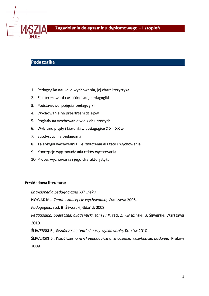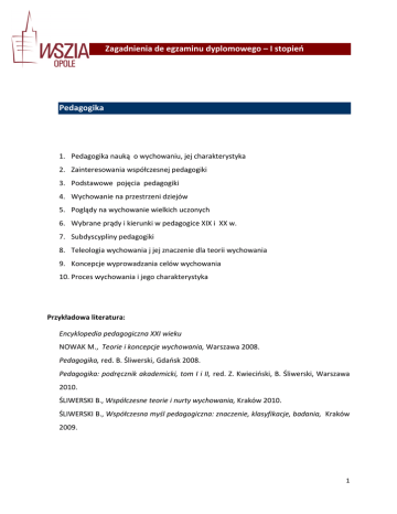 Zagadnienia de egzaminu dyplomowego – I stopień Pedagogika 1. Pedagogika nauką o wychowaniu, jej charakterystyka 2. Zainteresowania współczesnej pedagogiki 3. Podstawowe pojęcia pedagogiki 4. Wychowanie na przestrzeni dziejów 5. Poglądy na wychowanie wielkich uczonych 6. Wybrane prądy i kierunki w pedagogice XIX i XX w. 7. Subdyscypliny pedagogiki 8. Teleologia wychowania j jej znaczenie dla teorii wychowania 9. Koncepcje wyprowadzania celów wychowania 10. Proces wychowania i jego charakterystyka Przykładowa literatura: Encyklopedia pedagogiczna XXI wieku NOWAK M., Teorie i koncepcje wychowania, Warszawa 2008. Pedagogika, red. B. Śliwerski, Gdańsk 2008. Pedagogika: podręcznik akademicki, tom I i II, red. Z. Kwieciński, B. Śliwerski, Warszawa 2010. ŚLIWERSKI B., Współczesne teorie i nurty wychowania, Kraków 2010. ŚLIWERSKI B., Współczesna myśl pedagogiczna: znaczenie, klasyfikacje, badania, Kraków 2009. 1 Metody i techniki badań pedagogicznych 1. Przedstaw w kolejności etapy procesu badawczego 2. Co to jest metoda badań 3. Wymień metody badań 4. Co to jest eksperyment pedagogiczny? 5. Co to jest metoda indywidualnych przypadków? 6. Co to jest sondaż diagnostyczny? 7. Co to jest monografia pedagogiczna? 8. Co to jest technika badawcza? 9. Wymień techniki badawcze 10. Co to jest obserwacja? 11. Jakie są typy obserwacji? 12. Co to jest wywiad? 13. Jakie znasz typy wywiadu? 14. Ankieta jako technika – definicja 15. Co to jest badanie dokumentów? 16. Co to jest analiza treści? 17. Co to są techniki projekcyjne? 18. Co to są narzędzia badawcze? 19. Wymień narzędzia badawcze 20. Co to jest trafność? 21. Co to jest rzetelność? 22. Co to jest kafeteria? 23. Jakie znasz rodzaje kafeterii? 24. Co to jest metryczka? Przykładowa literatura: BABBIE E., Badania społeczne w praktyce, Warszawa 2003. FRANKFORT-NACHMIAS CH., NACHMIAS D., Metody badawcze w naukach społecznych, Poznań 2001. 2 KUBINOWSKI D., Jakościowe badania pedagogiczne, Lublin 2010. ŁOBOCKI M., Metody i techniki badań pedagogicznych, Kraków 2011. ŁOBOCKI M., Wprowadzenie do metodologii badań pedagogicznych, Kraków 2010. MASZKE A. W., Metody i techniki badań pedagogicznych, Rzeszów 2008. NOWAK S., Metodologia badań społecznych, Warszawa 2007. PALKA S., Metodologia. Badania. Praktyka pedagogiczna, Gdańsk 2006. PILCH T., BAUMAN T., Zasady badań pedagogicznych. Strategie ilościowe i jakościowe, Warszawa 2010. Podstawy metodologii badan w pedagogice, red. S. Palka, Gdańsk 2010. SILVERMAN D., Interpretacja danych jakościowych, Warszawa 2008. SZTUMSKI J., Wstęp do metod i technik badań społecznych, Katowice 2010. Inna literatura po 2000 r. według zaleceń promotora. 3