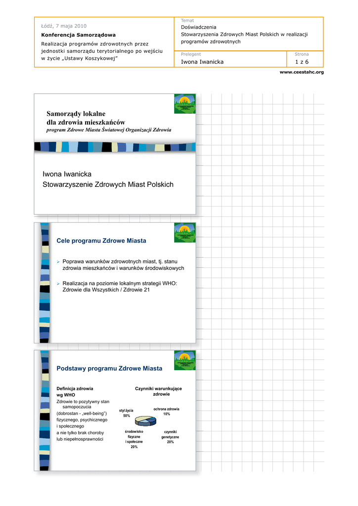 Temat Łódź, 7 maja 2010 Konferencja Samorządowa Realizacja programów zdrowotnych przez jednostki samorządu terytorialnego po wejściu w życie „Ustawy Koszykowej” Doświadczenia Stowarzyszenia Zdrowych Miast Polskich w realizacji programów zdrowotnych Prelegent Strona Iwona Iwanicka 1z6 www.ceestahc.org Samorządy lokalne dla zdrowia mieszkaĔców program Zdrowe Miasta ĝwiatowej Organizacji Zdrowia Iwona Iwanicka Stowarzyszenie Zdrowych Miast Polskich Cele programu Zdrowe Miasta ¾ Poprawa warunków zdrowotnych miast, tj. stanu zdrowia mieszkaĔców i warunków Ğrodowiskowych ¾ Realizacja na poziomie lokalnym strategii WHO: Zdrowie dla Wszystkich / Zdrowie 21 Podstawy programu Zdrowe Miasta Definicja zdrowia wg WHO Zdrowie to pozytywny stan samopoczucia (dobrostan - „well-being”) fizycznego, psychicznego i spoáecznego a nie tylko brak choroby lub niepeánosprawnoĞci Czynniki warunkujące zdrowie styl Īycia 50% Ğrodowisko fizyczne i spoáeczne 20% ochrona zdrowia 10% czynniki genetyczne 20% Temat Łódź, 7 maja 2010 Konferencja Samorządowa Realizacja programów zdrowotnych przez jednostki samorządu terytorialnego po wejściu w życie „Ustawy Koszykowej” Doświadczenia Stowarzyszenia Zdrowych Miast Polskich w realizacji programów zdrowotnych Prelegent Strona Iwona Iwanicka 2z6 www.ceestahc.org Zdrowe Miasto powinno zapewniü: ¾ ¾ ¾ ¾ ¾ ¾ ¾ zaspokojenie podstawowych potrzeb mieszkaĔców czyste, bezpieczne Ğrodowisko wysoki poziom zdrowotny optymalny poziom usáug medycznych nowoczesny system ekonomiczny silne, wzajemnie wspierające siĊ spoáeczeĔstwo udziaá spoáeczeĔstwa w decyzjach dot. zdrowia Jakie jest Zdrowe Miasto? ¾ to miasto, które dąĪy do podniesienia stanu zdrowia fizycznego, psychicznego i spoáecznego oraz Ğrodowiskowych warunków Īycia mieszkaĔców; ¾ to miasto, które uwzglĊdnia zdrowie w procesie podejmowania decyzji w róĪnych sektorach Īycia; ¾ to miasto Ğwiadome swoich problemów zdrowotnych i dąĪące do ich rozwiązania; ¾ to nie honorowych tytuá przyznany przez WHO, to cel wspólnych dziaáaĔ. Elementy pracy w Zdrowym MieĞcie – wymogi WHO ¾ PrzyjĊcie strategii dziaáania Zdrowych Miast – uchwaáa R.M., list intencyjny Prezydenta, wsparcie wáadz miasta, akceptacja idei programu i sposobu dziaáania na rzecz zdrowia ¾ Zabezpieczenie organizacyjnych moĪliwoĞci realizacji programu – wsparcie wielosektorowych dziaáaĔ ¾ Zobowiązanie do osiągniĊcia konkretnych celów – realizacja dziaáaĔ w obszarach priorytetowych wskazanych przez WHO oraz wybranych przez miasto ¾ Wspóápraca na poziomie miasta i kraju Temat Łódź, 7 maja 2010 Konferencja Samorządowa Realizacja programów zdrowotnych przez jednostki samorządu terytorialnego po wejściu w życie „Ustawy Koszykowej” Doświadczenia Stowarzyszenia Zdrowych Miast Polskich w realizacji programów zdrowotnych Prelegent Strona Iwona Iwanicka 3z6 www.ceestahc.org Program Zdrowe Miasta w Europie I faza - 1988-1992 - 35 miast II faza - 1993-1997 - 39 miast, w tym: Biaáystok, PoznaĔ, ToruĔ, àódĨ III faza - 1998-2002 - 55 miast, w tym ToruĔ i àódĨ IV faza - 2003 –2008, 79 miast, w tym àódĨ i PoznaĔ V faza – 2009 – 2013, sieü siĊ tworzy, aktualnie: 52 miasta, w tym àódĨ i PoznaĔ, aplikuje Warszawa V faza programu Zdrowe Miasta 2009-2013 Zdrowie i sprawiedliwoĞü w sferze zdrowia we wszystkich strategiach lokalnych I. OpiekuĔcze i wspierające Ğrodowiska Miasta przyjazne ludziom starszym, imigranci, dzieci, kobiety, podstawowa opieka zdrowotna, wsparcie spoáeczne, wzmocnienie aktywnoĞci spoáecznoĞci lokalnej II. Zdrowe Īycie profilaktyka chorób niezakaĨnych, miasta wolne od tytoniu, aktywnoĞü fizyczna, Īywienie, alkohol i narkotyki, zdrowie psychiczne i stres, przemoc i urazy III. ĝrodowisko miejskie i zagospodarowanie przestrzeni sprzyjające zdrowiu zmiany klimatyczne, planowanie urbanistyczne, rozwój ekonomiczny, zasoby mieszkaniowe i rewitalizacja, przygotowanie na sytuacje kryzysowe w sferze zdrowia publicznego, transport, haáas, zanieczyszczenie Ğrodowiska Stowarzyszenie Zdrowych Miast Polskich ¾ ¾ ¾ ¾ ¾ ¾ organizacja pozarządowa – czáonkami są samorządy lokalne podstawa przystąpienia: uchwaáa Rady Miasta / Gminy rok powstania – 1993 16 czáonków zaáoĪycieli siedziba: àódĨ 44 czáonków, o áącznej populacji ok. 7,5 mln ludnoĞci Temat Łódź, 7 maja 2010 Konferencja Samorządowa Realizacja programów zdrowotnych przez jednostki samorządu terytorialnego po wejściu w życie „Ustawy Koszykowej” Doświadczenia Stowarzyszenia Zdrowych Miast Polskich w realizacji programów zdrowotnych Prelegent Strona Iwona Iwanicka 4z6 www.ceestahc.org Stowarzyszenie Zdrowych Miast Polskich Certyfikat WHO Stowarzyszenie Zdrowych Miast Polskich speánia wymogi WHO dla narodowych sieci Zdrowych Miast. Gáówne dziaáania Stowarzyszenia ¾ coroczne konferencje Zdrowych Miast (19-21 maja br. ĝrem), ¾ szkolenia koordynatorów lokalnych, ¾ coroczne konkursy grantów, ¾ bieĪąca wspóápraca z WHO, ¾ wspóápraca z instytucjami i organizacjami zajmującymi siĊ problematyką zdrowotną i ekologiczną, ¾ biuletyn i strona internetowa. Temat Łódź, 7 maja 2010 Konferencja Samorządowa Realizacja programów zdrowotnych przez jednostki samorządu terytorialnego po wejściu w życie „Ustawy Koszykowej” Doświadczenia Stowarzyszenia Zdrowych Miast Polskich w realizacji programów zdrowotnych Prelegent Strona Iwona Iwanicka 5z6 www.ceestahc.org Dziaáania w Zdrowych Miastach ¾ ¾ ¾ ¾ ¾ ¾ profilaktyka i wczesne wykrywanie nowotworów: piersi, szyjki macicy, jelita, prostaty, páuca, skóry; profilaktyka chorób ukáadu krąĪenia; profilaktyka uzaleĪnieĔ: alkohol, narkotyki, tytoĔ; dziaáania na rzecz Ğrodowiska: poprawa gospodarki wodnoĞciekowej, redukcja niskiej emisji, ochrona zieleni, ograniczenie haáasu, selektywna zbiórka odpadów; dziaáania wspierające osoby starsze i nie