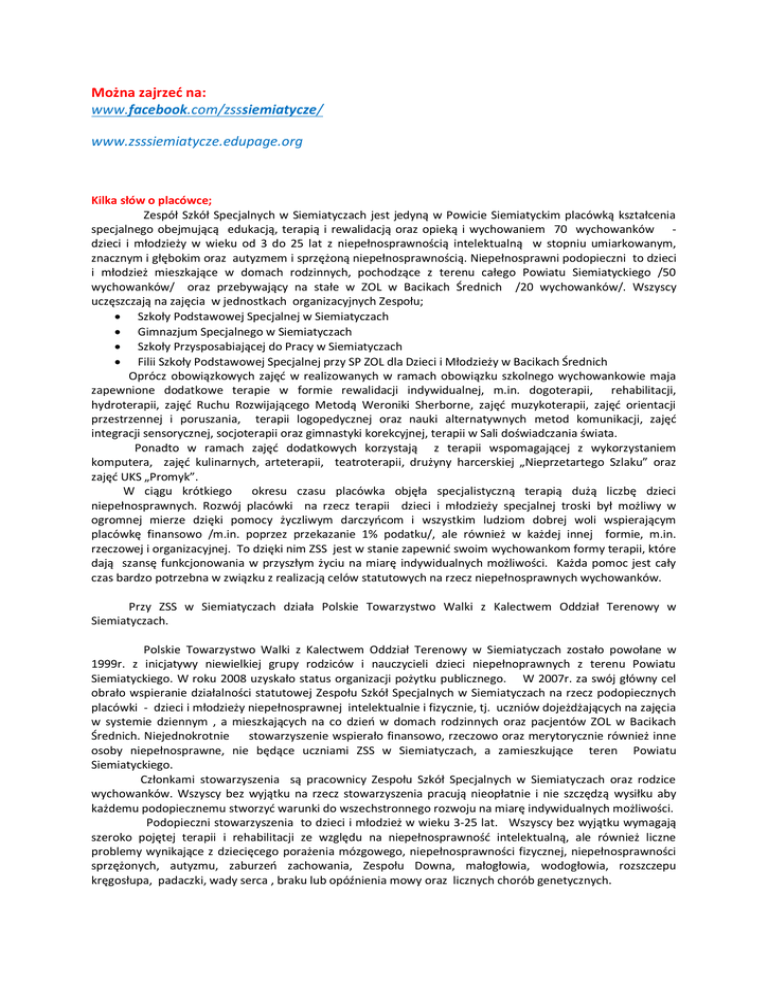 Można zajrzeć na: www.facebook.com/zsssiemiatycze/ www.zsssiemiatycze.edupage.org Kilka słów o placówce; Zespół Szkół Specjalnych w Siemiatyczach jest jedyną w Powicie Siemiatyckim placówką kształcenia specjalnego obejmującą edukacją, terapią i rewalidacją oraz opieką i wychowaniem 70 wychowanków dzieci i młodzieży w wieku od 3 do 25 lat z niepełnosprawnością intelektualną w stopniu umiarkowanym, znacznym i głębokim oraz autyzmem i sprzężoną niepełnosprawnością. Niepełnosprawni podopieczni to dzieci i młodzież mieszkające w domach rodzinnych, pochodzące z terenu całego Powiatu Siemiatyckiego /50 wychowanków/ oraz przebywający na stałe w ZOL w Bacikach Średnich /20 wychowanków/. Wszyscy uczęszczają na zajęcia w jednostkach organizacyjnych Zespołu; Szkoły Podstawowej Specjalnej w Siemiatyczach Gimnazjum Specjalnego w Siemiatyczach Szkoły Przysposabiającej do Pracy w Siemiatyczach Filii Szkoły Podstawowej Specjalnej przy SP ZOL dla Dzieci i Młodzieży w Bacikach Średnich Oprócz obowiązkowych zajęć w realizowanych w ramach obowiązku szkolnego wychowankowie maja zapewnione dodatkowe terapie w formie rewalidacji indywidualnej, m.in. dogoterapii, rehabilitacji, hydroterapii, zajęć Ruchu Rozwijającego Metodą Weroniki Sherborne, zajęć muzykoterapii, zajęć orientacji przestrzennej i poruszania, terapii logopedycznej oraz nauki alternatywnych metod komunikacji, zajęć integracji sensorycznej, socjoterapii oraz gimnastyki korekcyjnej, terapii w Sali doświadczania świata. Ponadto w ramach zajęć dodatkowych korzystają z terapii wspomagającej z wykorzystaniem komputera, zajęć kulinarnych, arteterapii, teatroterapii, drużyny harcerskiej „Nieprzetartego Szlaku” oraz zajęć UKS „Promyk”. W ciągu krótkiego okresu czasu placówka objęła specjalistyczną terapią dużą liczbę dzieci niepełnosprawnych. Rozwój placówki na rzecz terapii dzieci i młodzieży specjalnej troski był możliwy w ogromnej mierze dzięki pomocy życzliwym darczyńcom i wszystkim ludziom dobrej woli wspierającym placówkę finansowo /m.in. poprzez przekazanie 1% podatku/, ale również w każdej innej formie, m.in. rzeczowej i organizacyjnej. To dzięki nim ZSS jest w stanie zapewnić swoim wychowankom formy terapii, które dają szansę funkcjonowania w przyszłym życiu na miarę indywidualnych możliwości. Każda pomoc jest cały czas bardzo potrzebna w związku z realizacją celów statutowych na rzecz niepełnosprawnych wychowanków. Przy ZSS w Siemiatyczach działa Polskie Towarzystwo Walki z Kalectwem Oddział Terenowy w Siemiatyczach. Polskie Towarzystwo Walki z Kalectwem Oddział Terenowy w Siemiatyczach zostało powołane w 1999r. z inicjatywy niewielkiej grupy rodziców i nauczycieli dzieci niepełnoprawnych z terenu Powiatu Siemiatyckiego. W roku 2008 uzyskało status organizacji pożytku publicznego. W 2007r. za swój główny cel obrało wspieranie działalności statutowej Zespołu Szkół Specjalnych w Siemiatyczach na rzecz podopiecznych placówki - dzieci i młodzieży niepełnosprawnej intelektualnie i fizycznie, tj. uczniów dojeżdżających na zajęcia w systemie dziennym , a mieszkających na co dzień w domach rodzinnych oraz pacjentów ZOL w Bacikach Średnich. Niejednokrotnie stowarzyszenie wspierało finansowo, rzeczowo oraz merytorycznie również inne osoby niepełnosprawne, nie będące uczniami ZSS w Siemiatyczach, a zamieszkujące teren Powiatu Siemiatyckiego. Członkami stowarzyszenia są pracownicy Zespołu Szkół Specjalnych w Siemiatyczach oraz rodzice wychowanków. Wszyscy bez wyjątku na rzecz stowarzyszenia pracują nieopłatnie i nie szczędzą wysiłku aby każdemu podopiecznemu stworzyć warunki do wszechstronnego rozwoju na miarę indywidualnych możliwości. Podopieczni stowarzyszenia to dzieci i młodzież w wieku 3-25 lat. Wszyscy bez wyjątku wymagają szeroko pojętej terapii i rehabilitacji ze względu na niepełnosprawność intelektualną, ale również liczne problemy wynikające z dziecięcego porażenia mózgowego, niepełnosprawności fizycznej, niepełnosprawności sprzężonych, autyzmu, zaburzeń zachowania, Zespołu Downa, małogłowia, wodogłowia, rozszczepu kręgosłupa, padaczki, wady serca , braku lub opóźnienia mowy oraz licznych chorób genetycznych. Każda forma terapii wymaga dużych nakładów finansowych. Dlatego tak ogromne znaczenie ma wsparcie finansowe , m.in. każdy 1% podatku przekazany na rzecz podopiecznych stowarzyszenia. Dzięki przekazanym środkom finansowym pochodzącym z 1% podatku na rzecz PTWK o. Terenowy w Siemiatyczach możliwa jest realizacja planów i zamierzeń związanych z terapią niepełnoprawnych wychowanków Zespołu Szkół Specjalnych w Siemiatyczach. Dotychczas udało się m.in. udzielić indywidualnego wsparcia finansowego rodzicom dzieci i młodzieży niepełnosprawnej z przeznaczeniem na dofinansowanie, m.in.: zakupu lekarstw, środków pomocniczych i pielęgnacyjnych niezbędnych w codziennym funkcjonowaniu dziecka niepełnosprawnego, a wspomagających proces leczenia i rehabilitacji ; zabiegów rehabilitacji dzieci oraz usług pielęgnacyjnych dziecka związanych z codziennymi zabiegami cewnikowania; konsultacji lekarskich oraz prowadzonych diagnoz związanych z chorobą dzieci; zakupu wózków inwalidzkich; zakupu sprzętu rehabilitacyjnego, sprzętu komputerowego i specjalistycznego oprogramowania ; turnusów rehabilitacyjnych uczniom szkoły. Ponadto dofinansowano: zakup środków terapeutycznych przeznaczonych do terapii podczas zajęć prowadzonych w Zespole Szkół Specjalnych w Siemiatyczach, m.in. zajęć teatroterapii, muzykoterapii, rewalidacji indywidualnej, zajęć logopedycznych i zajęć rewalidacyjno-wychowawczych; zakup wyposażenia oraz urządzenie sal do terapii - „Sali doświadczania świata” oraz „Sali integracji sensorycznej ”; dodatkowe zajęcia z muzykoterapii z udziałem wszystkich uczniów szkoły; wy