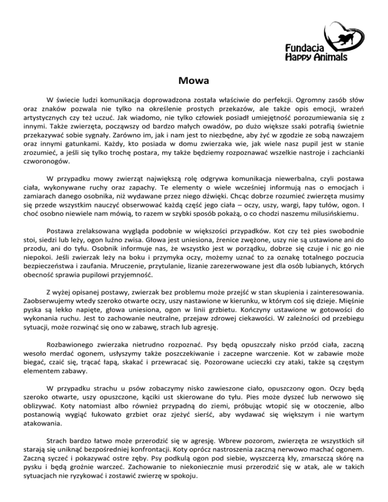 Mowa W świecie ludzi komunikacja doprowadzona została właściwie do perfekcji. Ogromny zasób słów oraz znaków pozwala nie tylko na określenie prostych przekazów, ale także opis emocji, wrażeń artystycznych czy też uczuć. Jak wiadomo, nie tylko człowiek posiadł umiejętność porozumiewania się z innymi. Także zwierzęta, począwszy od bardzo małych owadów, po dużo większe ssaki potrafią świetnie przekazywać sobie sygnały. Zarówno im, jak i nam jest to niezbędne, aby żyć w zgodzie ze sobą nawzajem oraz innymi gatunkami. Każdy, kto posiada w domu zwierzaka wie, jak wiele nasz pupil jest w stanie zrozumieć, a jeśli się tylko trochę postara, my także będziemy rozpoznawać wszelkie nastroje i zachcianki czworonogów. W przypadku mowy zwierząt największą rolę odgrywa komunikacja niewerbalna, czyli postawa ciała, wykonywane ruchy oraz zapachy. Te elementy o wiele wcześniej informują nas o emocjach i zamiarach danego osobnika, niż wydawane przez niego dźwięki. Chcąc dobrze rozumieć zwierzęta musimy się przede wszystkim nauczyć obserwować każdą część jego ciała – oczy, uszy, wargi, łapy tułów, ogon. I choć osobno niewiele nam mówią, to razem w szybki sposób pokażą, o co chodzi naszemu milusińskiemu. Postawa zrelaksowana wygląda podobnie w większości przypadków. Kot czy też pies swobodnie stoi, siedzi lub leży, ogon luźno zwisa. Głowa jest uniesiona, źrenice zwężone, uszy nie są ustawione ani do przodu, ani do tyłu. Osobnik informuje nas, że wszystko jest w porządku, dobrze się czuje i nic go nie niepokoi. Jeśli zwierzak leży na boku i przymyka oczy, możemy uznać to za oznakę totalnego poczucia bezpieczeństwa i zaufania. Mruczenie, przytulanie, lizanie zarezerwowane jest dla osób lubianych, których obecność sprawia pupilowi przyjemność. Z wyżej opisanej postawy, zwierzak bez problemu może przejść w stan skupienia i zainteresowania. Zaobserwujemy wtedy szeroko otwarte oczy, uszy nastawione w kierunku, w którym coś się dzieje. Mięśnie pyska są lekko napięte, głowa uniesiona, ogon w linii grzbietu. Kończyny ustawione w gotowości do wykonania ruchu. Jest to zachowanie neutralne, przejaw zdrowej ciekawości. W zależności od przebiegu sytuacji, może rozwinąć się ono w zabawę, strach lub agresję. Rozbawionego zwierzaka nietrudno rozpoznać. Psy będą opuszczały nisko przód ciała, zaczną wesoło merdać ogonem, usłyszymy także poszczekiwanie i zaczepne warczenie. Kot w zabawie może biegać, czaić się, trącać łapą, skakać i przewracać się. Pozorowane ucieczki czy ataki, także są częstym elementem zabawy. W przypadku strachu u psów zobaczymy nisko zawieszone ciało, opuszczony ogon. Oczy będą szeroko otwarte, uszy opuszczone, kąciki ust skierowane do tyłu. Pies może dyszeć lub nerwowo się oblizywać. Koty natomiast albo również przypadną do ziemi, próbując wtopić się w otoczenie, albo postanowią wygiąć łukowato grzbiet oraz zjeżyć sierść, aby wydawać się większym i nie wartym atakowania. Strach bardzo łatwo może przerodzić się w agresję. Wbrew pozorom, zwierzęta ze wszystkich sił starają się uniknąć bezpośredniej konfrontacji. Koty oprócz nastroszenia zaczną nerwowo machać ogonem. Zaczną syczeć i pokazywać ostre zęby. Psy podkulą ogon pod siebie, wyszczerzą kły, zmarszczą skórę na pysku i będą groźnie warczeć. Zachowanie to niekoniecznie musi przerodzić się w atak, ale w takich sytuacjach nie ryzykować i zostawić zwierzę w spokoju. Należy również pamiętać, że każdy gatunek ma swój własny, unikatowy język. Inaczej odczytywane będzie zachowanie psa, inaczej kota. W zupełnie inny sposób zaś porozumiemy się z koniem, szczurkiem czy też fretką. Co więcej, reakcje zwierząt mogą się także nieznacznie różnić w przypadku poszczególnych osobników. Dlatego też o wiele łatwiej dogadać się ze swoim własnym zwierzątkiem, niż z psem sąsiada. W domowym zaciszu zachowania te nie muszą być aż tak silnie wyrażone. Nie zawsze więc zauważymy wszystkie elementy danej postawy, lecz tylko niektóre z nich. Dzięki pilnej obserwacji naszych pupili, szybko nauczymy się rozpoznawać co sprawia im przyjemność, a co wprawia w zakłopotanie. Dzięki temu o wiele łatwiej będzie nam wychować naszego podopiecznego. Zapewnimy mu stabilizację oraz poczucie bezpieczeństwa, a sami unikniemy niepotrzebnych zadrapań i ugryzień. Zdobytą w ten sposób wiedzę możemy wykorzystać nie tylko w sposób bierny. Próbując skopiować pewne ruchy, możemy w jasny sposób zakomunikować zwierzakowi, jakie jego zachowanie nam odpowiada, a jakie nie. Jeśli to osiągniemy, czeka nas długie, szczęśliwe, a przede wszystkim zgodne życie z ukochanym czworonogiem. Autor tekstu: Aleksandra Skwarcan Pomóż nam pomagać 74 1050 1575 1000 0090 3015 5601 (ING Bank Śląski S.A.) Fundacja Happy Animals ul. Ogrodowa 62 lok. 9, 55-040 Bielany Wrocławskie