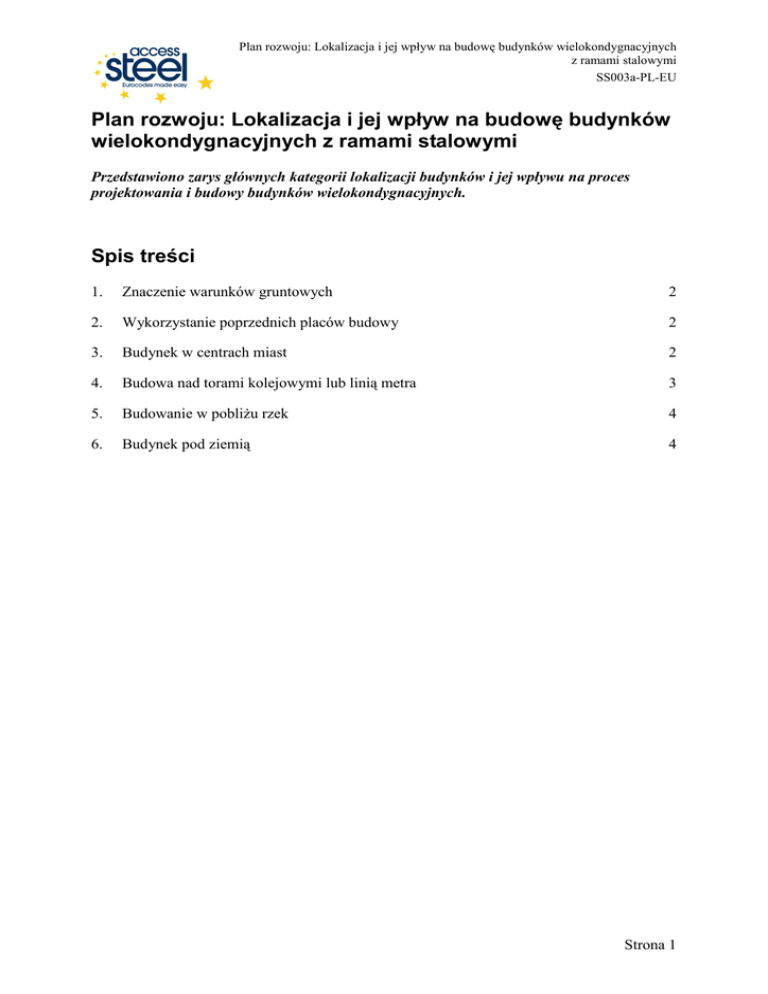 Plan rozwoju: Lokalizacja i jej wpływ na budowę budynków wielokondygnacyjnych z ramami stalowymi SS003a-PL-EU Plan rozwoju: Lokalizacja i jej wpływ na budowę budynków wielokondygnacyjnych z ramami stalowymi Przedstawiono zarys głównych kategorii lokalizacji budynków i jej wpływu na proces projektowania i budowy budynków wielokondygnacyjnych. Spis treści 1. Znaczenie warunków gruntowych 2 2. Wykorzystanie poprzednich placów budowy 2 3. Budynek w centrach miast 2 4. Budowa nad torami kolejowymi lub linią metra 3 5. Budowanie w pobliŜu rzek 4 6. Budynek pod ziemią 4 Strona 1 Plan rozwoju: Lokalizacja i jej wpływ na budowę budynków wielokondygnacyjnych z ramami stalowymi SS003a-PL-EU 1. Znaczenie warunków gruntowych Największe niepewności i związane z tym największe ryzyko dla jakiegokolwiek projektu budowlanego to nieprzewidziane warunki gruntowe: Odpowiednie badanie terenowe jest konieczne by pomniejszyć to ryzyko. Rodzaje fundamentów są takie same dla betonowej lub stalowe konstrukcji. CięŜar konstrukcji stalowej jest mniejszy niŜ połowa cięŜaru konstrukcji betonowej, co pozwala wykorzystać grunty mniej nośne. Wysoki poziom wód gruntowych tworzy trudności dla wszystkich materiałów. Jednak stalowa ścianka szczelna z odpowiednim środkiem nieprzemakalnym, moŜe być uŜyta do stałych prac, oferując wydajną alternatywę do tradycyjnego odwadniania placu budowy i konstrukcji monolitycznej. 2. Wykorzystanie poprzednich placów budowy Wykorzystanie miejsca zburzonego budynku na zbudowanie nowego powoduje powstanie specyficznych problemów technicznych. Przeszkody w postaci istniejących fundamentów i instalacji. Zastosowanie ścianek szczelnych moŜe być problematyczne pomiędzy istniejącymi fundamentami. Zdolność konstrukcji stalowych do osiągania większych ekonomicznych rozpiętości umoŜliwia bardziej elastyczne rozmieszczenie elementów konstrukcji. To umoŜliwia wykorzystanie starych fundamentów lub budowanie nowych obok istniejących. Zachowanie części istniejącego budynku, na przykład zabytkowej elewacji. Plan zachowania zabytkowych elewacji wymaga uŜyci zewnętrznej i wewnętrznej konstrukcji podpierającej elewację (fasadę). Konstrukcja ta moŜe być stosunkowo złoŜona i musi być zintegrowana z końcowym projektem. Układ budynku i wysokość kondygnacji brutto, które utrudniają wykorzystanie dostawianego budynku. Połączenia z przyległymi budynkami (i prawa ich właścicieli albo uŜytkowników). Wymagania dotyczące zwłaszcza wygląd i wysokości budynku. 3. Budynek w centrach miast Budowanie w przeciąŜonych centrach miasta przynosi logistyczne problemy, takie jak: Brak miejsca na magazynowanie materiałów i wyposaŜenia Wymaganie dostawy na budowę waŜnych elementów na określony czas. Zredukowanie hałasu i poziomu wibracji, które mogą oddziaływać na sąsiadów. Wysoki koszt robocizny i często niedostateczne miejscowe kwalifikacje. Strona 2 Plan rozwoju: Lokalizacja i jej wpływ na budowę budynków wielokondygnacyjnych z ramami stalowymi SS003a-PL-EU Konstrukcja stalowa oferuje szczególne korzyści dla budów w centrum miasta. Postępy robót są szybkie, przez to zmniejszają się miejscowe zakłócenia i jest moŜliwość kolejnego dostarczenia elementów, które są wymagane, zaleŜnie od harmonogramu programu budowy. Szybkość budowy jest bezpośrednio związana z liczbą Ŝurawi i indywidualnych elementów, które mogą być podniesione. Dla większości konstrukcji stalowych z jednego Ŝurawia da się w ciągu jednego zmontować 20-30 elementów. 4. Budowa nad torami kolejowymi lub linią metra Konstrukcje stalowe mogą być projektowane ponad torami kolejowymi, istniejącymi budynkami albo rzekami. Konstrukcje te mają przewagę ze względu na swój stosunkowo mały cięŜar i zdolność wykonania sztywnych ścian skratowanych. Dobry przykład budynku z ramami stalowymi, zbudowanego ponad istniejącym budynkiem przy zastosowaniu skratowanych ścian jest pokazany na Rys. 4.1. Rys. 4.1 Biurowiec „De Brug” w Roterdamie, budowany ponad istniejącym budynkiem Budowanie ponad tunelami ma swoiste problemy techniczne, włączając: Konieczność wykonanie fundamentów oddalonych od tunelu. Redukcja osiadań gruntu do dopuszczalnego minimum (często mniej niŜ 5 mm). Przerzucenie konstrukcyjnego mostu ponad tunelem. Redukcja obciąŜenia z powodu wagi samego budynku. Ograniczenia w metodach działania i czasie pracy. W kilku ostatnich rozwiązaniach uŜyto stalowego łuku lub belki o duŜej wysokości do zbudowania konstrukcji ponad torami kolejowymi. Strona 3 Plan rozwoju: Lokalizacja i jej wpływ na budowę budynków wielokondygnacyjnych z ramami stalowymi SS003a-PL-EU 5. Budowanie w pobliŜu rzek Usytuowanie budynków przyległych do rzek lub kanałów wodnych wpływa na projektowanie kondygnacji podziemnych i prace pod ziemią w tymczasowych i trwałych warunkach. Ścianka szczelna jest często uŜywana by zapewnić tymczasową stateczność. Stosuje się inne rozwiązania chroniące przed dostępem wody: Odwodnienia. ZamraŜanie gruntu. 6. Budynek pod ziemią Konstrukcja pod ziemią wymaga dokładnego rozwaŜania następujących czynników: Ciśnienie wody gruntowej. Warunki gruntowe i potencjalne przemieszczenia. Tymczasowa stabilność robót ziemnych. Wodoszczelność stałego podpiwniczenia. Bezpieczeństwo poŜarowe i ewakuacja (na przykład w parkingach). Arkusze ścianki szczelnej mogą być zaprojektowane na siły wynikające z parcia gruntu i ciśnienia wody gruntowej w tymczasowych i trwałych warunkach i mogą być uŜyte, jako wystarczająco wodoszczelna ściana w kondygnacjach podziemnych przeznaczonych do parkowania samochodów, patrz Rys. 6.1. Rys. 6.1 Ścianka szczelna i słupy w konstrukcji parkingu podziemnego budowanej od góry w dół Strona 4 Plan rozwoju: Lokalizacja i jej wpływ na budowę budynków wielokondygnacyjnych z ramami stalowymi SS003a-PL-EU Sposób budowania od 