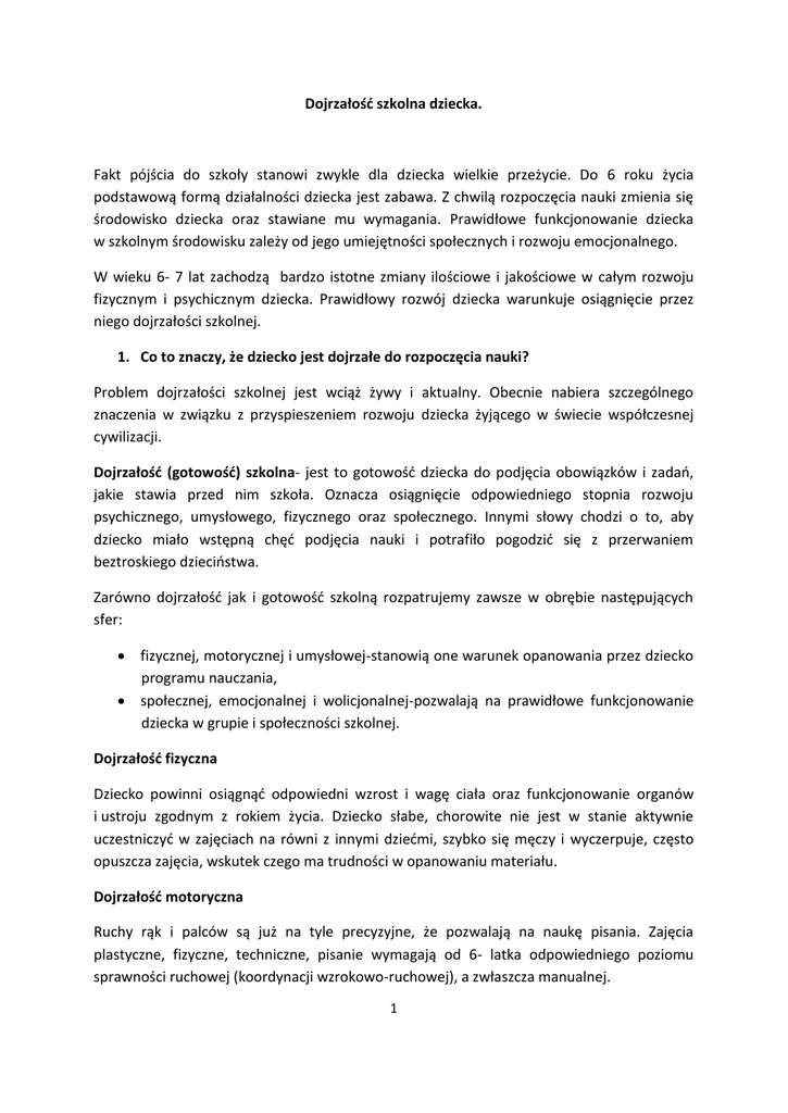 Dojrzałość szkolna dziecka. Fakt pójścia do szkoły stanowi zwykle dla dziecka wielkie przeżycie. Do 6 roku życia podstawową formą działalności dziecka jest zabawa. Z chwilą rozpoczęcia nauki zmienia się środowisko dziecka oraz stawiane mu wymagania. Prawidłowe funkcjonowanie dziecka w szkolnym środowisku zależy od jego umiejętności społecznych i rozwoju emocjonalnego. W wieku 6- 7 lat zachodzą bardzo istotne zmiany ilościowe i jakościowe w całym rozwoju fizycznym i psychicznym dziecka. Prawidłowy rozwój dziecka warunkuje osiągnięcie przez niego dojrzałości szkolnej. 1. Co to znaczy, że dziecko jest dojrzałe do rozpoczęcia nauki? Problem dojrzałości szkolnej jest wciąż żywy i aktualny. Obecnie nabiera szczególnego znaczenia w związku z przyspieszeniem rozwoju dziecka żyjącego w świecie współczesnej cywilizacji. Dojrzałość (gotowość) szkolna- jest to gotowość dziecka do podjęcia obowiązków i zadań, jakie stawia przed nim szkoła. Oznacza osiągnięcie odpowiedniego stopnia rozwoju psychicznego, umysłowego, fizycznego oraz społecznego. Innymi słowy chodzi o to, aby dziecko miało wstępną chęć podjęcia nauki i potrafiło pogodzić się z przerwaniem beztroskiego dzieciństwa. Zarówno dojrzałość jak i gotowość szkolną rozpatrujemy zawsze w obrębie następujących sfer: fizycznej, motorycznej i umysłowej-stanowią one warunek opanowania przez dziecko programu nauczania, społecznej, emocjonalnej i wolicjonalnej-pozwalają na prawidłowe funkcjonowanie dziecka w grupie i społeczności szkolnej. Dojrzałość fizyczna Dziecko powinni osiągnąć odpowiedni wzrost i wagę ciała oraz funkcjonowanie organów i ustroju zgodnym z rokiem życia. Dziecko słabe, chorowite nie jest w stanie aktywnie uczestniczyć w zajęciach na równi z innymi dziećmi, szybko się męczy i wyczerpuje, często opuszcza zajęcia, wskutek czego ma trudności w opanowaniu materiału. Dojrzałość motoryczna Ruchy rąk i palców są już na tyle precyzyjne, że pozwalają na naukę pisania. Zajęcia plastyczne, fizyczne, techniczne, pisanie wymagają od 6- latka odpowiedniego poziomu sprawności ruchowej (koordynacji wzrokowo-ruchowej), a zwłaszcza manualnej. 1 Dojrzałość umysłowa, to zespół wielu elementów: dobrze rozwinięte procesy spostrzegania, logicznego rozumowania, umiejętność swobodnego i poprawnego wypowiadania się, zdolność do koncentracji uwagi, zapamiętywania, przechodzenia z fazy myślenia abstrakcyjnego do fazy myślenia konkretno-obrazowopraktycznego. Dojrzałość społeczna Aby dziecko mogło uczestniczyć w zajęciach musi umieć włączyć się do zbiorowości i podporządkować panującym w niej prawom, umieć i chcieć współpracować z nauczycielem oraz grupą rówieśniczą. Musi być koleżeńskie, ale i asertywne, pomóc rozwiązać zaistniały konflikt. Dojrzałość emocjonalna Na zajęciach szkolnych i przerwach ma miejsce wiele wydarzeń, budzących u dzieci różnorodne reakcje emocjonalne. Dziecko dojrzałe emocjonalnie umie kontrolować swoje uczucia. Nie powinno złościć się i płakać z błahego powodu, ale poszukiwać sposobów rozwiązania danego problemu . Nie powinno rozpaczać i załamywać się przy każdym niepowodzeniu. Dzieci, które cechuje niedojrzałość emocjonalna mają trudności w ułożeniu swoich relacji z rówieśnikami i innymi osobami pracującymi w szkole, w wyniku czego źle się czują, nie lubią szkoły, niechętnie do niej uczęszczają. Dojrzałość wolicjonalna Dziecko dojrzałe musi być samodzielne, zaradne, mieć poczucie obowiązku i motywację (gotowość) do podejmowania zadań. Powinna je cechować wytrwałość w pracy, celowa działalność, inicjatywa i chęć doprowadzenia działań do końca. Najważniejsza u progu szkoły jest harmonia pomiędzy rozwojem fizycznym, intelektualnym i społeczno-emocjonalnym. Jej brak może spowodować, że rozwinięte umysłowo dziecko może np. nie uważać na lekcjach, nie przejawiać ambicji, nie umieć skupić się na wykonywanej czynności, nudzić się, nie kończyć pracy, mieć problemy z nawiązaniem koleżeńskich relacji z rówieśnikami, nie przestrzegać obowiązujących w klasie zasad. Niedojrzałość ta często mija, ale pierwsze niepowodzenia szkolne są dla dziecka i jego rodziny trudne i mogą rzutować na negatywny stosunek dziecka do szkoły. Jeśli rodzice i nauczyciele zapewnią dziecku odpowiednią pomoc i wsparcie stanie się ono dobrym uczniem, będzie chodziło do szkoły z przyjemnością i wyniesie z niej wiedzę i umiejętności. 2 2. Rodzice ważnym partnerem dla nauczyciela. W procesie wychowania i edukacji dzieci muszą aktywnie uczestniczyć rodzice. Aby tak się stało, powinna istnieć faktyczna i efektywna współpraca między nauczycielami i rodzicami. Rodzice najwięcej wiedzą o dziecku, ich informacje i doświadczenie sięgają wstecz. Rodzice mogą być dla nauczyciela źródłem wiedzy o aktualnych przeżyciach dziecka. Szkoła może wspomagać, współpracować, wzmacniać lub kompensować braki w opiece rodzicielskiej. Nie zastąpi jednak rodziców. Nauczyciel opiekuje się dzieckiem w szkole, dostarcza dziecku okazji do rozwijania umiejętności, przekazuje wiedzę, stwarza sytuacje wychowawcze. Prawdziwe partnerstwo nie jest łatwe, ale dla dobra dziecka rodzice i nauczyciele powinni zrobić wszystko, aby zbliżyć się do siebie i mieć dobre relacje. 3