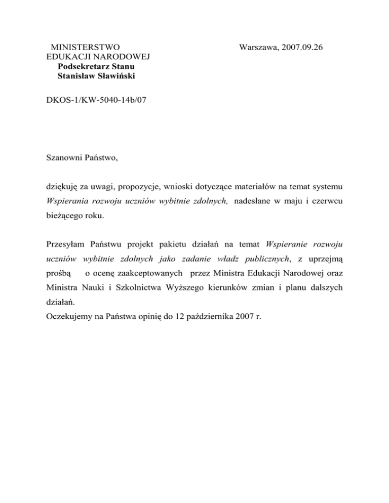 MINISTERSTWO EDUKACJI NARODOWEJ Podsekretarz Stanu Stanisław Sławiński Warszawa, 2007.09.26 DKOS-1/KW-5040-14b/07 Szanowni Państwo, dziękuję za uwagi, propozycje, wnioski dotyczące materiałów na temat systemu Wspierania rozwoju uczniów wybitnie zdolnych, nadesłane w maju i czerwcu bieżącego roku. Przesyłam Państwu projekt pakietu działań na temat Wspieranie rozwoju uczniów wybitnie zdolnych jako zadanie władz publicznych, z uprzejmą prośbą o ocenę zaakceptowanych przez Ministra Edukacji Narodowej oraz Ministra Nauki i Szkolnictwa Wyższego kierunków zmian i planu dalszych działań. Oczekujemy na Państwa opinię do 12 października 2007 r. MINISTERSTWO EDUKACJI NARODOWEJ MINISTERSTWO NAUKI I SZKOLNICTWA WYŻSZEGO Wspieranie rozwoju uczniów zdolnych jako zadanie władz publicznych. Wstępny projekt pakietu działań w ramach inicjatywy „Uczeń zdolny” wraz z 2 załącznikami Materiał do konsultacji WRZESIEŃ 2007 r. 1.Przesłanki Polski system oświatowy wypracował organizacyjnych i finansowych wiele rozwiązań prawnych, umożliwiających wychodzenie naprzeciw specjalnym potrzebom edukacyjnym dzieci o mniejszych możliwościach rozwojowych (dzieci chorych, dzieci z dysfunkcjami i zaburzeniami rozwojowymi, dzieci ze środowisk defaworyzowanych …). W polskim systemie brakuje natomiast infrastruktury prawnej, organizacyjnej i finansowej, która umożliwiłaby otoczenie właściwą opieką edukacyjną uczniów wybitnie zdolnych. W pewnym zakresie lukę tę wypełniają inicjatywy organizacji pozarządowych oraz osób indywidualnych, jednakże nawet te działania nie otrzymują ze strony władz publicznych wsparcia w takim zakresie i wymiarze, na jaki te działania zasługują. Biorąc pod uwagę dynamikę i kierunek współczesnych przemian cywilizacyjnych polska polityka oświatowa musi zagadnienie promocji rozwoju utalentowanych uczniów postawić w centrum uwagi. Niezbędne jest szybkie wprowadzenie zmian legislacyjnych i organizacyjno-finansowych, które pozwolą na wyszukiwanie utalentowanej młodzieży a następnie roztoczenie nad nimi właściwej opieki edukacyjnej. 2 2. Dotychczasowe działania przygotowawcze Od początku 2006 roku zamiar podjęcia inicjatywy w zakresie wzmocnienia instrumentów wspierania rozwoju uczniów wybitnie zdolnych oraz korekty polityki oświatowej w tym zakresie, był przedmiotem nieformalnych dyskusji w wielu środowiskach , w szczególności w kręgach osób angażujących się w tego typu przedsięwzięcia (olimpiady, konkursy przedmiotowe, Krajowy Fundusz na rzecz Dzieci…itp.) W końcu kwietnia, a następnie w końcu maja 2007 roku, rozesłano do różnych instytucji i osób indywidualnych ( łącznie ok.180 adresów ) materiał do dyskusji z prośbą o wyrażenie opinii na różne tematy dotyczące wspierania uczniów uzdolnionych. (załącznik nr 1). Napływające opinie analizowano na bieżąco. Ogólna charakterystyka zebranych opinii została przedstawiona w notatce (załącznik nr 2). Na tej podstawie zostały opracowane kierunki zmian przyjęte 6 września 2007 r. przez Ministra Edukacji Narodowej. Zaproponowane kierunki zmian zaakceptował również Minister Nauki i Szkolnictwa Wyższego. 3 3. Plan dalszych działań: 1. Przygotowanie tekstu „Pakietu…”, z uwzględnieniem wniosków wynikających z konsultacji z przedstawicielami wyżej wym. środowisk , - termin: początek października 2007. 2.. Opracowanie projektów odpowiednich nowelizacji ustaw, zwłaszcza: ustawy prawo o szkolnictwie wyższym, ustawy o systemie oświaty, ustawy KN oraz projektów odpowiednich nowelizacji rozporządzeń, - termin: październik 2007. 3. Przygotowanie projektów odpowiednich zmian w systemie finansowania zadań oświatowych i szkolnictwa wyższego oraz odpowiednich zapisów w ustawie budżetowej, - termin: październik 2007. 4. Skierowanie projektów aktów prawnych na ścieżkę legislacyjną, - termin: listopad 2007. 4 4. Proponowane kierunki zmian Efektywna zmiana polityki oświatowej w zakresie wspierania rozwoju uczniów szczególnie zdolnych wymaga kompleksowych zmian legislacyjnych . Zmiany te powinny umożliwić: 1. angażowanie pracowników naukowych wyższych uczelni oraz innych instytucji naukowych do prowadzenia zajęć edukacyjnych z młodzieżą szkolną, zarówno w systemie klasowo-lekcyjnym jak i w ramach systemu zajęć fakultatywnych, organizowanych poza systemem klasowo-lekcyjnym, w tym również organizowanych poza szkołą; 2. uczestniczenie młodzieży bardziej zaawansowanej w poszczególnych dziedzinach wiedzy w zajęciach organizowanych z myślą o niej przez wyższe uczelnie oraz inne instytucje naukowe, w tym również uczestnictwo odpowiednio przygotowanych uczniów w niektórych programach badawczych prowadzonych w tych instytucjach; 3. wzmocnienie finansowe oraz modernizację i uelastycznienie strony organizacyjnej olimpiad i konkursów przedmiotowych, a także wprowadzanie do oferty oświatowej nowych inicjatyw w tym zakresie; 4. stworzenie stabilnych podstaw finansowych dla działalności Krajowego Funduszu na rzecz Dzieci w zakresie opieki nad uzdolnionymi dziećmi i młodzieżą 5 5. stworzenie stabilnych podstaw finansowych dla działalności Gimnazjum i Liceum Akademickiego w Toruniu; 6. stworzenie mechanizmów płacowych, umożliwiających wynagradzanie nauczycieli, uzdolnionymi, którzy w opiekują tym się uczniami szczególnie uczniami zdolnymi realizującymi indywidualny tok lub program nauki (analogia do indywidualnego nauczania dzieci niepełnosprawnych); 7. wprowadzenie problematyki pracy z uczniem zdolnym do programów kształcenia, psychologów dokształcania i doskonalenia nauczycieli oraz i pedagogów szkolnych; 8. prawne usankcjonowanie możliwości realizowania programu IB (matury międzynarodowej) w polskim systemie oświaty; 9. dostosowanie zasad oceniania, klasyfikowania i promowania uczniów do szczególnych potrzeb uczniów wybitnie zdolnych; 10. zracjonalizowanie s