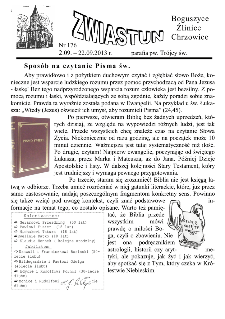 o Boguszyce Źlinice Chrzowice Nr 176 2.09. – 22.09.2013 r. parafia pw. Trójcy św. S p os ó b n a c z y t a n i e P i s ma ś w . Aby prawidłowo i z pożytkiem duchowym czytać i zgłębiać słowo Boże, konieczne jest wsparcie ludzkiego rozumu przez pomoc przychodzącą od Pana Jezusa - łaskę! Bez tego nadprzyrodzonego wsparcia rozum człowieka jest bezsilny. Z pomocą rozumu i łaski, współdziałających ze sobą zgodnie, każdy poradzi sobie znakomicie. Prawda ta wyraźnie została podana w Ewangelii. Na przykład u św. Łukasza: „Wtedy (Jezus) oświecił ich umysł, aby rozumieli Pisma” (24,45). Po pierwsze, otwieram Biblię bez żadnych uprzedzeń, których dzisiaj, ze względu na wypowiedzi różnych ludzi, jest tak wiele. Przede wszystkich chcę znaleźć czas na czytanie Słowa Życia. Niekoniecznie od razu godzinę, ale na początek może 10 minut dziennie. Ważniejsza jest tutaj systematyczność niż ilość. Po drugie, czytam! Najpierw ewangelie, poczynając od świętego Łukasza, przez Marka i Mateusza, aż do Jana. Później Dzieje Apostolskie i listy. W dalszej kolejności Stary Testament, który jest trudniejszy i wymaga pewnego przygotowania. Po trzecie, staram się zrozumieć! Biblia nie jest księgą łatwą w odbiorze. Trzeba umieć rozróżniać w niej gatunki literackie, które, już przez samo zastosowanie, nadają poszczególnym fragmentom konkretny sens. Powinno się także wziąć pod uwagę kontekst, czyli znać podstawowe informacje na temat tego, co zostało opisane. Warto też pamiętać, że Biblia przede Solenizantom: wszystkim mówi Gerardowi Przezdzing (50 lat) Pawłowi Fister (18 lat) prawdę o miłości Bo Michałowi Tatura (18 lat) Ewelinie Datko (18 lat) ga, czyli o zbawieniu. Nie Klaudia Hennek ( kolejne urodziny) jest ona podręcznikiem Jubilatom: astrologii, historii czy arytme Urszuli i Franciszkowi Borinski (50lecie ślubu) tyki, ale pokazuje, jak żyć i jak wierzyć, Hildegardzie i Pawłowi Odelga aby spotkać się z Tym, który czeka w Kró(45lecie ślubu) lestwie Niebieskim. Edycie i Rudolfowi Fornol (30-lecie ślubu) Monice i Rudolfowi Wicher (25-lecie ślubu) PORZĄDEK NABOŻEŃSTW 2.09. – 18.09.2013 r. Poniedziałek – 2.09.2013 r. 18.00 - W int. młodzieży naszej parafii rozpoczynającej nowy rok szkolny. Wtorek – 3.09.2013 r. 18.00 - Za †† męża i ojca Alojzego Francus, rodz. Annę i Wiktora Francus, Martę i Stanisława Piechaczek, braci oraz Za †† rodz. Elżbietę, Annę i Wincentego Piechaczek, ich dzieci Marię Syga i dusze opuszczone. Środa – 4.09.2013 r. 7.30 - 1. W int. dzieci naszej parafii rozpoczynającej nowy rok szkolny. 2. Do MB Fatimskiej w int. Gerarda Przezdzing z okazji 50-tych urodzin. Czwartek – 5.09.2013 r. - I czwartek miesiąca 17.30 - Adoracja Najśw. Sakramentu 18.00 - Za †† córkę Adrianę Kasperek, rodz. Agnieszkę i Karola Matuszek, rodz. Agnieszkę i Pawła Kasperek, braci i całe pokrew. Matuszek, Kasperek. Piątek – 6.09.2013 r. - I piątek miesiąca 7.00 - W int. Czcicieli Najświętszego Serca Pana Jezusa. 18.00 - 1. Za †† Katarzynę i Pawła Kutz, Cecylię, Józefa i Barbarę Lazik, ks. Franciszka ………. I dusze opuszczone. 2. Za †† z rodzin Margos, Niepalla, Malosek i dusze w czyścu cierpiące. Sobota – 7.09.2013 r. - I sobota miesiąca 7.00 - Za †† męża i ojca Pawła Klimek, rodziców Klimek, rodziców Sowada, brata Józefa, siostrę Franciszkę, szwagrów, siostrzeńca i całe pokrew. 18.00 - Do Bożej Opatrzności w int. Klaudii Henek z okazji kolejnych urodzin oraz za †† dziadków Erykę i Rudolfa Wala. Niedziela – 8.09.2013 r. - (Zbiórka do puszek na Wydział Teologiczny) 8.00 - Do Bożej Opatrzności w int. rodziny Adriana Chudala. 10.00 - Do Bożej Opatrzności w int. Henryka Baron. -----------------------------------------------------------Proszę o posprzątanie kościoła rodziny: Margos Jan, Urbacka Piotr, Wójcik Norbert, Kuc Zygfryd. PORZĄDEK NABOŻEŃSTW 9.09. – 15.09.2013 r. Poniedziałek – 9.09.2013 r. 18.00 - Do Bożej Opatrzności i MB Nieust. Pomocy w int. rodz. Alfreda Wójcik oraz za †† rodz. Wójcik i ojca Waltra Cuda. Wtorek – 10.09.2013 r. 18.00 - Do Bożej Opatrzności w int. rodziny Lazik oraz za †† ojców Alojzego Kasperek i Edwarda Lazik. Środa – 11.09.2013 r. 7.30 - Do Bożej Opatrzności w int. rodz. Sebastiana Datko oraz za †† ojca Jana Mateja. Czwartek – 12.09.2013 r. 18.00 - 1. Do Bożej Opatrzności w int. Edyty i Rudolfa Fornol z okazji 30-lecia małżeństwa oraz za †† ojców Huberta Urbacka, Jerzego Fornol, dziadków i dusze opuszczone. 2. Do Bożej Opatrzności w int. rodz. Macieja Dudek i Elżbiety Cieślikiewicz. Piątek – 13.09.2013 r. 7.00 - Za †† Stefana Kiełbasa, rodziców z obu stron i całe pokrew. Sobota –14.09.2013 r. - święto Podwyższenia Krzyża św. 7.00 - 1. Za †† rodz. Zofię i Wiktora Broj, szwagra Stefana, pokrew. Broj i Lissy. 2. Do Bożej Opatrzności w int. rodz. Adriana i Marii Broj oraz za †† matkę Elfrydę Broj. 18.00 - Do Bożej Opatrzności w int. Pawła Fister i Michała Tatura z okazji 18-tych urodzin. Niedziela – 15.09.2013 r. - (Kolekta na budowę kościołów i jałmużna postna z całego roku) 8.00 - Do Bożej Opatrzności w int. rodziny Bernarda Piechaczek. 10.00 - Dwujęzyczna. Do Bożej Opatrzności w int. Moniki i Rudolfa Wicher z okazji 25-lecia małżeństwa i za całą żyjącą rodzinę. -----------------------------------------------------------W dniach 12-15 września na Górze św. Anny Święto Podwyższenia Krzyża Świętego z obchodami kalwaryjskimi. Proszę o posprzątanie kościoła rodziny: Wiercimok Jan, Pawleta Andrzej, Kimmel Konrad, Tyrcha Józef. PORZĄDEK NABOŻEŃSTW 16.09. –22.09.2013 r. Poniedziałek – 16.09.2013 r. 18.00 - Do Bożej Opatrzności w int. rodz. Waltra Hennek oraz za †† matkę Martinę Hennek, ojca Wiktora Kowol i całe pokrew. Hennek i Kowol. Wtorek – 17.09.2013 r
