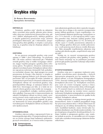 Grzybica stóp KWAS FOLIOWY SK£ADNIK AKTYWNY KOSMETYKÓW Nr 10/2007 Dr Bo¿ena Bierzniewska Specjalista dermatolog DEFINICJA Terminem „grzybica stóp” określa się zakażenie skóry wywołane przez grzyby, głównie przez dermatofity, dotyczące podeszwowej powierzchni stóp, palców i fałdów międzypalcowych. Infekcja grzybicza w obrębie grzbietowej powierzchni stopy, zarówno przebiegiem klinicznym, jak i rokowaniem, przypomina grzybicę skóry gładkiej, w związku z czym przyjmuje się, że grzybica stóp nie obejmuje zakażeń o tej lokalizacji. HISTORIA Po raz pierwszy przypadek grzybicy stóp został opisany w 1888 r. przez Pelizzariego. Na przełomie XIX i XX wieku zarówno Sabouraud jak i Whitfield uważali grzybicę stóp za rzadko występujące zakażenie, mające wspólne patogeny z grzybicą skóry owłosionej głowy. Początkowo obszarem endemicznym zakażeń wywołanych przez Trichophyton rubrum (obecnie najczęściej izolowany dermatofit) były południowo-wschodnie obszary Azji, skąd patogen ten został przeniesiony do Europy i obu Ameryk, w związku ze zwiększoną migracją ludności tych obszarów świata, pod koniec XIX i na początku XX wieku. Jednakże na wymienionych pierwotnych obszarach endemicznych Trichophyton rubrum nie wywoływał grzybicy stóp, prawdopodobnie dlatego, że tamtejsza ludność chodziła boso. Interesujący jest fakt, że u ludzi nie noszących obuwia grzybica stóp zwykle nie występuje – nawet w przypadkach rozległej, nasilonej grzybicy skóry gładkiej. Znaczącą rolę w rozprzestrzenianiu się zakażeń Trichophyton rubrum na świecie miały z pewnością również ruchy wojsk podczas I Wojny Światowej. Właśnie po jej zakończeniu pojawiły się pierwsze doniesienia na temat przypadków grzybicy stóp wywołanej przez Trichophyton rubrum na obszarze Stanów Zjednoczonych. EPIDEMIOLOGIA Grzybica stóp jest jedną z najczęstszych form zakażenia grzybiczego skóry. W przeprowadzonych ostatnio na terenie naszego kraju badaniach epidemiologicznych stwierdzono, że co trzecia osoba z rozpozna- Farmaceutyczny Przegl¹d Naukowy nym zakażeniem grzybiczym skóry i paznokci ma grzybicę stóp. Jest to druga co do częstości występowania postać infekcji grzybiczej. Często współistnieje z innymi formami zakażenia grzybiczego (stwierdzono to aż u 75 % chorych), w tym najczęściej (69%) z grzybicą paznokci stóp. Znacznie rzadziej grzybica stóp współistnieje z grzybicą dłoni (2,5 %), do której dochodzi często w wyniku przeniesienia zakażenia ze stóp. Dlatego grzybica dłoni jest zwykle jednostronna i u osób praworęcznych dotyczy zwykle dłoni prawej. Takie przypadki współistnienia zakażenia stóp i jednej ręki określa się jako „zespół dwóch stóp i jednej ręki”. Wydaje się, że częstość występowania grzybicy stóp, podobnie jak grzybicy skóry gładkiej, w ostatnich latach utrzymuje się na podobnym poziomie, podczas gdy grzybica paznokci wykazuje stałą tendencję wzrostową. ETIOPATOGENEZA Grzybica stóp jest w ogromnej większości przypadków wywoływana przez dermatofity, z których najczęstszym patogenem jest bez wątpienia Trichophyton rubrum, a za nim Trichophyton mentagrophytes (33%). Znacznie rzadziej grzybicę stóp wywołują Epidermophyton floccosum czy Trichophyton tonsurans, przy czym ten ostatni występuje częściej u dzieci, u których atakuje równocześnie skórę owłosioną głowy. W ostatnich latach na niektórych obszarach naszego kraju obserwuje się wyraźny wzrost częstości izolowania Trichophyton mentagrophytes ze zmian skóry i jej przydatków, w przeciwieństwie do spadku liczby zakażeń Trichophyton rubrum. Należy wspomnieć, że istnieją również grzyby niedermatofitowe, które w rzadkich przypadkach mogą być przyczyną zakażeń skóry o obrazie klinicznym nie różniącym się od infekcji dermatofitowej. Należą do nich: Scytalidium hyalinum, znany również jako Scytalidium dimidiatum oraz Hendersonula toruloidea. Nie jest dotąd jasna rola grzybów drożdżopodobnych z rodzaju Candida w patogenezie grzybicy stóp, wiadomo jednak na pewno, że nierzadkie jest ich występowanie jako czynnika towarzyszącego zakażeniu dermatofitowemu. Grzybica stóp Dermatofity zasiedlają najczęściej martwe, zrogowaciałe warstwy skóry i nie przedostają się poza granicę naskórka czy przydatków skóry. Główną rolę w ograniczaniu ekspansji grzybów odgrywa odpowiedź typu komórkowego, ale oprócz niej organizm człowieka broni się również poprzez niespecyficzne mechanizmy obronne, do których należy m.in. aktywacja układu dopełniacza i działanie leukocytów wielojądrzastych. Trichophyton mentagrophytes wywołuje najczęściej zmiany skórne o wyraźnie zapalnym charakterze, podczas gdy Trichophyton rubrum powoduje głównie przewlekłe, suche i złuszczające zmiany. Poszczególne patogeny różnią się też zdolnością przeżywania poza organizmem gospodarza. I tak Trichophyton rubrum ma znacznie mniejszą zdolność przetrwania w środowisku zewnętrznym niż Epidermophyton floccosum, który produkuje odporne na działanie czynników zewnętrznych artrokonidia, przez wiele lat zachowujące zdolność zakażania. OBRAZ KLINICZNY Wyróżnia się trzy główne odmiany grzybicy stóp: międzypalcową, potnicową oraz złuszczającą. Niektórzy autorzy wyodrębniają również jeszcze jedną postać, zwaną wrzodziejącą. Grzybica stóp międzypalcowa (tinea pedum interdigitale) Jest najczęstszą postacią grzybicy stóp. Zmiany lokalizują się w przestrzeniach międzypalcowych stóp (najczęściej III i IV przestrzeń), gdzie grzyby znajdują znakomite warunki bytowania, w związku z dużą wilgotnością oraz podwyższoną temperaturą. Klinicznie dominuje złuszczanie, maceracja naskórka i pęknięcia. Pod zmacerowanym naskórkiem widoczne są ogniska rumieniowe. Powierzchnia zmian jest często wilgotna, o kolorze biało-szarawym. Zdarza si