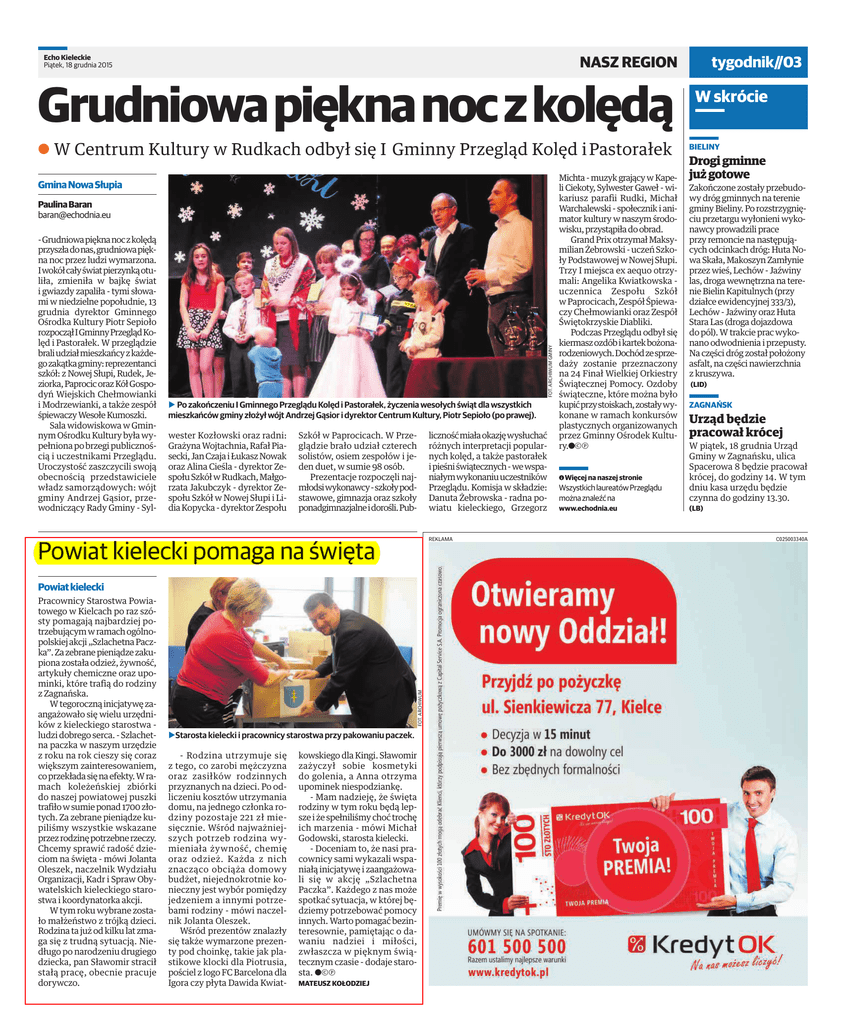 Echo Kieleckie Piątek, 18 grudnia 2015 NASZ REGION Grudniowa piękna noc z kolędą A W Centrum Kultury w Rudkach odbył się I Gminny Przegląd Kolęd i Pastorałek Gmina Nowa Słupia - Grudniowa piękna noc z kolędą przyszła do nas, grudniowa piękna noc przez ludzi wymarzona. I wokół cały świat pierzynką otuliła, zmieniła w bajkę świat i gwiazdy zapaliła - tymi słowami w niedzielne popołudnie, 13 grudnia dyrektor Gminnego Ośrodka Kultury Piotr Sepioło rozpoczął I Gminny Przegląd Kolęd i Pastorałek. W przeglądzie brali udział mieszkańcy z każdego zakątka gminy: reprezentanci szkół: z Nowej Słupi, Rudek, Jeziorka, Paprocic oraz Kół Gospodyń Wiejskich Chełmowianki i Modrzewianki, a także zespół śpiewaczy Wesołe Kumoszki. Sala widowiskowa w Gminnym Ośrodku Kultury była wypełniona po brzegi publicznością i uczestnikami Przeglądu. Uroczystość zaszczycili swoją obecnością przedstawiciele władz samorządowych: wójt gminy Andrzej Gąsior, przewodniczący Rady Gminy - Syl- FOT. ARCHIWUM GMINY Paulina Baran [email protected] b Po zakończeniu I Gminnego Przeglądu Kolęd i Pastorałek, życzenia wesołych świąt dla wszystkich mieszkańców gminy złożył wójt Andrzej Gąsior i dyrektor Centrum Kultury, Piotr Sepioło (po prawej). wester Kozłowski oraz radni: Grażyna Wojtachnia, Rafał Piasecki, Jan Czaja i Łukasz Nowak oraz Alina Cieśla - dyrektor Zespołu Szkół w Rudkach, Małgorzata Jakubczyk - dyrektor Zespołu Szkół w Nowej Słupi i Lidia Kopycka - dyrektor Zespołu Szkół w Paprocicach. W Przeglądzie brało udział czterech solistów, osiem zespołów i jeden duet, w sumie 98 osób. Prezentacje rozpoczęli najmłodsi wykonawcy - szkoły podstawowe, gimnazja oraz szkoły ponadgimnazjalne i dorośli. Pub- liczność miała okazję wysłuchać różnych interpretacji popularnych kolęd, a także pastorałek i pieśni świątecznych - we wspaniałym wykonaniu uczestników Przeglądu. Komisja w składzie: Danuta Żebrowska - radna powiatu kieleckiego, Grzegorz REKLAMA Powiat kielecki pomaga na święta Pracownicy Starostwa Powiatowego w Kielcach po raz szósty pomagają najbardziej potrzebującym w ramach ogólnopolskiej akcji „Szlachetna Paczka”. Za zebrane pieniądze zakupiona została odzież, żywność, artykuły chemiczne oraz upominki, które trafią do rodziny z Zagnańska. W tegoroczną inicjatywę zaangażowało się wielu urzędników z kieleckiego starostwa ludzi dobrego serca. - Szlachetna paczka w naszym urzędzie z roku na rok cieszy się coraz większym zainteresowaniem, co przekłada się na efekty. W ramach koleżeńskiej zbiórki do naszej powiatowej puszki trafiło w sumie ponad 1700 złotych. Za zebrane pieniądze kupiliśmy wszystkie wskazane przez rodzinę potrzebne rzeczy. Chcemy sprawić radość dzieciom na święta - mówi Jolanta Oleszek, naczelnik Wydziału Organizacji, Kadr i Spraw Obywatelskich kieleckiego starostwa i koordynatorka akcji. W tym roku wybrane zostało małżeństwo z trójką dzieci. Rodzina ta już od kilku lat zmaga się z trudną sytuacją. Niedługo po narodzeniu drugiego dziecka, pan Sławomir stracił stałą pracę, obecnie pracuje dorywczo. FOT. ARCHIWUM Powiat kielecki bStarosta kielecki i pracownicy starostwa przy pakowaniu paczek. - Rodzina utrzymuje się z tego, co zarobi mężczyzna oraz zasiłków rodzinnych przyznanych na dzieci. Po odliczeniu kosztów utrzymania domu, na jednego członka rodziny pozostaje 221 zł miesięcznie. Wśród najważniejszych potrzeb rodzina wymieniała żywność, chemię oraz odzież. Każda z nich znacząco obciąża domowy budżet, niejednokrotnie konieczny jest wybór pomiędzy jedzeniem a innymi potrzebami rodziny - mówi naczelnik Jolanta Oleszek. Wśród prezentów znalazły się także wymarzone prezenty pod choinkę, takie jak plastikowe klocki dla Piotrusia, pościel z logo FC Barcelona dla Igora czy płyta Dawida Kwiat- kowskiego dla Kingi. Sławomir zażyczył sobie kosmetyki do golenia, a Anna otrzyma upominek niespodziankę. - Mam nadzieję, że święta rodziny w tym roku będą lepsze i że spełniliśmy choć trochę ich marzenia - mówi Michał Godowski, starosta kielecki. - Doceniam to, że nasi pracownicy sami wykazali wspaniałą inicjatywę i zaangażowali się w akcję „Szlachetna Paczka”. Każdego z nas może spotkać sytuacja, w której będziemy potrzebować pomocy innych. Warto pomagać bezinteresownie, pamiętając o dawaniu nadziei i miłości, zwłaszcza w pięknym świątecznym czasie - dodaje starosta. aą MATEUSZ KOŁODZIEJ Michta - muzyk grający w Kapeli Ciekoty, Sylwester Gaweł - wikariusz parafii Rudki, Michał Warchalewski - społecznik i animator kultury w naszym środowisku, przystąpiła do obrad. Grand Prix otrzymał Maksymilian Żebrowski - uczeń Szkoły Podstawowej w Nowej Słupi. Trzy I miejsca ex aequo otrzymali: Angelika Kwiatkowska uczennica Zespołu Szkół w Paprocicach, Zespół Śpiewaczy Chełmowianki oraz Zespół Świętokrzyskie Diabliki. Podczas Przeglądu odbył się kiermasz ozdób i kartek bożonarodzeniowych. Dochód ze sprzedaży zostanie przeznaczony na 24 Finał Wielkiej Orkiestry Świątecznej Pomocy. Ozdoby świąteczne, które można było kupić przy stoiskach, zostały wykonane w ramach konkursów plastycznych organizowanych przez Gminny Ośrodek Kultury.aą tygodnik//03 W skrócie BIELINY Drogi gminne już gotowe Zakończone zostały przebudowy dróg gminnych na terenie gminy Bieliny. Po rozstrzygnięciu przetargu wyłonieni wykonawcy prowadzili prace przy remoncie na następujących odcinkach dróg: Huta Nowa Skała, Makoszyn Zamłynie przez wieś, Lechów - Jaźwiny las, droga wewnętrzna na terenie Bielin Kapitulnych (przy działce ewidencyjnej 333/3), Lechów - Jaźwiny oraz Huta Stara Las (droga dojazdowa do pól). W trakcie prac wykonano odwodnienia i przepusty. Na części dróg został położony asfalt, na części nawierzchnia z kruszywa. (LID) ZAGNAŃSK