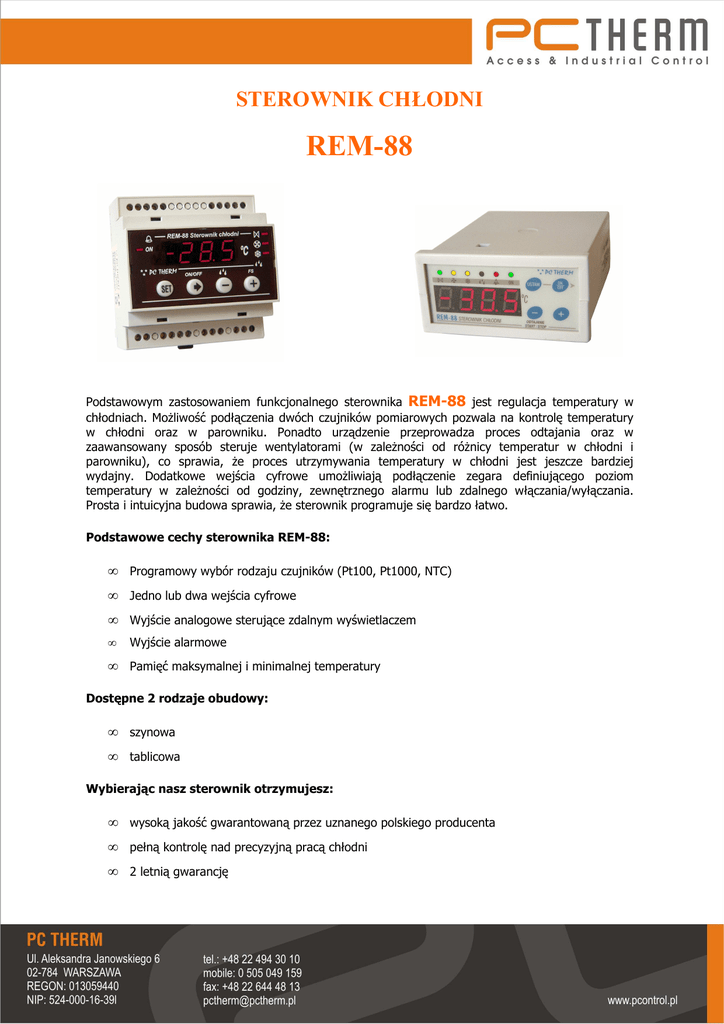 STEROWNIK CHŁODNI REM-88 Podstawowym zastosowaniem funkcjonalnego sterownika REM-88 jest regulacja temperatury w chłodniach. Możliwość podłączenia dwóch czujników pomiarowych pozwala na kontrolę temperatury w chłodni oraz w parowniku. Ponadto urządzenie przeprowadza proces odtajania oraz w zaawansowany sposób steruje wentylatorami (w zależności od różnicy temperatur w chłodni i parowniku), co sprawia, że proces utrzymywania temperatury w chłodni jest jeszcze bardziej wydajny. Dodatkowe wejścia cyfrowe umożliwiają podłączenie zegara definiującego poziom temperatury w zależności od godziny, zewnętrznego alarmu lub zdalnego włączania/wyłączania. Prosta i intuicyjna budowa sprawia, że sterownik programuje się bardzo łatwo. Podstawowe cechy sterownika REM-88: • Programowy wybór rodzaju czujników (Pt100, Pt1000, NTC) • Jedno lub dwa wejścia cyfrowe • Wyjście analogowe sterujące zdalnym wyświetlaczem • Wyjście alarmowe • Pamięć maksymalnej i minimalnej temperatury Dostępne 2 rodzaje obudowy: • szynowa • tablicowa Wybierając nasz sterownik otrzymujesz: • wysoką jakość gwarantowaną przez uznanego polskiego producenta • pełną kontrolę nad precyzyjną pracą chłodni • 2 letnią gwarancję