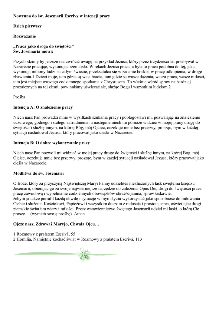 Nowenna do św. Josemarii Escrivy w intencji pracy Dzień pierwszy Rozważanie „Praca jako droga do świętości” Św. Josemaria mówi: Przychodzimy by jeszcze raz zwrócić uwagę na przykład Jezusa, który przez trzydzieści lat przebywał w Nazarecie pracując, wykonując rzemiosło. W rękach Jezusa praca, a była to praca podobna do tej, jaką wykonują miliony ludzi na całym świecie, przekształca się w zadanie boskie, w pracę odkupienia, w drogę zbawienia.1 Dzieci moje, tam gdzie są wasi bracia, tam gdzie są wasze dążenia, wasza praca, wasze miłości, tam jest miejsce waszego codziennego spotkania z Chrystusem. To właśnie wśród spraw najbardziej prozaicznych na tej ziemi, powinniśmy uświęcać się, służąc Bogu i wszystkim ludziom.2 Prośba Intencja A: O znalezienie pracy Niech nasz Pan prowadzi mnie w wysiłkach szukania pracy i pobłogosławi mi, pozwalając na znalezienie uczciwego, godnego i stałego zatrudnienia; a następnie niech mi pomoże widzieć w mojej pracy drogę do świętości i służbę innym, na której Bóg, mój Ojciec, oczekuje mnie bez przerwy, prosząc, bym w każdej sytuacji naśladował Jezusa, który pracował jako cieśla w Nazarecie. Intencja B: O dobre wykonywanie pracy Niech nasz Pan pozwoli mi widzieć w mojej pracy drogę do świętości i służbę innym, na której Bóg, mój Ojciec, oczekuje mnie bez przerwy, prosząc, bym w każdej sytuacji naśladował Jezusa, który pracował jako cieśla w Nazarecie. Modlitwa do św. Josemarii O Boże, który za przyczyną Najświętszej Maryi Panny udzieliłeś niezliczonych łask świętemu księdzu Josemarii, obierając go za swoje najwierniejsze narzędzie do założenia Opus Dei, drogi do świętości przez pracę zawodową i wypełnianie codziennych obowiązków chrześcijanina, spraw łaskawie, żebym ja także potrafił każdą chwilę i sytuację w mym życiu wykorzystać jako sposobność do miłowania Ciebie i służenia Kościołowi, Papieżowi i wszystkim duszom z radością i prostotą serca, oświetlając drogi ziemskie światłem wiary i miłości. Przez wstawiennictwo świętego Josemarii udziel mi łaski, o którą Cię proszę… (wymień swoją prośbę). Amen. Ojcze nasz, Zdrowaś Maryjo, Chwała Ojcu… 1 Rozmowy z prałatem Escrivá, 55 2 Homilia, Namiętnie kochać świat w Rozmowy z prałatem Escrivá, 113 Dzień drugi Rozważanie „Praca wykonywana z miłości do Boga” Św. Josemaria mówi: Godność pracy oparta jest na Miłości. Wielkim przywilejem człowieka jest możliwość miłowania, dzięki której wychodzi on poza to, co ulotne i przemijające.3 Czyńcie wszystko z Miłości. – Wówczas nie ma małych rzeczy: wszystko jest wielkie. -Wytrwałość w rzeczach małych z Miłości to heroiczność.4 Podkreślam: w prostocie twojej zwyczajnej pracy, w monotonnych szczegółach każdego dnia winieneś odkryć tajemnicę wielkości i nowości, która dla tak wielu jest ukryta: Miłość.5 Prośba Intencja A: O znalezienie pracy Niech nasz Pan udzieli mi łaski szybkiego zdobycia pracy, która zapewni bezpieczeństwo mojej rodzinie. Równocześnie niech pomoże mi zrozumieć, że tym, co nadaje wartości każdej uczciwej pracy jest miłość, z jaką ją wykonuję: miłość do Boga na pierwszym miejscu, któremu mogę ofiarować swoją pracę; i miłość do mojego bliźniego, któremu chcę służyć i być pomocnym. Intencja B: O dobre wykonywanie pracy Niech nasz Pan pomoże mi zrozumieć, że tym, co nadaje wartości każdej uczciwej pracy jest miłość, z jaką ją wykonuję: miłość do Boga na pierwszym miejscu, któremu mogę ofiarować swoją pracę; i miłość do mojego bliźniego, któremu chcę służyć i być pomocnym. Modlitwa do św. Josemarii O Boże, który za przyczyną Najświętszej Maryi Panny udzieliłeś niezliczonych łask świętemu księdzu Josemarii, obierając go za swoje najwierniejsze narzędzie do założenia Opus Dei, drogi do świętości przez pracę zawodową i wypełnianie codziennych obowiązków chrześcijanina, spraw łaskawie, żebym ja także potrafił każdą chwilę i sytuację w mym życiu wykorzystać jako sposobność do miłowania Ciebie i służenia Kościołowi, Papieżowi i wszystkim duszom z radością i prostotą serca, oświetlając drogi ziemskie światłem wiary i miłości. Przez wstawiennictwo świętego Josemarii udziel mi łaski, o którą Cię proszę… (wymień swoją prośbę). Amen. Ojcze nasz, Zdrowaś Maryjo, Chwała Ojcu… 3 To Chrystus przechodzi, 48 4 Droga, 813 5 Bruzda, 489 Dzień trzeci Rozważanie „Uporządkowana i stała praca” Św. Josemaria mówi: Jakże krótko trwa nasza droga na ziemi! Dla prawdziwego chrześcijanina słowa te stanowią wyrzut, że tak często brak mu wielkoduszności, ale są też ustawicznym wezwaniem do wierności. Tak, rzeczywiście krotki jest czas, w którym możemy kochać, dawać siebie, pokutować. Dlatego byłoby rzeczą niewłaściwą, gdybyśmy ten czas marnotrawili i tak wielki skarb nieodpowiedzialnie wrzucali w błoto. Nie możemy zmarnować tego momentu historii świata, który Bóg powierza każdemu z nas.6 Gdy zachowasz ład, pomnoży się twój czas i dlatego będziesz mógł oddać większą chwałę Bogu pracując gorliwiej w Jego służbie.7 Wypełniaj dokładnie obowiązki chwili obecnej. — Ta praca — skromna, monotonna, niewielka — jest modlitwą wyrażoną w czynach, która przysposabia cię do łaski innej pracy — wielkiej, szerokiej i głębokiej — o której marzysz.8 Prośba Intencja A: O znalezienie pracy Niech z pomocą Najświętszej Maryi Panny znajdę stałą i odpowiednią pracę. Gdy zaś będę pracował, niech dzięki Bożej dobroci nauczę się traktować swój czas jako skarb i niech wzrastam w cnocie porządku, tak by wykonywać swoje obowiązki bardziej punktualnie, intensywniej i bez ustanku, unikając bałaganu i opóźnień. Niech osiągnę to poprzez kierowanie się dobrze przygotowanym planem,