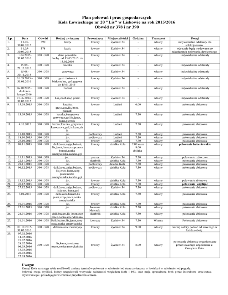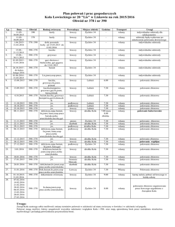 Plan polowań i prac gospodarczych Koła Łowieckiego nr 20 "Lis" w Liskowie na rok 2015/2016 Obwód nr 378 i nr 390 Lp. 1. 2. 3. Data 11.0530.09.2015 11.0530.09.2015 1.04.201531.03.2016 Obwód 390 Rodzaj zwierzyny kozły Prowadzący łowczy Miejsce zbiórki Żychów 34 Godzina - Transport własny 378 kozły łowczy Żychów 34 - własny 378 i 390 łowczy Żychów 34 - własny Uwagi indywidualne odstrzały dla selekcjonerów odstrzały będą wydawane po zakończeniu polowania dewizowego indywidualne odstrzały łowczy Żychów 34 - własny indywidualne odstrzały 15.08.21.12.2015 15.08.30.11.2015 01.09.2015 – 31.01.2016 390 i 378 dziki pozostałe lochy od 15.05.2015 do 15.02.2016 kaczka 390 i 378 grzywacz łowczy Żychów 34 - własny indywidualne odstrzały 390 i 378 łowczy Żychów 34 - własne indywidualne odstrzały 390 i 378 łowczy Żychów 34 - własny indywidualne odstrzały 390 i 378 Lis,jenot,szop pracz, łowczy Żychów 34 - własny indywidualne odstrzały 9. 26.10.2015 do końca lutego 2016 01.06.2014 – 31.03.2015 15.08.2015 gęsi zbożowa i białoczelna, gęś gęgawa do 15.01.2015 bażant 390 i 378 łowczy Lubień 6.00 własny polowanie zbiorowe 10. 13.09.2015 390 i 378 łowczy Lubień 7.30 własny polowanie zbiorowe 11. 4.10.2015 390 i 378 łowczy Lubień 7.30 własny polowanie zbiorowe 12. 13. 14. 15. 11.10.2015 18.10.2015 25.10.2015 08.11.2015 390 i 378 390 i 378 390 i 378 390 i 378 podłowczy podłowczy łowczy łowczy Lubień Lubień Lubień działka Koła 7.30 7.30 7.30 7.00 msza 8.00 zbiórka własny własny własny własny polowanie zbiorowe polowanie zbiorowe polowanie zbiorowe polowanie hubertowskie 16. 17. 18. 19. 11.11.2015 22.11.2015 29.11.2015 06.12.2015 390 i 378 390 i 378 390 i 378 390 i 378 prezes skarbnik podłowczy podłowczy Żychów 34 działka Koła działka Koła działka Koła 7.30 7.30 7.30 7.30 własny własny własny własny polowanie zbiorowe polowanie zbiorowe polowanie zbiorowe polowanie zbiorowe 20. 21. 22. 13.12.2015 20.12.2015 27.12.2015 390 i 378 390 i 378 390 i 378 łowczy łowczy podłowczy działka Koła działka Koła Żychów 34 7.30 7.30 7.30 własny własny własny polowanie zbiorowe polowanie wigilijne polowanie zbiorowe 23. 3.01.2016 390 i 378 łowczy działka Koła 7.30 własny polowanie zbiorowe 24. 25. 10.01.2016 17.01.2015 390 i 378 390 i 378 kaczka, grzywacz,lis,jenot, piżmak kaczka,kuropatwa grzywacz,gęś,lis,jenot, kuna,piżmak bażant,kaczka,,grzywacz kuropatwa,gęś,lis,kuna,dz ik jw. jw. jw. dzik,koza,zając,bażant, lis,jenot, kuna,szop pracz borsuk,norka amerykańska,kaczka,gęś jw. jw. jw. dzik,koza,zając,bażant, lis,jenot, kuna,szop pracz,norka amerykańska,kaczka,gęś jw. jw. dzik,koza,zając,bażant, lis,jenot, kuna,gęś dzik,koza,bażant,lis jenot,szop pracz,norka amerykańska jw. jw. działka Koła działka Koła 7.30 7.30 własny własny polowanie zbiorowe polowanie zbiorowe 26. 24.01.2016 390 i 378 łowczy Ireneusz Matczak skarbnik działka Koła 7.30 własny polowanie zbiorowe 27. 31.01.2016 Łowczy Żychów 34 7.30 Własny Polowanie zbiorowe 28. 01.10.201531.03.2016 07.02.2016 14.02.2016 21.02.2016 28.02.2016 06.03.2016 13.03.2016 20.03.2016 27.03.2016 łowczy Żychów 34 9.00 własny karmę należy pobrać od łowczego w każdą sobotę łowczy Żychów 34 8.00 własny 4. 5. 6. 7. 8. 29. dzik,bażant,lis jenot,szop pracz,norka amerykańska 390 i 378 Dzik,bażant,lis,jenot,szop pracz,norka amerykańska 390 i 378 dokarmianie zwierzyny 390 i 378 lis,kuna,jenot,szop pracz,norka amerykańska polowanie zbiorowe organizowane przez łowczego uzgodnione z Zarządem Koła Uwaga: Zarząd Koła zastrzega sobie możliwość zmiany terminów polowań w zależności od stanu zwierzyny w łowisku i w zależności od pogody. Polować mogą myśliwi, którzy uregulowali wszystkie należności względem Koła i PZŁ oraz mają sprawdzoną broń przez instruktora strzelectwa myśliwskiego i posiadają potwierdzenie przystrzelenia broni. Otrzymują: 1. Zarząd PZŁ w Kaliszu i Koninie, 2. Starostwo Powiatowe w Kaliszu 3. Starostwo Powiatowe w Turku, 4. Nadleśnictwo Kalisz 5. Nadleśnictwo Turek, 6. Urzędy Gmin: Koźminek, Lisków, Kawęczyn, Goszczanów 7. Urząd Miasta i Gminy w Dobrej, 8. Członkowie Koła Łowieckiego Nr 20 "Lis" w Liskowie, 9. aa.