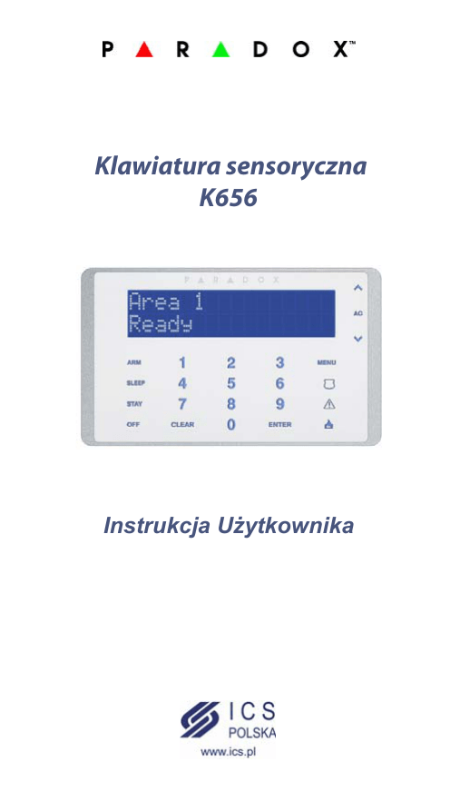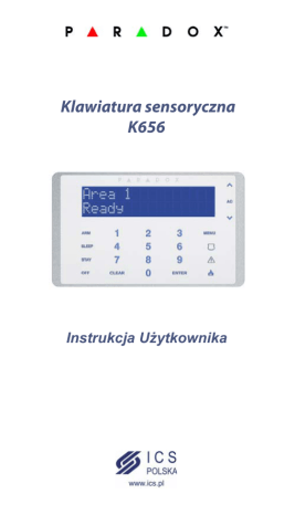 Klawiatura sensoryczna K656 Instrukcja Użytkownika Płyta czołowa 1 2 3 4 8 5 6 7 Niebieski wyświetlacz LCD, 2 x 16 znaków Dioda LED sygnalizująca obecność zasilania AC Przyciski przewijania menu Przycisk menu głównego Przyciski alarmów wyzwalanych ręcznie (Panic) Przycisk [Enter] - do wchodzenia w podmenu oraz zapisywania danych 7) Przycisk [Clear] - kasuje dane z bieżącej komórki lub cofa do niższego poziomu 8) Przyciski szybkiego uzbrojenia bez użycia kodu w trybie Dziennym, Nocnym* lub Pełnym 1) 2) 3) 4) 5) 6) *Tryb Nocny będzie dostępny w przyszłości Potwierdzenia dźwiękowe Operacjom wykonywanym na klawiaturze towarzyszą dźwięki wydawane przez brzęczyk. Dźwięki te mają następujące znaczenia: Dźwięk potwierdzenia: jeśli operacja (np. uzbrojenie lub rozbrojenie) udała się, klawiatura wydaje serię krótkich dźwięków (BEEP-BEEP-BEEP-BEEP-BEEP) Dźwięk odrzucenia: odrzuceniu komendy lub cofnięciu się do poprzedniego poziomu towarzyszy jeden długi dźwięk (BEEEEEEEEEEEP) Strona 2 Ustawianie daty i godziny Aby ustawić datę i godzinę: 1) Wciśnij [MENU] > [9] USTAWIENIA > [2] CZAS I DATA 2) Wprowadź swój Kod Użytkownika 3) Aby zmienić godzinę, umieść kursor za pomocą przycisku pod odpowiednią cyfrą i wprowadź właściwą cyfrę (cyfry) za pomocą klawiatury UWAGA: zmiana formatu godziny z 12 na 24 lub odwrotnie wymaga interwencji Instalatora ^ 4) Aby zmienić datę umieść kursor pod odpowiednią cyfrą i wprowadź właściwą cyfrę (cyfry) za pomocą klawiatury 5) Wciśnij [ENTER] aby zapisać i wyjść Ustawienia klawiatury Możesz dopasować do swoich potrzeb następujące parametry: • • • • • • • • • Szybkość przeglądania: szybkość z jaką zmieniają się komunikaty na wyświetlaczu LCD Podświetlenie klawiatury: jasność podświetlenia przycisków Czułość klawiatury: czułość pól sensorycznych na naciśnięcie palcem Jasność LCD: jasność wyświetlacza LCD Kontrast LCD: kontrast wyświetlacza LCD Wyciszenie: w stanie wyciszenia klawiatura wydaje tylko dźwięki potwierdzenia i odrzucenia nie sygnalizuje odliczania czasu i alarmów Jasność wygaszania: poziom podświetlania wyświetlacza w stanie przyciemnienia Czas wygaszenia: czas po jakim ekran LCD zostaje przyciemniony - można tu wpisać wartość od 0 (bez przyciemnienia) do 255 sekund Info: pokazuje numer fabryczny klawiatury oraz wersję firmware i język Strona 3 Zmiana ustawień klawiatury Wciśnij [MENU] [1] Szybkość przeg [9] USTAWIENIA [2] [5] MANIPULATOR Podświetl.klaw [3] Czułość klaw. Za pomocą przycisków [ ]i możesz zmieniać wybrany parametr ^ ^ [4] Jasność LCD [5] Kontrast LCD [6] Wyciszenie [7] Wciśnij [MENU] Wyga.Jasność Wciśnij [CLEAR] aby wyjść Czas Wygaszeni [8] [9] Info Strona 4 Tryb poufny Jeśli funkcja ta została włączona przez instalatora klawiatura po określonym czasie przestaje wyświetlać stan systemu na wyświetlaczu LCD. W trybie poufnym: • • • Stan linii i partycji NIE jest pokazywany na wyświetlaczu LCD Dioda LED stanu systemu NIE świeci W zależności od ustawień - wyjście z trybu poufnego następuje po wciśnięciu dowolnego przycisku lub wymaga wprowadzenia Kodu Użytkownika Linie gongowe Klawiatura może sygnalizować dźwiękiem otwarcie linii - np. w celu przywołania sprzedawcy, gdy klient otworzy drzwi wejściowe. Sygnalizacja ta może być aktywna zawsze lub tylko w określonych godzinach. W zależności od ustawień sygnalizowane może być również zamknięcie linii. Aby zaprogramować linie gongowe: 1) Wciśnij [MENU] > [6] 2) Wprowadź swój Kod Użytkownika 3) Wciśnij [1] a następnie wprowadź numer linii lub użyj przycisków [ ] i [ ] aby wybrać linię z listy. Wciśnij [ENTER] aby włączyć lub wyłączyć funkcję gongu dla wybranej linii. Wciśnij [CLEAR] aby zapisać i wyjść. Jeśli chcesz zaprogramować godziny w jakich funkcja gongu będzie aktywna, wciśnij przycisk [2] oraz wprowadź godzinę rozpoczęcia i zakończenia działania gongu 4) Wciśnij [CLEAR] aby wyjść ^ ^ Strona 5 Ręczne wyzwalanie alarmu (Panic) Użytkownik systemu może wywołać alarm ręcznie aby wezwać pomoc w przypadku wystąpienia zagrożenia. W zależności od tego w jaki sposób system został skonfigurowany i zaprogramowany, informacja o tym zagrożeniu może zostać wysłana do Agencji Ochrony. Aby wywołać alarm należy wcisnąć i przytrzymać przez 3 sekundy jeden z przycisków alarmowych na klawiaturze. W zależności od tego jak Instalator zaprogramował system, każdy z tych alarmów może być cichy lub głośny (syrena). Rodzaj alarmu Alarm napadowy Alarm dodatkowy Alarm pożarowy Przycisk Partycje System alarmowy może być podzielony na niezależne podsystemy, zwane partycjami. Taki podział pozwala na niezależne włączanie i wyłącznie ochrony części obiektu. Każdemu Użytkownikowi można nadać uprawnienia do wybranych partycji lub do wszystkich. Wyświetlanie stanu partycji W każdej chwili Użytkownik może sprawdzić stan każdej partycji. Aby wyświetlić stan partycji: 1) Wciśnij [MENU] > [2] STATUS SYSTEMU 2) Wybierz partycję, której stan chcesz wyświetlić 3) Aby wyjść wciśnij [CLEAR] Partycja może być w następujących stanach: • • • • • Gotowy: wszystkie linie w partycji są zamknięte NieGotowy: otwarte linie w partycji Awaria: w systemie występuje jakaś usterka Alarmy w pamieci: był alarm w tej partycji Partycja uzbroj.: partycja jest uzbrojona Strona 6 Uzbrajanie Gdy system jest uzbrojony - każde naruszenie linii spowoduje alarm. Informacja o alarmie może zostać przesłana do Agencji Ochrony. Aby uzbroić system: 1) Wciśnij [MENU] > [1] UZBRO./ROZBRO. i wybierz sposób uzbrojenia 2) Wprowadź swój Kod Użytkownika 3) Jeśli masz uprawnienia do więcej niż jednej partycji - wybierz partycję, którą chcesz uzbroić Sposoby uzbrojenia • Zwykłe: normalne uzbrojenie systemu. Aby można było uzbroić system,