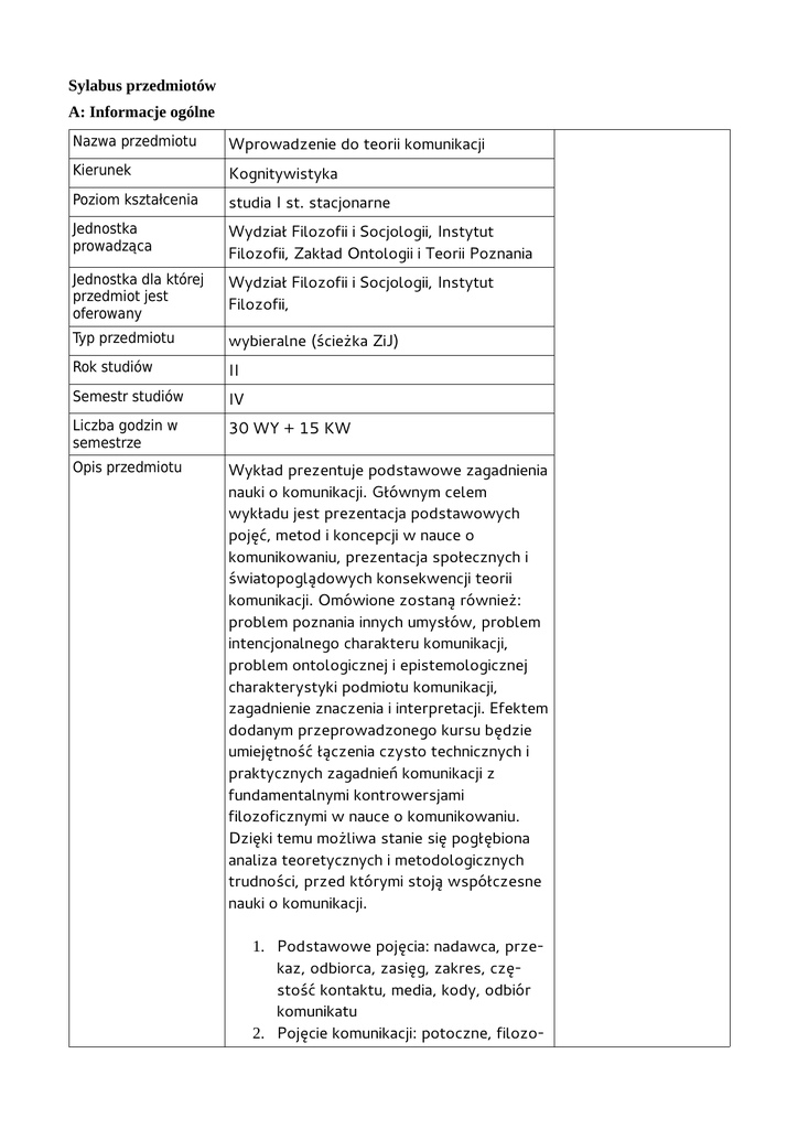 Sylabus przedmiotów A: Informacje ogólne Nazwa przedmiotu Wprowadzenie do teorii komunikacji Kierunek Kognitywistyka Poziom kształcenia studia I st. stacjonarne Jednostka prowadząca Wydział Filozofii i Socjologii, Instytut Filozofii, Zakład Ontologii i Teorii Poznania Jednostka dla której przedmiot jest oferowany Wydział Filozofii i Socjologii, Instytut Filozofii, Typ przedmiotu wybieralne (ścieżka ZiJ) Rok studiów II Semestr studiów IV Liczba godzin w semestrze 30 WY + 15 KW Opis przedmiotu Wykład prezentuje podstawowe zagadnienia nauki o komunikacji. Głównym celem wykładu jest prezentacja podstawowych pojęć, metod i koncepcji w nauce o komunikowaniu, prezentacja społecznych i światopoglądowych konsekwencji teorii komunikacji. Omówione zostaną również: problem poznania innych umysłów, problem intencjonalnego charakteru komunikacji, problem ontologicznej i epistemologicznej charakterystyki podmiotu komunikacji, zagadnienie znaczenia i interpretacji. Efektem dodanym przeprowadzonego kursu będzie umiejętność łączenia czysto technicznych i praktycznych zagadnień komunikacji z fundamentalnymi kontrowersjami filozoficznymi w nauce o komunikowaniu. Dzięki temu możliwa stanie się pogłębiona analiza teoretycznych i metodologicznych trudności, przed którymi stoją współczesne nauki o komunikacji. 1. Podstawowe pojęcia: nadawca, przekaz, odbiorca, zasięg, zakres, częstość kontaktu, media, kody, odbiór komunikatu 2. Pojęcie komunikacji: potoczne, filozo- ficzne, socjologiczne, psychologiczne, antropologiczne. 3. Orientacje w nauce o komunikowaniu (podejście funkcjonalno – empiryczne, marksistowskie, krytyczne, technologiczne, kulturowo – semiotyczne) 4. Modele procesu komunikacji: transmisji, rytualny, orkiestralny, rozgłosu, recepcji 5. Rodzaje i funkcje komunikacji: pojęcie i klasyfikacja funkcji, funkcja opisowa a funkcja fatyczna komunikacji 6. Kompetencja komunikacyjna a kompetencja językowa, kulturowa, medialna 7. Kontekst, działanie, zaangażowanie (koncepcja aktów mowy, moc sprawcza słowa, kontekst i znaczenie) 8. Podmiot w procesie komunikowania (problem nadawcy komunikatu, komunikacja jako aspekt obiektywizacji i socjalizacji wiedzy kulturowej, komunikowanie się jako elementarny akt społeczny) 9. Media i komunikacja masowa (pojęcie masy, komunikacja masowa, masowy odbiorca, instytucja medium masowego, kultura masowa a kultura popularna) 10. Media a społeczeństwo (komunikacja jako zapośredniczenie stosunków społecznych, zagadnienie władzy nierówności, tożsamości społecznej, postępu społecznego, przestrzeń i czas społeczny) 11. Nowe media (kryteria nowości: interaktywność, nowe problemy badawcze, nowe wzory obiegu informacji, nowe mechanizmy społeczne, nowe media a polityka) Efekty kształcenia wiedza (max. 5): metoda weryfikacji 1 Student potrafi określić tożsamość nauki o egzamin komunikowaniu na tle innych nauk EK kierunkowe K_W01 humanistycznych. 2 Student zna i potrafi podać definicje egzamin podstawowych pojęć (tj, nadawca, odbiorca, komunikat, sygnał, szum, koder, kod, kontekst, znak, interpretacja, znaczenie). K_W04 3 Student rozróżnia formułowane w nauce o egzamin komunikowaniu ogóle koncepcje komunikacji jako przekazu informacji. K_W07, K_W06 4 Wymienia i wyjaśnia podstawowe metody badań w ramach nauki o komunikacji. egzamin K_W16, K_W17 5 Student wyjaśnia rolę języka i komunikacji w kształtowaniu obrazu siata i jego wpływ na percepcję i poznanie. egzamin K_W18, K_W19 1 Student potrafi jasno i prosto komunikować wiedzę w zakresie nauk o komunikacji. egzamin K_U01 2 Student potrafi przeprowadzić analizę (semantyczną i pragmatyczną) wypowiedzi językowej. egzamin K_U07, K_U14 3 Student potrafi poprawnie stosować terminologię z różnych teorii komunikacji. egzamin K_U11 4 Student potrafi powiązać różne terminy opisujące to samo zjawisko w różnych teoriach komunikacji. egzamin K_U12 1 Student jest aktywny w poszukiwaniu wiedzy i doskonaleniu umiejętności. egzamin K_K01 2 Student jest świadomy zróżnicowanej wartości dostępnej powszechnie wiedzy dotyczącej komunikacji. egzamin K_K05 3 Student jest świadomy społecznych i praktycznych konsekwencji posiadanej wiedzy. egzamin K_K07 umiejętności: postawy: Punkty ECTS 3 Ogólna forma zaliczenia Egzamin pisemny na podstawie wykładów i dostępnej literatury Język wykładowy polski Koordynator przedmiotu Dodatkowe informacje dr Marcin Trybulec