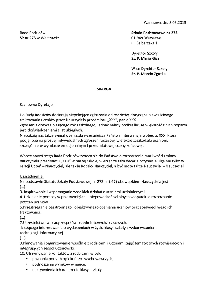 Warszawa, dn. 8.03.2013 Rada Rodziców SP nr 273 w Warszawie Szkoła Podstawowa nr 273 01-949 Warszawa ul. Balcerzaka 1 Dyrektor Szkoły Sz. P. Maria Giza W-ce Dyrektor Szkoły Sz. P. Marcin Zgutka SKARGA Szanowna Dyrekcjo, Do Rady Rodziców docierają niepokojące zgłoszenia od rodziców, dotyczące niewłaściwego traktowania uczniów przez Nauczyciela przedmiotu „XXX”, panią XXX. Zgłoszenia dotyczą bieżącego roku szkolnego, jednak należy podkreślić, że większość z nich poparta jest doświadczeniami z lat ubiegłych. Niepokoją nas także sygnały, że każda wcześniejsza Państwa interwencja wobec p. XXX, którą podjęliście na prośbę indywidualnych zgłoszeń rodziców, w efekcie zaszkodziła uczniom, szczególnie w wymiarze emocjonalnym i przedmiotowej oceny końcowej. Wobec powyższego Rada Rodziców zwraca się do Państwa o rozpatrzenie możliwości zmiany nauczyciela przedmiotu „XXX” w naszej szkole, wierząc że taka decyzja przyniesie ulgę nie tylko w relacji Uczeń – Nauczyciel, ale także Rodzic- Nauczyciel, a być może także Nauczyciel – Nauczyciel. Uzasadnienie: Na podstawie Statutu Szkoły Podstawowej nr 273 (art 67) obowiązkiem Nauczyciela jest: (…) 3. Inspirowanie i wspomaganie wszelkich działań z uczniami uzdolnionymi. 4. Udzielanie pomocy w przezwyciężaniu niepowodzeń szkolnych w oparciu o rozpoznanie potrzeb uczniów 5.Przestrzeganie bezstronnego i obiektywnego oceniania uczniów oraz sprawiedliwego ich traktowania. (…) 7.Uczestnictwo w pracy zespołów przedmiotowych/ klasowych. -bieżącego informowania o wydarzeniach w życiu klasy i szkoły z wykorzystaniem technologii informacyjnej. (...) 9.Planowanie i organizowanie wspólnie z rodzicami i uczniami zajęć tematycznych rozwijających i integrujących zespół uczniowski. 10. Utrzymywanie kontaktów z rodzicami w celu: • poznania potrzeb opiekuńczo -wychowawczych; • podnoszenia wyników w nauce; • uaktywnienia ich na terenie klasy i szkoły Tymczasem pani XXX w naszej ocenie nie tylko zaniedbuje w/w obowiązki, ale także wywołuje wśród uczniów ogromny stres, lekceważy ich potrzeby, zastrasza i zachowuje się w sposób co najmniej niegrzeczny nie tylko wobec uczniów, ale także wobec współpracowników ( w obecności naszych dzieci, które bardzo to przeżywają). Nie możemy zgodzić się na takie zachowania, nie będziemy też tolerować wyniosłości pani XXX wobec nas samych, czego nieustannie doświadczamy przy okazji zebrań oddziałowych. Odnosząc się do Statutu naszej Szkoły, którego nie przestrzega p. XXX informujemy, że: Ad.3) Uczniowie są skutecznie zniechęcani do uczestniczenia w obowiązkowych zajęciach „XXX”, nie ma mowy o rozwijaniu zainteresowań uczniów poprzez uczestniczenie w dodatkowych zajęciach tematycznych, ze względu na wyniosłość Nauczyciela, brak uprzejmości, brak uśmiechu i niechęć skierowana wobec dzieci , a także wobec wykonywania swojego zawodu. Ad.4) Nauczyciel wyraźnie utrudnia dzieciom przezwyciężanie niepowodzeń. Niestarannie ocenia Sprawdziany, co potwierdziło kilkoro rodziców, którzy zażądali ( i otrzymali na chwilę) pracę swojego dziecka, wskazując na niej nieprawidłowo podliczone punkty, lub nieuzasadnione ich nieprzyznanie za prawidłowo wykonane zadania. Ocena mierna zmieniała się na dostateczną lub nawet dobrą tylko dzięki wnikliwości rodziców, co w efekcie miało swój finał na kolejnych zajęciach, gdzie uczniowie byli odpytywani do skutku ( skutkiem tym miała być ocena niedostateczna – wystarczył jeden błąd na kilka lub kilkanaście pytań!) Dużym problemem jest również grupa dzieci z orzeczoną dysekcją lub dysgrafią, o której p. XXX została poinformowana ( tak samo jak inni Nauczyciele) przez Wychowawców i rodziców, poprzez wpis do Dziennika i dostarczenie zaświadczenia, w którym jest wyraźny zapis, że dzieciom tym przyznać należy 5 min. więcej czasu na zapoznanie się z treścią zadań. Niestety mimo kilkukrotnych, w tym roku, interwencji rodziców i Wychowawców, p. XXX nie uznała dotąd za właściwe, wyrównanie szans edukacyjnych dzieciom z tą szczególną potrzebą, czego efektem są najniższe możliwe oceny ze sprawdzianów i innych prac pisemnych, a także z notatek sporządzanych przez dzieci podczas obowiązkowego ( w ramach „realizacji programu” oglądania filmów animowanych z serii: „ XXXX”. Z notatek tych , p. XXX następnie przepytuje, a więc ocena z wiedzy merytorycznej, uzależniona jest od ich jakości, z którymi część dzieci sobie zupełnie nie radzi. Zwracamy tu szczególną uwagę nie tylko na dzieci z orzeczeniem dysleksji czy dysgrafii, ale również, na rocznik młodszych czwartoklasistów, którym jest szczególnie trudno odleźć się wobec nowych obowiązków i ilości przyswajanej wiedzy, tym bardziej gdy sposób jej przekazywania odpowiada praktyce stosowanej na wyższych uczelniach. Ad5). Trudno mówić o sprawiedliwym ocenianiu wobec wyżej przedstawionych faktów. Przede wszystkim zwracamy uwagę, że sprawdziany, prace klasowe i testy sprawdzane są przez panią XXXx niestarannie, co najczęściej wpływa na zaniżoną ocenę ucznia. ( Żaden rodzic nie zgłosił, że błąd w ocenie przyczynił się do zawyżenia oceny dziecka). Ad7) Wszystkie zgłoszenia rodziców, potwierdzają problem z udostępnianiem prac klasowych i sprawdzianów dzieci. Rodzice nie otrzymują żadnej informacji zwrotnej dotyczącej powodu obniżenia oceny. W dziennikach klasowych nie zawsze znajduje się informacja ( lub jest nieczytelna) czego dana ocena dotyczy. Prace dzieci nie są nigdy udostępnianie na podstawie oświadczenia. Ad 9) = Ad 3) Ad10) Pani XXX nie utrzymuje żadnych pozytywnych relacji z rodzicami, co więcej, odnosi się do nas w sposób lekceważący, wyniosły a czasami nawet obraźliwy. Traktuje nas jak intruzów, niechętnie udziela informacji, a jeśli nawiąże się jakikolwiek dialog, nie dotyczy
