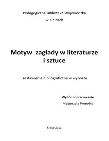 Pedagogiczna Biblioteka Wojewódzka w Kielcach Motyw zagłady w literaturze i sztuce zestawienie bibliograficzne w wyborze Wybór i opracowanie Małgorzata Pronobis Kielce 2011 Tadeusz Borowski „Opowiadania” 1. Buryła, Sławomir : Granice "kamiennego świata" : problematyka wartości w opowiadaniach oświęcimskich Tadeusza Borowskiego / Sławomir Buryła // „Akcent”. – 1999, nr 3/4, s. 36-47 Czytelnia Pedagogicznej Biblioteki Wojewódzkiej 2. Buryła, Sławomir : Herlinga-Grudzioskiego spór z Borowskim wokół koncepcji rzeczywistości koncentracyjnej / Sławomir Buryła // „Ruch Literacki”. - 1998, z. 1, s. 65-81 Czytelnia Pedagogicznej Biblioteki Wojewódzkiej 3. Buryła, Sławomir : Holocaust a nowa sytuacja tragiczna / Sławomir Buryła // „Ruch Literacki”. – 1999, z. 6, s. 633-647 *Brak + 4. Buryła, Sławomir : Paradoksy obozowego świata / Sławomir Buryła // „Kresy”. 2004, nr 4, s. 220-228 Czytelnia Pedagogicznej Biblioteki Wojewódzkiej 5. Buryła, Sławomir : Proza Tadeusza Borowskiego wobec Holocaustu / Sławomir Buryła // „Ruch Literacki”. - 2004, z. 3, s. *293+-307 *Brak+ 6. Buryła,Sławomir : Tadeusz Borowski // W : Literatura współczesna / pod red. Anny Skoczek . - Warszawa : Świat Książki , 2008 . – S. 91-111 Sygn. 244570 Czytelnia Pedagogicznej Biblioteki Wojewódzkiej 7. Kaniewska, Bogumiła : Literatura polska XX wieku / Bogumiła Kaniewska, Anna Legeżyoska, Piotr Śliwioski . - Poznao : Wydawnictwo Poznaoskie, 2005 . – S. 160-164 : W innym świecie : opowiadania Tadeusza Borowskiego Sygn. 240196 Czytelnia Pedagogicznej Biblioteki Wojewódzkiej Sygn. 240593, 240594 Wypożyczalnia Pedagogicznej Biblioteki Wojewódzkiej 8. Krupa , Bartłomiej : Świadkowie Shoah a sytuacja szkolna, czyli o odzyskiwaniu podmiotu / Bartłomiej Krupa // „Polonistyka".- 2005, nr 6, s.29-34 *Zmiany jakie zaszły w pisarstwie historycznym podejmującym temat holocaustu, sytuacja narratora w opowiadaniach Tadeusza Borowskiego oraz temat zagłady w praktyce szkolnej+ Czytelnia Pedagogicznej Biblioteki Wojewódzkiej 9. Nowacka , Teresa : Co potrzeba do matury z języka polskiego / Teresa Nowacka . Warszawa : Verbum , 2005 . – S. 278-294 : Tadeusz Borowski – opowiadania *"Pożegnanie z Marią" - obraz życia w okupowanej Warszawie, postawy moralne ludzi; "U nas w Auschwitzu..."- rzeczywistośd obozowa, nieludzkie warunki życia i cierpienie ludzi, zniewolenie człowieka przez rzeczywistośd obozową; "Proszę paostwa do gazu" - rzeczywistośd obozowa; "Bitwa pod Grunwaldem" - istota i mechanizmy deprawacji człowieka w hitlerowskim systemie obozowym+ Sygn. 240216 podr. Czytelnia Pedagogicznej Biblioteki Wojewódzkiej 10. Siwiec, Magdalena : Niemy krzyk : opowiadania Tadeusza Borowskiego // W : Lektury bez tajemnic.*Cz.+ 2 / oprac. Michał Kuziak . - Kraków : "Znak", 1999 . – S. 80-89 Sygn. 228095 Czytelnia Pedagogicznej Biblioteki Wojewódzkiej Sygn. 228263 Wypożyczalnia Pedagogicznej Biblioteki Wojewódzkiej 11. Szewczyk-Haake, Katarzyna : Trauma powtórzona : (opowiadania obozowe Tadeusza Borowskiego i Rozstrzelania Andrzeja Wróblewskiego) / Katarzyna SzewczykHaake // „Polonistyka”. - 2010, nr 1, s. 30-35 *Próba, poprzez analizę utworów literackich i plastycznych, dotarcia do dzieła jako narzędzia w staraniach człowieka-artysty o odzyskanie podmiotowości zdeptanej w wojennym doświadczeniu+ Czytelnia Pedagogicznej Biblioteki Wojewódzkiej 12. Ziętek, Zygmunt : „Pamięd przechowuje tylko obrazy” : Tadeusz Borowski // W : Sporne postaci polskiej literatury współczesnej / pod red. Aliny Brodzkiej . Warszawa : Instytut Badao Literackich PAN, 1994 . – S. 19-44 Sygn. 215860 Czytelnia Pedagogicznej Biblioteki Wojewódzkiej Sygn. 215861, 215862 Wypożyczalnia Pedagogicznej Biblioteki Wojewódzkiej Imre Kertesz „Los utracony” 13. Brzezioski, Dariusz : ...Opowiedzied o szczęściu obozów koncentracyjnych / Dariusz Brzezioski // „Alma Mater”. - Nr 64 (2004), s. 50-54 *Zawiera rec. książki: „Los utracony”+ Uniwersytet Humanistyczno-Przyrodniczy, Czytelnia Główna 14. Frątczak, Marcin : Oczywistośd / Marcin Frątczak // „Czas Kultury”. – 2003, nr 2/3, s. 158-160 Czytelnia Pedagogicznej Biblioteki Wojewódzkiej 15. Jastrzębska, Jolanta : Imre Kertesz - węgierski wariant dyskursu o Holocauście / Jolanta Jastrzębska // „Teksty Drugie”. - 2004, nr 5, s. 152-167 *Tematyka wojny i holokaustu w literaturze węgierskiej na przykładzie utworów noblisty+ Czytelnia Pedagogicznej Biblioteki Wojewódzkiej 16. Kamieoczyk, Monika : Szczęście holocaustu? / Monika Kamieoczyk // „Opcje”. – 2002, nr 3, s. 24-25 Czytelnia Pedagogicznej Biblioteki Wojewódzkiej 17. Kertesz, Imre : W kosmosie własnych przeżyd / Imre Kertesz ; rozm. przepr. Franziska Augstein // „Forum”. - 2010, nr 1, s. 34-37 Wojewódzka Biblioteka Publiczna 18. Morawiec, Arkadiusz : „...W tym pięknym obozie koncentracyjnym” / Arkadiusz Morawiec // „Akcent”. – 2002, nr 4, s. 162-165 Czytelnia Pedagogicznej Biblioteki Wojewódzkiej 19. Salvadori, Roberto : Każdemu, co mu się należy : Kertész i Köves / Roberto Salvadori // „Zeszyty Literackie”. – 2008, nr 2, s. 99-105 *W powieści "Los utracony" węgierski noblista Imre Kertész naszkicował wstrząsającą historię chłopca, który przeżył obóz koncentracyjny+ Czytelnia Pedagogicznej Biblioteki Wojewódzkiej Art Spiegelman „Maus” 20. Bojda, Wioletta : Wojenne obrazki, czyli Holocaust w komiksie / Wioletta Bojda // „Guliwer”. - 2009, nr 1, s. 75-86 *Losy Polaków i Żydów w czasie II wojny światowej przedstawione w komiksie Arta Spiegelmana "Maus" oraz Krzysztofa Gawronkiewicza "Achtung Zelig! Druga wojna"+ Czytelnia Pedagogicznej Biblioteki Wojewódzkiej 21. Festraets, Marion : Dymki z przesłaniem / Marion Festraets // „Forum”. - 2004, nr 50, s. 48-49 *Twórczośc Arta Spiegelmana, autora komiksów podejmujących poważne tematy Holocaustu, zamachu z 11