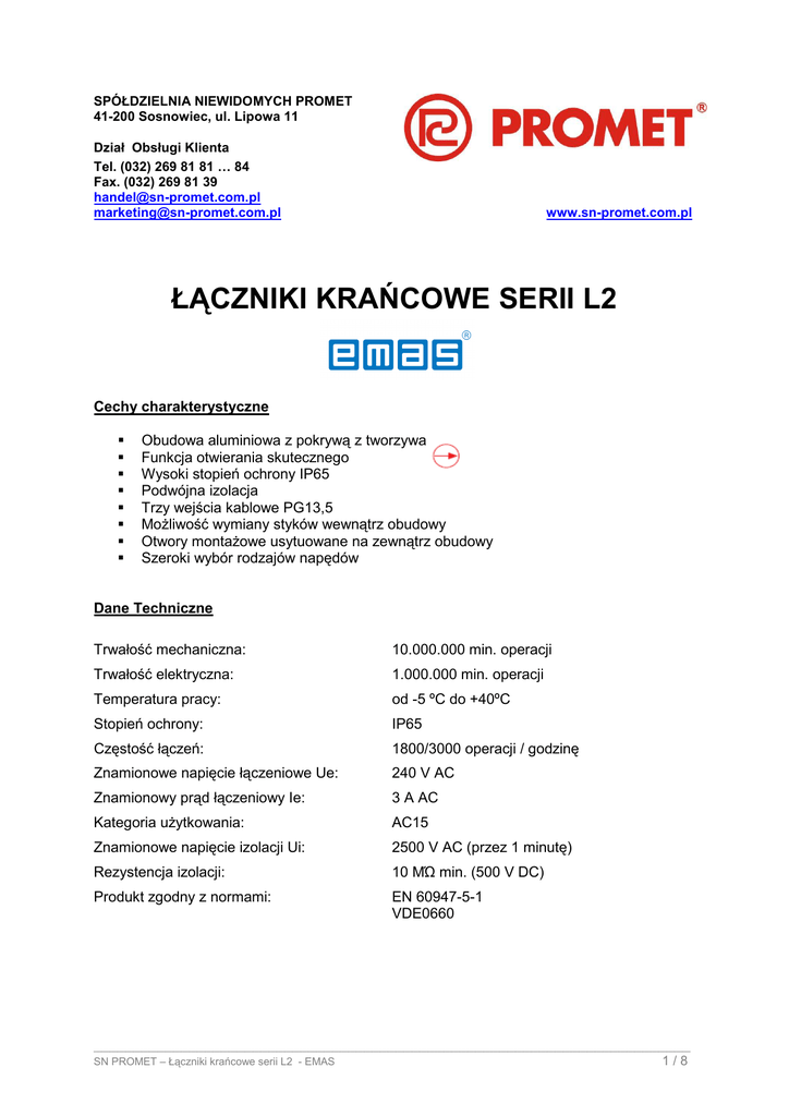 SPÓŁDZIELNIA NIEWIDOMYCH PROMET 41-200 Sosnowiec, ul. Lipowa 11 Dział Obsługi Klienta Tel. (032) 269 81 81 … 84 Fax. (032) 269 81 39 [email protected] [email protected] www.sn-promet.com.pl ŁĄCZNIKI KRAŃCOWE SERII L2 Cechy charakterystyczne Obudowa aluminiowa z pokrywą z tworzywa Funkcja otwierania skutecznego Wysoki stopień ochrony IP65 Podwójna izolacja Trzy wejścia kablowe PG13,5 Możliwość wymiany styków wewnątrz obudowy Otwory montażowe usytuowane na zewnątrz obudowy Szeroki wybór rodzajów napędów Dane Techniczne Trwałość mechaniczna: 10.000.000 min. operacji Trwałość elektryczna: 1.000.000 min. operacji Temperatura pracy: od -5 ºC do +40ºC Stopień ochrony: IP65 Częstość łączeń: 1800/3000 operacji / godzinę Znamionowe napięcie łączeniowe Ue: 240 V AC Znamionowy prąd łączeniowy Ie: 3 A AC Kategoria użytkowania: AC15 Znamionowe napięcie izolacji Ui: 2500 V AC (przez 1 minutę) Rezystencja izolacji: 10 MΏ min. (500 V DC) Produkt zgodny z normami: EN 60947-5-1 VDE0660 ___________________________________________________________________________ SN PROMET – Łączniki krańcowe serii L2 - EMAS 1/8 Rodzaje łączników krańcowych L2 Zdjęcie Symbol Rodzaj styków Rodzaj napędu L2K13MIP21 1NO+1NC migowy Dźwignia z rolką Ø22 mm z tworzywa o działaniu poprzecznym L2K13MIM21 1NO+1NC migowy Dźwignia z rolką metalową Ø22 mm o działaniu poprzecznym L2K13MIP31 1NO+1NC migowy Dźwignia z rolką Ø14 mm z tworzywa o działaniu poprzecznym L2K13MIM31 1NO+1NC migowy Dźwignia z rolką metalową Ø14 mm działaniu poprzecznym L2K13MEP12 1NO+1NC migowy Dźwignia rotacyjna z rolką z tworzywa Ø20 mm działaniu poprzecznym Funkcja otwierania skutecznego ___________________________________________________________________________ SN PROMET – Łączniki krańcowe serii L2 - EMAS 2/8 L2K23MEP12 1NO+1NC zależne Dźwignia rotacyjna z rolką z tworzywa Ø20 mm działaniu poprzecznym L2K13MEM12 1NO+1NC migowy Dźwignia rotacyjna z rolką metalową Ø20 mm działaniu poprzecznym 1NO+1NC migowy Dźwignia rotacyjna z rolką z tworzywa Ø18 mm działaniu poprzecznym, działanie dwukierunkowe, regulowana długość dźwigni 1NO+1NC migowy Dźwignia rotacyjna z rolką metalową Ø18 mm działaniu poprzecznym, działanie dwukierunkowe, regulowana długość dźwigni 1NO+1NC migowy Dźwignia rotacyjna z rolką z tworzywa Ø18 mm działaniu poprzecznym, działanie dwukierunkowe, regulowana długość dźwigni L2K13MEP123 L2K13MEM123 L2K13MEP124 ___________________________________________________________________________ SN PROMET – Łączniki krańcowe serii L2 - EMAS 3/8 L2K13MEM124 1NO+1NC migowy Dźwignia rotacyjna z rolką metalową Ø18 mm działaniu poprzecznym, działanie dwukierunkowe, regulowana długość dźwigni L2K13MEL22 1NO+1NC migowy Dźwignia rotacyjna z rolką gumową Ø50 mm, działanie dwukierunkowe, L2K13PUM21 1NO+1NC migowy Popychacz metalowy, pionowy L2K23PUM21 1NO+1NC zależne Popychacz metalowy L2K13MUM33 1NO+1NC migowy Popychacz z rolką metalową Ø13 mm ___________________________________________________________________________ SN PROMET – Łączniki krańcowe serii L2 - EMAS 4/8 L2K23MUM33 1NO+1NC zależne Popychacz z rolką metalową Ø13 mm L2K13SOM10 1NO+1NC migowy Dźwignia prętowa, działanie wielokierunkowe - L2K13SOM11 1NO+1NC migowy Dźwignia sprężynowa, działanie wielokierunkowe - ___________________________________________________________________________ SN PROMET – Łączniki krańcowe serii L2 - EMAS 5/8 L2K13ROP10 1NO+1NC migowy Dźwignia – sztywny drążek z tworzywa, działanie wielokierunkowe L2K13SOP10 1NO+1NC migowy Dźwignia sprężynowa z końcówką z tworzywa, działanie wielokierunkowe - L2K13SOP11 1NO+1NC migowy Dźwignia sprężynowa z końcówką z tworzywa, działanie wielokierunkowe - ___________________________________________________________________________ SN PROMET – Łączniki krańcowe serii L2 - EMAS 6/8 1NO+1NC migowy L2K13SOP12 Dźwignia sprężynowa z końcówką z tworzywa, działanie wielokierunkowe - Rysunki wymiarowe Rysunki wymiarowe napędów łączników krańcowych MIP31 / MIM31 MEP12 / MEM12 MEL22 PUM21 SOM10 MIM21 / MIM21 ROP10 MUM33 ___________________________________________________________________________ SN PROMET – Łączniki krańcowe serii L2 - EMAS 7/8 SOP12 SOP10 SOP11 / SOM11 MEP21 Rysunek wymiarowy korpusu łącznika krańcowego serii L2 ___________________________________________________________________________ SN PROMET – Łączniki krańcowe serii L2 - EMAS 8/8