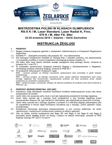 MISTRZOSTWA POLSKI W KLASACH OLIMPIJSKICH RS:X K i M, Laser Standard, Laser Radial K, Finn, 470 K i M, 49er FX, 49er 22-25 września 2016 r. Gdańsk – Górki Zachodnie INSTRUKCJA ŻEGLUGI 1. 1.1 1.2 1.3 1.4 1.5 1.6 PRZEPISY Regaty zostaną rozegrane zgodnie z ‘przepisami’ zdefiniowanymi w Przepisach Regatowych Żeglarstwa. Dodatek P – „Specjalne procedury dla przepisu 42”, ma zastosowanie. Dla wyścigów medalowych Dodatek Q, Wyścigi floty z udziałem arbitrów, ma zastosowanie i w przypadku konfliktu z innymi przepisami obowiązują przepisy dodatku Q. Dla klasy 49er kara dwóch obrotów zostaje zastąpiona karą jednego obrotu. Zmienia to przepisy 44.1 oraz P2.1. W przypadku sprzeczności niniejszej Instrukcji Żeglugi z Zawiadomieniem o Regatach, obowiązują przepisy Instrukcji Żeglugi. Zmienia to PRŻ 63.7 W przepisach dotyczących niniejszych regat: [DP] – oznacza przepis, za którego naruszenie zastosowana kara pozostaje w gestii zespołu protestowego. [SP] – oznacza przepis, za którego naruszenie może zostać nałożona standardowa kara przez komisję regatową bez konieczności rozpatrywania protestu lub kara punktowa przez zespół protestowy po uprzednim rozpatrywaniu. [NP] – oznacza przepis, naruszenie, którego nie stanowi podstawy do protestu przez jacht Zmienia to PRŻ 60.1 (a). 2. 2.1 2.2 2.3 2.4 2.5 2.6 PRZEPISY BEZPIECZEŃSTWA [DP] [NP] Zawodnicy mają obowiązek noszenia osobistych środków asekuracyjnych przez cały okres przebywania na wodzie. Jacht, który nie opuszcza portu musi o tym jak najszybciej powiadomić komisję regatową. Jacht, który wycofa się z wyścigu musi powiadomić o tym komisję regatową przed opuszczeniem akwenu lub, gdy nie jest to niemożliwe, jak najszybciej po powrocie na brzeg. Jacht, który wycofał się z wyścigu zgodnie z punktem 2.3 instrukcji żeglugi zobowiązany jest do wypełnienia w biurze regat formularza wycofania się z wyścigu, przed upływem czasu protestowego. Dodatkowe informacje dotyczące bezpieczeństwa, w tym numery telefonów, do służb ratowniczych i medycznych umieszczone zostaną na tablicy ogłoszeń. Gdy na statku komisji wystawiona jest flaga AP nad flagą H lub flaga N nad flagą H wszystkie jachty muszą wrócić na brzeg i czekać na dalsze informacje. Zmienia to PRŻ Sygnały wyścigu AP nad H i N nad H. 2.7 Kiedy komisja regatowa wywiesi flagę V z powtarzającymi się sygnałami dźwiękowymi wszystkie łodzie oficjalne i łodzie pomocnicze (kierownicy ekip, trenerzy, kibice) muszą monitorować kanał VHF komisji regatowej danej trasy w oczekiwaniu na informacje o uczestnictwie w akcjach poszukiwawczych i ratowniczych. Informacja o wywieszeniu flagi V będzie podana przez radio. 3. KODEKS POSTĘPOWANIA [DP] Zawodnicy, trenerzy, kibice i personel wspomagający muszą stosować się do wymagań organizatorów, komisji regatowej i zespołu protestowego. 4. 4.1 KOMUNIKACJA Z ZAWODNIKAMI Komunikaty dla zawodników będą umieszczane na oficjalnej tablicy ogłoszeń znajdującej się w biurze regat (ONB) na terenie COSA AZS Galion. Sygnał optyczny wystawiony nad flagą klasy, floty lub akwenu obowiązuje tylko dla tej klasy, floty lub akwenu. Niniejszy punkt zmienia preambułę Sygnałów Wyścigu PRŻ. Sygnały podawane na brzegu będą wystawiane na maszcie sygnałowym na terenie COSA AZS Galion. Gdy flaga AP jest wystawiona na brzegu słowa: „1 minuta” zostają zastąpione przez: „nie wcześniej niż 45 minut” (30 minut dla klas RS:X i 49er). Niniejszy punkt zmienia sygnał AP w Sygnałach Wyścigu PRŻ. [SP] Flaga D wystawiona na brzegu wraz z jednym sygnałem dźwiękowym oznacza ‘Sygnał ostrzeżenia zostanie podany nie wcześniej niż 45 minut (30 minut dla klas RS:X i 49er) po wystawieniu flagi D’. Jachtom nie wolno opuszczać ich miejsc parkingowych dopóki flaga D nie zostanie wystawiona. 4.2 4.3 4.4 4.5 5. 5.1 5.2 6. 6.1 6.2 6.3 6.4 ZMIANY W INSTRUKCJI ŻEGLUGI Wszystkie zmiany w instrukcji żeglugi będą ogłaszane przed godziną 9.30 w dniu, w którym zaczynają obowiązywać z wyjątkiem, że zmiana w planie czasowym rozgrywania wyścigów musi być ogłoszona do godziny 20.00 w dniu poprzedzającym jej obowiązywanie. Zmiany dotyczące przyporządkowania klas do akwenów muszą być ogłoszone do godziny 9.30 w dniu, w którym zaczynają obowiązywać lub, jeśli flaga AP jest wystawiona na brzegu, nie później niż 30 minut przed opuszczeniem flagi AP. FORMAT REGAT Regaty składają się z serii podstawowej i wyścigu medalowego z wyjątkiem klas, w których rywalizować będzie mniej niż 10 jachtów, dla których regaty składają się z pojedynczej serii wyścigów. Wyścig medalowy odbędzie się w przypadku rozegrania minimum 3 wyścigów w serii podstawowej. W przypadku rozgrywania wyścigu medalowego zostanie do niego zakwalifikowanych najlepszych 10 jachtów serii podstawowej. Zakwalifikowanie do wyścigu medalowego nastąpi na podstawie wyników serii podstawowej dostępnych o godz. 8.00 ostatniego dnia regat. 7 7.1 PROGRAM REGAT Wyścigi planowane są jak poniżej: Data 7.3 7.4 7.5 7.6 7.7 8 8.1 8.2 9 Liczba wyścigów Sygnał ostrzeżenia 22.09.2016 Seria podstawowa 3 (4 dla klasy 49er) 10.55 23.09.2016 Seria podstawowa 3 (4 dla klasy 49er) 10.55 24.09.2016 Seria podstawowa Seria podstawowa Wyścig medalowy 3 (4 dla klasy 49er) 1 1 10.55 25.09.2016 7.2 Seria 10.55 Wyścigi nierozegrane w danym dniu mogą zostać rozegrane w kolejnych dniach decyzją komisji regatowej. Dla każdej klasy planowane jest rozegranie następującej ilości wyścigów: 7.3.1 dla klas, które rozgrywają wyścig medalowy planowane jest rozegranie 9 wyścigów w serii podstawowej (12 dla klasy 49er) oraz wyścigu medalowego i/lub wyścigu określonego w punkcie 7.4 Instrukcji Żeglugi; 7.3.2 dla klas, które nie rozgrywają wyścigu medalowego planowane jest rozegranie 10 wyścigów w serii podstawowej (13 dla klasy 49er). Jachty, które nie zakwalifikowały się do wy
