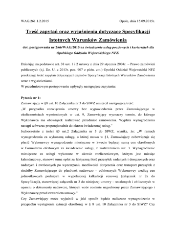 WAG.261.1.2.2015 Opole, dnia 15.09.2015r. Treść zapytań oraz wyjaśnienia dotyczące Specyfikacji Istotnych Warunków Zamówienia dot. postępowania nr 2/66/WAG/2015 na świadczenie usług pocztowych i kurierskich dla Opolskiego Oddziału Wojewódzkiego NFZ. Działając na podstawie art. 38 ust. 1 i 2 ustawy z dnia 29 stycznia 2004r. – Prawo zamówień publicznych (t.j. Dz. U. z 2013r. poz. 907 z późn. zm.) Opolski Oddział Wojewódzki NFZ przekazuje treść zapytań dotyczących zapisów Specyfikacji Istotnych Warunków Zamówienia wraz z wyjaśnieniami. W przedmiotowym postępowaniu wpłynęły następujące zapytania: Pytanie nr 1: Zamawiający w §8 ust. 10 Załącznika nr 3 do SIWZ umieścił następującą treść: „W przypadku rozwiązania umowy bez wypowiedzenia przez Zamawiającego w okolicznościach wymienionych w ust. 9, Zamawiający wyznaczy termin, do którego Wykonawca ma obowiązek realizować przedmiot zamówienia. Wypłata wynagrodzenia nastąpi wówczas proporcjonalnie do okresu świadczonej usług.” Jednocześnie z treści §3 ust.2 Załącznika nr 3 do SIWZ, wynika, że: „W ramach wynagrodzenia za wykonaną usługę, o której mowa w §1, Zamawiający zobowiązuje się płacić Wykonawcy wynagrodzenie miesięczne w kwocie będącej sumą cen określonych w Formularzu ofertowym za świadczenie usługi, z zastrzeżeniem ust. 3. Wynagrodzenie miesięczne za usługi wykonane w okresie rozliczeniowym, którym jest miesiąc kalendarzowy, stanowi suma opłat za faktyczną ilość przesyłek nadanych i doręczonych oraz nadanych i zwróconych po wyczerpaniu możliwości doręczenia oraz transport przesyłek z siedziby Zamawiającego do placówek nadawczo – odbiorczych Wykonawcy według cen jednostkowych podanych w wypełnionej kalkulacji cenowej (załącznik nr 2a do Specyfikacji), stanowiącej załącznik nr 3 do niniejszej umowy – ustalonych i obliczanych w oparciu o dokumenty nadawcze, których wzór zostanie uzgodniony przez Zamawiającego i Wykonawcę przed zawarciem umowy.” Czy Zamawiający może wyjaśnić w jaki sposób będzie naliczane wynagrodzenie w przypadku wystąpienia sytuacji określonej w § 8 ust. 10 Załącznika nr 3 do SIWZ? Czy termin o którym mowa w § 8 ust. 10 Załącznika nr 3 do SIWZ będzie obejmował pełny okres rozliczeniowy, którym jest miesiąc kalendarzowy – wówczas wynagrodzenie będzie liczone zgodnie z zapisem § 3 ust.2 Załącznika nr 3 do SIWZ? Odpowiedź na pytanie nr 1: Zamawiający informuje, iż w przypadku wystąpienia sytuacji określonej w § 8 ust. 10 projektu umowy (załącznik nr 3 do SIWZ) naliczanie wynagrodzenia Wykonawcy nastąpi proporcjonalnie do okresu świadczonej usługi, natomiast termin o którym mowa w §8 ust. 10 projektu umowy – załącznika nr 3 do SIWZ, nie zawsze musi się pokrywać z miesiącem kalendarzowym. (numeracja kontynuowana) Pytanie nr 2: Zamawiający jako jedno z kryteriów oceny ofert wskazuje procent osób zatrudnionych na podstawie umowy o pracę (w wymiarze co najmniej ¾ etatu na osobę) z ogólnej liczby osób, którym zostanie powierzona realizacja przedmiotu zamówienia w zakresie przyjmowania, przemieszczania i doręczania przesyłek z uwzględnieniem personelu podwykonawców (wg stanu na dzień składania ofert) – waga: 15%. Wykonawca nie kwestionuje prawa Zamawiającego do ukształtowania treści zamówienia w sposób adekwatny do uzasadnionych potrzeb, jednakże zwraca uwagę na fakt, że Zamawiający nie ma zupełnej dowolności w tej kwestii, gdyż jak zauważyła Krajowa Izba Odwoławcza w wyroku z dnia 13 stycznia 2011 r. (KIO 2803/10) - „W świetle dyspozycji art. 91 ust. 1 i 2 ustawy Prawo zamówień publicznych (t.j. Dz.U. z 2007 r. Nr 223, poz. 1655 ze zm.), zamawiający sam kształtuje kryteria oceny ofert, jednak kryteria te powinny być obiektywne i uzasadnione opisanym w SIWZ przedmiotem zamówienia. Kryteria oceny ofert nie mogą być sprzeczne z podstawowymi zasadami zamówień publicznych, nie mogą one ograniczać konkurencji, a tym bardziej nie mogą wprowadzać nieuzasadnionych preferencji określonych wykonawców.”. Z powyższego wynika, że jakkolwiek Zamawiający dysponuje prawem do wprowadzenia pozacenowego kryterium oceny ofert, nie powinno ono zmierzać do uchybienia zasadzie uczciwej konkurencji, mającej fundamentalne znaczenie dla całego systemu prawa zamówień publicznych. W przedmiocie zamówienia objętego niniejszym postępowaniem Zamawiającemu znane są zarówno warunki i właściwość podmiotów ubiegających się o udzielenie zamówienia- są to w praktyce tylko podmioty: państwowa Poczta Polska S.A. oraz operatorzy alternatywni, należący do grupy kapitałowej Integer.pl (InPost S.A./PGP S.A.) czyli operatorzy pocztowi, którzy jako jedyni posiadają sieć placówek obejmującą całe terytorium kraju. Z uwagi na fakty medialne, powielane w telewizji, prasie oraz internecie nie jest tajemnicą, że operatorzy ci preferują odmienną politykę zatrudnieniową. W przypadku PGP S.A forma zatrudnienia przyjęta przez tę spółkę determinowana jest jej rynkową pozycją, która budowana jest dopiero od kilku lat, natomiast Poczta Polska S.A., jako przedsiębiorstwo państwowe, funkcjonujące na rynku od dziesięcioleci, nadto posiadające status operatora wyznaczonego (a tym samym obrót umożliwiający utrzymanie ogromnej struktury zatrudnieniowej) utrzymuje zatrudnienie na podstawie umów o pracę. Tym samym PGP S.A. z uwagi na ukształtowanie rynku i jego specyfikę, nie jest w stanie zapewnić zatrudnienia na podstawie umowy o pracę porównywalnego do poziomu zatrudnienia w Poczcie Polskiej S.A. W związku z tym kryterium wyboru ofert w kształcie ustalonym przez Zamawiającego w oczywisty sposób preferuje jednego z wykonawców, tj. Pocztę Polską S.A., który – finansowany przez państwo – mógł kiedyś zbudować, a teraz jest w stanie utrzymać – wskazaną wyżej strukturę organizacyjną, opartą o zat