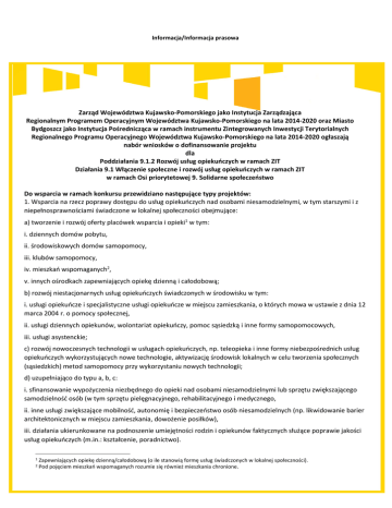 Informacja/Informacja prasowa Zarząd Województwa Kujawsko-Pomorskiego jako Instytucja Zarządzająca Regionalnym Programem Operacyjnym Województwa Kujawsko-Pomorskiego na lata 2014-2020 oraz Miasto Bydgoszcz jako Instytucja Pośrednicząca w ramach instrumentu Zintegrowanych Inwestycji Terytorialnych Regionalnego Programu Operacyjnego Województwa Kujawsko-Pomorskiego na lata 2014-2020 ogłaszają nabór wniosków o dofinansowanie projektu dla Poddziałania 9.1.2 Rozwój usług opiekuńczych w ramach ZIT Działania 9.1 Włączenie społeczne i rozwój usług opiekuńczych w ramach ZIT w ramach Osi priorytetowej 9. Solidarne społeczeństwo Do wsparcia w ramach konkursu przewidziano następujące typy projektów: 1. Wsparcia na rzecz poprawy dostępu do usług opiekuńczych nad osobami niesamodzielnymi, w tym starszymi i z niepełnosprawnościami świadczone w lokalnej społeczności obejmujące: a) tworzenie i rozwój oferty placówek wsparcia i opieki1 w tym: i. dziennych domów pobytu, ii. środowiskowych domów samopomocy, iii. klubów samopomocy, iv. mieszkań wspomaganych2, v. innych ośrodkach zapewniających opiekę dzienną i całodobową; b) rozwój niestacjonarnych usług opiekuńczych świadczonych w środowisku w tym: i. usługi opiekuńcze i specjalistyczne usługi opiekuńcze w miejscu zamieszkania, o których mowa w ustawie z dnia 12 marca 2004 r. o pomocy społecznej, ii. usługi dziennych opiekunów, wolontariat opiekuńczy, pomoc sąsiedzką i inne formy samopomocowych, iii. usługi asystenckie; c) rozwój nowoczesnych technologii w usługach opiekuńczych, np. teleopieka i inne formy niebezpośrednich usług opiekuńczych wykorzystujących nowe technologie, aktywizację środowisk lokalnych w celu tworzenia społecznych (sąsiedzkich) metod samopomocy przy wykorzystaniu nowych technologii; d) uzupełniająco do typu a, b, c: i. sfinansowanie wypożyczenia niezbędnego do opieki nad osobami niesamodzielnymi lub sprzętu zwiększającego samodzielność osób (w tym sprzętu pielęgnacyjnego, rehabilitacyjnego i medycznego, ii. inne usługi zwiększające mobilność, autonomię i bezpieczeństwo osób niesamodzielnych (np. likwidowanie barier architektonicznych w miejscu zamieszkania, dowożenie posiłków), iii. działania ukierunkowane na podnoszenie umiejętności rodzin i opiekunów faktycznych służące poprawie jakości usług opiekuńczych (m.in.: kształcenie, poradnictwo). 1 2 Zapewniających opiekę dzienną/całodobową (o ile stanowią formę usług świadczonych w lokalnej społeczności). Pod pojęciem mieszkań wspomaganych rozumie się również mieszkania chronione. 1 O wsparcie w ramach konkursu mogą ubiegać się: 1. jednostki samorządu terytorialnego i/lub ich jednostki organizacyjne (w tym OPS/PCPR) w przypadku realizacji projektu partnerskiego liderem może być podmiot wskazany w punkcie 1, natomiast partnerem/mi każdy inny podmiot z wyłączeniem osób fizycznych (nie dotyczy osób prowadzących działalność gospodarcza lub oświatową na podstawie odrębnych przepisów). Szczegółowe informacje, wzory dokumentów oraz wytyczne dotyczące naboru i oceny projektów zawiera Regulamin konkursu, dostępny na stronie internetowej Urzędu Marszałkowskiego Województwa Kujawsko-Pomorskiego w Toruniu www.rpo.kujawsko-pomorskie.pl oraz na portalu www.funduszeeuropejskie.gov.pl. Informacji dotyczących konkursu udzielają pracownicy punktów informacyjnych oraz pracownicy Biura ZIT BTOF. Biuro ZIT BTOF Urząd Miasta Bydgoszczy, ul. Jagiellońska 61, 85-027 Bydgoszcz, Tel. (52) 58 59 446; Tel. (52) 58 59 452 [email protected] Główny Punkt Informacyjny Funduszy Europejskich w Toruniu Urząd Marszałkowski Województwa Kujawsko-Pomorskiego, Pl. Teatralny 2 tel. (56) 621 85 98; (56) 621 82 68; (56) 621 84 86; [email protected] Główny Punkt Informacyjny Funduszy Europejskich w Bydgoszczy Przedstawicielstwo Urzędu Marszałkowskiego Województwa Kujawsko-Pomorskiego, ul. Jagiellońska 9; tel. (52) 327 68 84; (52) 321 33 42; 797 304 123; [email protected] Lokalne Punkty Informacyjne w Przedstawicielstwach Urzędu Marszałkowskiego Województwa KujawskoPomorskiego w: Grudziądzu, ul. Sienkiewicza 22, tel. (56) 462 45 15; 797 304 124, [email protected] Włocławku, ul. Bechiego 2, tel. (54) 235 67 21; (54) 235 67 12; 797 304 126, [email protected] Inowrocławiu, ul. Roosevelta 36-38, tel. (52) 355 91 95; 797 304 125, [email protected] Więcej informacji na www.rpo.kujawsko-pomorskie.pl 2