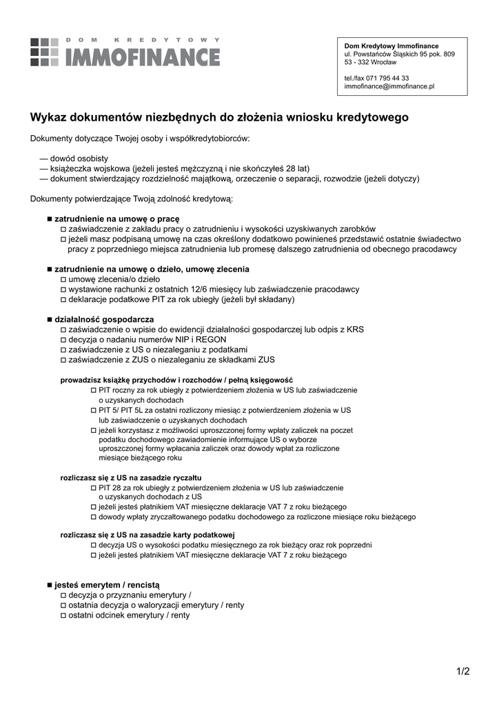 D O M K R E D Y T O W Y Dom Kredytowy Immofinance ul. Powstańców Śląskich 95 pok. 809 53 - 332 Wrocław tel./fax 071 795 44 33 [email protected] Wykaz dokumentów niezbędnych do złożenia wniosku kredytowego IMMOFINANCE Dokumenty dotyczące Twojej osoby i współkredytobiorców: — dowód osobisty — książeczka wojskowa (jeżeli jesteś mężczyzną i nie skończyłeś 28 lat) — dokument stwierdzający rozdzielność majątkową, orzeczenie o separacji, rozwodzie (jeżeli dotyczy) Dokumenty potwierdzające Twoją zdolność kredytową: zatrudnienie na umowę o pracę zaświadczenie z zakładu pracy o zatrudnieniu i wysokości uzyskiwanych zarobków jeżeli masz podpisaną umowę na czas określony dodatkowo powinieneś przedstawić ostatnie świadectwo pracy z poprzedniego miejsca zatrudnienia lub promesę dalszego zatrudnienia od obecnego pracodawcy zatrudnienie na umowę o dzieło, umowę zlecenia umowę zlecenia/o dzieło wystawione rachunki z ostatnich 12/6 miesięcy lub zaświadczenie pracodawcy deklaracje podatkowe PIT za rok ubiegły (jeżeli był składany) działalność gospodarcza zaświadczenie o wpisie do ewidencji działalności gospodarczej lub odpis z KRS decyzja o nadaniu numerów NIP i REGON zaświadczenie z US o niezaleganiu z podatkami zaświadczenie z ZUS o niezaleganiu ze składkami ZUS prowadzisz książkę przychodów i rozchodów / pełną księgowość PIT roczny za rok ubiegły z potwierdzeniem złożenia w US lub zaświadczenie o uzyskanych dochodach PIT 5/ PIT 5L za ostatni rozliczony miesiąc z potwierdzeniem złożenia w US lub zaświadczenie o uzyskanych dochodach jeżeli korzystasz z możliwości uproszczonej formy wpłaty zaliczek na poczet podatku dochodowego zawiadomienie informujące US o wyborze uproszczonej formy wpłacania zaliczek oraz dowody wpłat za rozliczone miesiące bieżącego roku rozliczasz się z US na zasadzie ryczałtu PIT 28 za rok ubiegły z potwierdzeniem złożenia w US lub zaświadczenie o uzyskanych dochodach z US jeżeli jesteś płatnikiem VAT miesięczne deklaracje VAT 7 z roku bieżącego dowody wpłaty zryczałtowanego podatku dochodowego za rozliczone miesiące roku bieżącego rozliczasz się z US na zasadzie karty podatkowej decyzja US o wysokości podatku miesięcznego za rok bieżący oraz rok poprzedni jeżeli jesteś płatnikiem VAT miesięczne deklaracje VAT 7 z roku bieżącego jesteś emerytem / rencistą decyzja o przyznaniu emerytury / ostatnia decyzja o waloryzacji emerytury / renty ostatni odcinek emerytury / renty 1/2 pracujesz za granicą umowa o pracę / kontrakt miesięczne naliczenia należnego wynagrodzenia z 6 ostatnich miesięcy (payment sleep) historia rachunku bankowego za ostatnie 3 miesiące wyciąg z rachunku karty kredytowej (jeżeli posiadasz kartę) raport kredytowy (Experian, Schuffa) zaświadczenie o uzyskiwanych dochodach jesteś marynarzem książeczka żeglarska umowy o pracę / kontrakty za ostatni rok i za rok bieżący lub zaświadczenie z agencji morskiej o okresach zamustrowań i dochodzie za ostatnie 12 miesięcy jesteś prawnikiem, lekarzem, weterynarzem i nie masz ochoty gromadzić dokumentów oświadczenie o wysokości raty jaką jesteś w stanie zapłacić jesteś osobą duchowną oświadczenie o wysokości dochodów potwierdzone przez Twojego zwierzchnika Wynajmujesz nieruchomości umowy najmu dokument potwierdzający Twoje prawo do wynajmowanej nieruchomości właściwy PIT za rok ubiegły z potwierdzeniem złożenia w US lub zaświadczenie o uzyskanych dochodach z US deklaracje podatkowe z roku bieżącego PIT 5 lub w przypadku rozliczania podatku na zasadzie ryczałtu zaświadczenie z US o wysokości osiągniętego przychodu w bieżącym zaświadczenie z US o niezaleganiu z podatkami jesteś na zasiłku przedemerytalnym decyzja o przyznaniu zasiłku decyzja o wysokości zasiłku Dokumenty dotyczące nieruchomości dokumenty wymagane w przypadku finansowania zakupu nieruchomości od dewelopera/ spółdzielni mieszkaniowej: umowa zobowiązująca do wybudowania nieruchomości lub umowa przedwstępna sprzedaży nieruchomości dokumenty wymagane w przypadku prowadzenia budowy sposobem gospodarczym: odpis z księgi wieczystej, na której realizowana jest inwestycja lub dokument będący podstawą wpisu prawa własności / użytkowania wieczystego (w przypadku braku KW) ostateczne pozwolenie na budowę i dziennik budowy do wglądu zestawienie prac i cen wraz z harmonogramem prac — na formularzu banku dokumenty wymagane w przypadku zakupu nieruchomości na rynku wtórnym lub zakupu działki: umowa przedwstępna sprzedaży nieruchomości odpis z księgi wieczystej lub dokument będący podstawą wpisu prawa własności / użytkowania wieczystego na rzecz zbywcy (w przypadku barku KW) dokumenty wymagane w przypadku kredytu przeznaczonego na spłatę kredytu zaciągniętego w innym banku: odpis księgi wieczystej dokument będący podstawą wpisu prawa własności / użytkowania wieczystego na rzecz Klienta lub przydział lokalu spółdzielczego w przypadku braku KW umowy kredytów przeznaczonych do spłaty zadłużenia Pozostałe dokumenty skompletuje za Ciebie doradca. 2/2