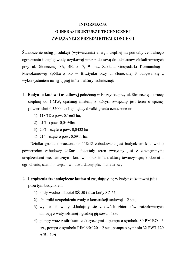 INFORMACJA O INFRASTRUKTURZE TECHNICZNEJ ZWIĄZANEJ Z PRZEDMIOTEM KONCESJI Świadczenie usług produkcji (wytwarzania) energii cieplnej na potrzeby centralnego ogrzewania i ciepłej wody użytkowej wraz z dostawą do odbiorców zlokalizowanych przy ul. Słonecznej 3A, 3B, 5, 7, 9 oraz Zakładu Gospodarki Komunalnej i Mieszkaniowej Spółka z o.o w Bisztynku przy ul. Słonecznej 3 odbywa się z wykorzystaniem następującej infrastruktury technicznej: 1. Budynku kotłowni osiedlowej położonej w Bisztynku przy ul. Słonecznej, o mocy cieplnej do 1 MW, opalanej miałem, z którym związany jest teren o łącznej powierzchni 0,3500 ha obejmujący działki gruntu oznaczone nr: 1) 118/18 o pow. 0,1663 ha, 2) 21/1 o pow. 0,0494ha, 3) 20/1 - część o pow. 0,0432 ha 4) 214 - część o pow. 0,0911 ha. Działka gruntu oznaczona nr 118/18 zabudowana jest budynkiem kotłowni o powierzchni zabudowy 248m2. Pozostały teren związany jest z zewnętrznymi urządzeniami mechanicznymi kotłowni oraz infrastrukturą towarzyszącą kotłowni – ogrodzenie, szambo, częściowo utwardzony plac manewrowy. 2. Urządzenia technologiczne kotłowni znajdujący się w budynku kotłowni jak i poza tym budynkiem: 1) kotły wodne – kocioł SŻ-50 i dwa kotły SŻ-65, 2) zbiorniki uzupełnienia wody o konstrukcji stalowej – 2 szt., 3) wymiennik wody składający się z dwóch zbiorników zaizolowanych izolacją z waty szklanej i gładzią gipsową - 1szt., 4) pompy wraz z silnikami elektrycznymi – pompa o symbolu 80 PM BO - 3 szt., pompa o symbolu PJM 65x120 – 2 szt., pompa o symbolu 32 PWT 120 A/B - 1szt. 5) filtr wstępnego oczyszczania o konstrukcji stalowej i pojemności 100 litrów - 1 szt., 6) cyklony o konstrukcji stalowej - 3 szt., 7) przenośnik taśmowy o dł. 25mb służący do transportu miału, o konstrukcja stalowej, z taśmą gumową - 1szt., 8) wentylator o symbolu WPS zamontowany przy cyklonach - 3 szt., 9) wentylator do nadmuchu kotłów o symbolu WPPO-40 - 3szt., 10) wymiennik ciepła JAD 3.18 - 3 szt., 11) wyciągi spalin wraz z silnikami elektrycznymi o mocy 5,5 KW - 3 szt., 12) kolumnę uzdatniania wody o konstrukcji stalowej -1szt. 13) komin stalowy cylindryczny typ B1 o średnicy 90cm – 1 szt. 3. Sieci ciepłowniczej i cyrkulacyjnej zbudowanej w całości w technologii stalowych rur preizolowanych, obejmującej: a) sieć ciepłowniczą o dł. 2 x 610 mb, b) sieć ciepłej wody użytkowej o dł. 591 mb, c) sieć cyrkulacyjna o dł. 585 mb. Dostawa wyprodukowanej energii cieplnej na potrzeby centralnego ogrzewania i cieplej wody użytkowej dotyczy 168 lokali mieszkalnych o łącznej powierzchni użytkowej 7832,42m2 znajdujących się w budynkach wspólnot mieszkaniowych przy ul. Słonecznej 3A, 3B, 5, 7, 9 w Bisztynku oraz Zakładu Gospodarki Komunalnej i Mieszkaniowej Spółka z o.o w Bisztynku przy ul. Słonecznej 3, którego powierzchni grzewcza wynosi 298,20m2 . Wielkość pobranej energii cieplnej : 1) sezon grzewczy 2011/12 – 2.688.280 GJ 2) sezon grzewczy 2012/2013 – 2.591.504 GJ