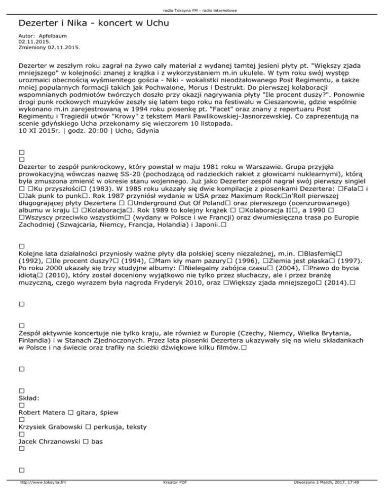 radio Toksyna FM - radio internetowe Dezerter i Nika - koncert w Uchu Autor: Apfelbaum 02.11.2015. Zmieniony 02.11.2015. Dezerter w zeszłym roku zagrał na żywo cały materiał z wydanej tamtej jesieni płyty pt. "Większy zjada mniejszego" w kolejności znanej z krążka i z wykorzystaniem m.in ukulele. W tym roku swój występ urozmaici obecnością wyśmienitego gościa - Niki - wokalistki nieodżałowanego Post Regimentu, a także mniej popularnych formacji takich jak Pochwalone, Morus i Destrukt. Do pierwszej kolaboracji wspomnianych podmiotów twórczych doszło przy okazji nagrywania płyty "Ile procent duszy?". Ponownie drogi punk rockowych muzyków zeszły się latem tego roku na festiwalu w Cieszanowie, gdzie wspólnie wykonano m.in zarejestrowaną w 1994 roku piosenkę pt. "Facet" oraz znany z repertuaru Post Regimentu i Tragiedii utwór "Krowy" z tekstem Marii Pawlikowskiej-Jasnorzewskiej. Co zaprezentują na scenie gdyńskiego Ucha przekonamy się wieczorem 10 listopada. 10 XI 2015r. | godz. 20:00 | Ucho, Gdynia Dezerter to zespół punkrockowy, który powstał w maju 1981 roku w Warszawie. Grupa przyjęła prowokacyjną wówczas nazwę SS-20 (pochodzącą od radzieckich rakiet z głowicami nuklearnymi), którą była zmuszona zmienić w okresie stanu wojennego. Już jako Dezerter zespół nagrał swój pierwszy singiel Ku przyszłości (1983). W 1985 roku ukazały się dwie kompilacje z piosenkami Dezertera: Fala i Jak punk to punk. Rok 1987 przyniósł wydanie w USA przez Maximum Rockn'Roll pierwszej długogrającej płyty Dezertera Underground Out Of Poland oraz pierwszego (ocenzurowanego) albumu w kraju Kolaboracja. Rok 1989 to kolejny krążek Kolaboracja II, a 1990 Wszyscy przeciwko wszystkim (wydany w Polsce i we Francji) oraz dwumiesięczna trasa po Europie Zachodniej (Szwajcaria, Niemcy, Francja, Holandia) i Japonii. Kolejne lata działalności przyniosły ważne płyty dla polskiej sceny niezależnej, m.in. Blasfemię (1992), Ile procent duszy? (1994), Mam kły mam pazury (1996), Ziemia jest płaska (1997). Po roku 2000 ukazały się trzy studyjne albumy: Nielegalny zabójca czasu (2004), Prawo do bycia idiotą (2010), który został doceniony wyjątkowo nie tylko przez słuchaczy, ale i przez branżę muzyczną, czego wyrazem była nagroda Fryderyk 2010, oraz Większy zjada mniejszego (2014). Zespół aktywnie koncertuje nie tylko kraju, ale również w Europie (Czechy, Niemcy, Wielka Brytania, Finlandia) i w Stanach Zjednoczonych. Przez lata piosenki Dezertera ukazywały się na wielu składankach w Polsce i na świecie oraz trafiły na ścieżki dźwiękowe kilku filmów. Skład: Robert Matera gitara, śpiew Krzysiek Grabowski perkusja, teksty Jacek Chrzanowski bas http://www.toksyna.fm Kreator PDF Utworzono 2 March, 2017, 17:48 radio Toksyna FM - radio internetowe BILETY: 27 zł (przedsprzedaż) / 30 zł (Eventim) / 37 zł (w dniu koncertu) Dostępne w: Klub Ucho (biuro czynne pn.-pt., godz. 10:00-18:00, sprzedaż również w trakcie wszystkich imprez przy wejściu do klubu), Salon Muzyczny PULS (Wójta Radtkego 47A, Gdynia, pn.-pt.: godz. 10:00-18:00; sb.: godz. 10:00-14:00), Spirit Of Rock And Roll secondhand & new clothing Lendziona 17 (Gdańsk Wrzeszcz, pn.-pt.: 12:00-19:00, sb.: 11:00-16:00), Eventim w sprzedaży drogą elektroniczną i w punktach stacjonarnych Eventimu, np. w gdańskich Empikach (wyszukiwarka sklepów eventim.pl u dołu strony). Cena "w dniu koncertu" obowiązuje przez cały dzień - niezależnie od godziny. Pula biletów przeznaczonych do sprzedaży w dniu imprezy obowiązuje tylko wówczas, gdy wejściówki nie wyprzedadzą się w ramach przedsprzedaży. Sprzedaż biletów we wszystkich punktach stacjonarnych zamykamy o godz. 15:00 w dniu koncertu, a następnie wznawiamy dopiero bezpośrednio przed imprezą w klubie. http://www.toksyna.fm Kreator PDF Utworzono 2 March, 2017, 17:48