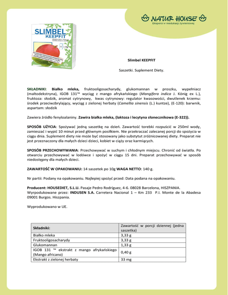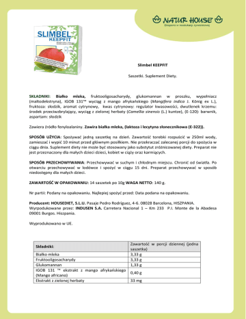 Slimbel KEEPFIT Saszetki. Suplement Diety. SKŁADNIKI: Białko mleka, fruktooligosacharydy, glukomannan w proszku, wypełniacz (maltodekstryna), IGOB 131™ wyciąg z mango afrykańskiego (Mangifera indica J. König ex L.), fruktoza: słodzik, aromat cytrynowy, kwas cytrynowy: regulator kwasowości, dwutlenek krzemu: środek przeciwzbrylający, wyciąg z zielonej herbaty (Camellia sinensis (L.) kuntze), (E-120): barwnik, aspartam: słodzik Zawiera źródło fenyloalaniny. Zawira białka mleka, (laktoza i lecytyna słonecznikowa (E-322)). SPOSÓB UŻYCIA: Spożywać jedną saszetkę na dzień. Zawartość torebki rozpuścić w 250ml wody, zamieszać i wypić 10 minut przed głównym posiłkiem. Nie przekraczać zalecanej porcji do spożycia w ciągu dnia. Suplement diety nie może być stosowany jako substytut zróżnicowanej diety. Preparat nie jest przeznaczony dla małych dzieci dzieci, kobiet w ciąży oraz karmiących. SPOSÓB PRZECHOWYWANIA: Przechowywać w suchym i chłodnym miejscu. Chronić od światła. Po otwarciu przechowywać w lodówce i spożyć w ciągu 15 dni. Preparat przechowywać w sposób niedostępny dla małych dzieci. ZAWARTOŚĆ W OPAKOWANIU: 14 saszetek po 10g WAGA NETTO: 140 g. Nr partii: Podany na opakowaniu. Najlepiej spożyć przed: Data podana na opakowaniu. Producent: HOUSEDIET, S.L.U. Pasaje Pedro Rodríguez, 4-6. 08028 Barcelona, HISZPANIA. Wyrpodukowane przez: INDUSEN S.A. Carretera Nacional 1 – Km 233 P.I. Monte de la Abadesa 09001 Burgos. Hiszpania. Wyprodukowano w UE. Składniki: Zawartość w porcji dziennej (jedna saszetka) 3,33 g 3,33 g 1,33 g Białko mleka Fruktooligosacharydy Glukomannan IGOB 131 ™ ekstrakt z mango afrykańskiego 0,40 g (Mango africano) Ekstrakt z zielonej herbaty 33 mg MANGO AFRYKAŃSKIE Irvingia gabonensis Właściwości: Badacze z Kamerunu stwierdzili, że wyciąg z Irvingia gabonensis (owoc spożywany masowo w Afryce zachodniej) ma nadzwyczajny efekt odchudzający. Badania laboratoryjne wskazują, że wyciąg z jego nasion może mieć zdolność inhibitora produkcji tłuszczu poprzez ustalone oddziaływanie na wskazane geny i enzymy, które regulują metabolizm. Działanie: Spalanie tłuszczu: działa przyspieszając metabolizm, jednocześnie stymuluje organizm do spalania kalorii i wpływa na utratę wagi poprzez szybszą eliminację nadwyżki masy ciała. Inhibitor apetytu: apetyt jest kontrolowany przez hormon (leptynę). Hormon ten zajmuje się informowaniem organizmu o jego nasyceniu. Przy nabieraniu wagi, poziom leptyny zmniejsza się znacznie. W związku z tym, potrzeba jedzenia zwiększa się. Dlatego też, zmniejszenie poziomu leptyny powoduje zwiększenie apetytu. Jednakże istnieją badania kliniczne, które potwierdzają, że “Irvingia Gabonensis” zwiększa naturalne poziomy leptyny obecnej w ciele. Opóźnia trawienie: zgodnie z badaniami klinicznymi, trzecią korzyścią mango afrykańskiego jest to, że opóźnia proces trawienny. Oznacza to, że pokarm pozostaje w układzie trawiennym przez dużo dłuższy czas, co powoduje wydłużony czas uczucia nasycenia. Duża zawartość błonnika: jest doskonałym źródłem błonnika, naturalnego środka przeczyszczającego, który pomaga eliminować odpady z większą szybkością. Zmniejsza poziom cholesterolu: zmniejszenie LDL (zły cholesterol) i większy poziom HDL (dobry cholesterol) przedłuża życie. Zgodnie z badaniami klinicznymi, mango afrykańskie pomaga zmniejszyć poziom cholesterolu poprzez łączenie z kwasami binarnymi i eliminowanie wysokiego poziomu cholesterolu, dzięki codziennym ruchom jelit. Sprzyja regulacji poziomu cukru we krwi i wyłapywaniu glukozy. Przeciwwskazania: Mając na uwadze, że mango afrykańskie jest całkowicie naturalne i nie ma w jego zawartości żadnego stymulanta, może być spożywany przez praktycznie każdego. ZIELONA HERBATA (Camelia thea) Substancje czynne: Podstawy ksantynowe (metyloksantyny): głównie kofeina, czyli teina (3-4%), teofilina teofilina, teobromina, adenina i ksantyna. Taniny katechinowe (8-25%), występują częściowo jako wolne związki, a częściowo w połączeniu z metyloksantynami. Znaczne ilości flawonoidów (kenferol, kwercetyna, miricetyna). Kwasy karboksylowe fenolowe: chlorogenowy, gulasowy. Śladowe ilości olejku eterycznego; sole mineralne, witaminy C i B; enzymy: proteaza. Działanie: Herbata wpływa stymulująco na układ nerwowy i sercowo-oddechowy. Ma także efekt dodatnio inotropowy, ponieważ zwiększa siłę i częstość skurczu sercowego i naczyń wieńcowych, a ponadto powoduje rozluźnienie mięśni gładkich, w szczególności na poziomie oskrzeli, moczowodu i dróg żółciowych. Stymulują skurcze mięśni i mają działanie diuretyczne. Flawonoidy i proantocyjany są odpowiedzialne za działanie witaminy P (tonizujące i ochronne dla naczyń), ściągające i w małym stopniu redukujące tłuszcz i cholesterol, są też czynnikiem przeciwzakrzepowym. Przeciwwskazania: Należy unikać ich używania w przypadku nerwowości, bezsenności, częstoskurczu lub nadciśnienia. FOS – fruktooligosacharydy Są to zazwyczaj rozgałęzione polimery glukozy pokarmoweJ, niewrażliwe na działanie enzymów trawiennych wytwarzanych przez organizm człowieka, wykazują pomimo tego pewien pro-zdrowotny potencjał. Ich korzystne działanie polega na stymulacji aktywności i rozwoju probiotycznej mikroflory jelitowej. fruktooligosacharydy regulują motorykę przewodu pokarmowego, działają ochronnie na nabłonek jelitowy i wykazują potencjał przeciwnowotworowy. Naturalnie występują w tkankach roślin jadalnych, klasyfikowane są jako błonnik pokarmowy. W suplementacji sportowej FOS stosuje się jako uzupełnienie diety, przede wszystkim w profilaktyce chorób układu pokarmowego, wskazane są zwłaszcza przy monotonnych, wysokobiałkowych dietach ubogich w pokarmy pochodzenia roślinnego. WspomagaĆ mogą odchudzanie poprzez hamowanie uczucia głodu i poprawę gospodarki gluko