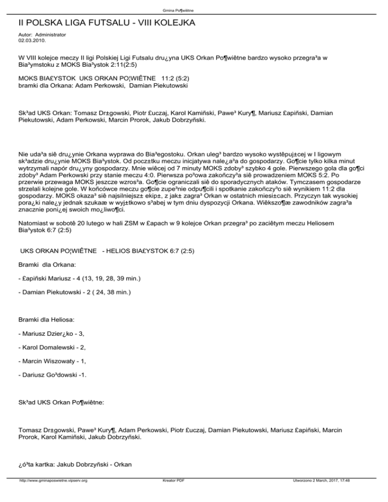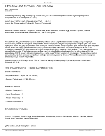 Gmina Po¶wiêtne II POLSKA LIGA FUTSALU - VIII KOLEJKA Autor: Administrator 02.03.2010. W VIII kolejce meczy II ligi Polskiej Ligi Futsalu dru¿yna UKS Orkan Po¶wiêtne bardzo wysoko przegra³a w Bia³ymstoku z MOKS Bia³ystok 2:11(2:5) MOKS BIA£YSTOK UKS ORKAN PO¦WIÊTNE 11:2 (5:2) bramki dla Orkana: Adam Perkowski, Damian Piekutowski Sk³ad UKS Orkan: Tomasz Dr±gowski, Piotr £uczaj, Karol Kamiñski, Pawe³ Kury¶, Mariusz £apiñski, Damian Piekutowski, Adam Perkowski, Marcin Prorok, Jakub Dobrzyñski. Nie uda³a siê dru¿ynie Orkana wyprawa do Bia³egostoku. Orkan uleg³ bardzo wysoko wystêpuj±cej w I ligowym sk³adzie dru¿ynie MOKS Bia³ystok. Od pocz±tku meczu inicjatywa nale¿a³a do gospodarzy. Go¶cie tylko kilka minut wytrzymali napór dru¿yny gospodarzy. Mnie wiêcej od 7 minuty MOKS zdoby³ szybko 4 gole. Pierwszego gola dla go¶ci zdoby³ Adam Perkowski przy stanie meczu 4:0. Pierwsza po³owa zakoñczy³a siê prowadzeniem MOKS 5:2. Po przerwie przewaga MOKS jeszcze wzros³a. Go¶cie ograniczali siê do sporadycznych ataków. Tymczasem gospodarze strzelali kolejne gole. W koñcówce meczu go¶cie zupe³nie odpu¶cili i spotkanie zakoñczy³o siê wynikiem 11:2 dla gospodarzy. MOKS okaza³ siê najsilniejsz± ekip±, z jak± zagra³ Orkan w ostatnich miesi±cach. Przyczyn tak wysokiej pora¿ki nale¿y jednak szukaæ w wyj±tkowo s³abej w tym dniu dyspozycji Orkana. Wiêkszo¶æ zawodników zagra³a znacznie poni¿ej swoich mo¿liwo¶ci. Natomiast w sobotê 20 lutego w hali ZSM w £apach w 9 kolejce Orkan przegra³ po zaciêtym meczu Heliosem Bia³ystok 6:7 (2:5) UKS ORKAN PO¦WIÊTNE - HELIOS BIA£YSTOK 6:7 (2:5) Bramki dla Orkana: - £apiñski Mariusz - 4 (13, 19, 28, 39 min.) - Damian Piekutowski - 2 ( 24, 38 min.) Bramki dla Heliosa: - Mariusz Dzier¿ko - 3, - Karol Domalewski - 2, - Marcin Wiszowaty - 1, - Dariusz Go³dowski -1. Sk³ad UKS Orkan Po¶wiêtne: Tomasz Dr±gowski, Pawe³ Kury¶, Adam Perkowski, Piotr £uczaj, Damian Piekutowski, Mariusz £apiñski, Marcin Prorok, Karol Kamiñski, Jakub Dobrzyñski. ¿ó³ta kartka: Jakub Dobrzyñski - Orkan http://www.gminaposwietne.vipserv.org Kreator PDF Utworzono 2 March, 2017, 17:48 Gmina Po¶wiêtne czerwona kartka: Piotr £uczaj - Orkan Niezwykle emocjonuj±cy mecz ( z ró¿nych niekoniecznie sportowych wzglêdów) zosta³ rozegrany w sobotê wieczorem w hali ZSM w £apach. Po niezwykle zaciêtym spotkaniu, wystêpuj±cy w I ligowym sk³adzie Helios Bia³ystok z trudem wygra³ z beniaminkiem ligi Orkanem Po¶wiêtne 7:6 (5:2). Od pocz±tku meczu zaznaczy³a siê przewaga do¶wiadczonych zawodników z Bia³egostoku. Helios szybko wykorzysta³ b³êdy dru¿yny Orkana i obj±³ prowadzanie 4:0. Przegrywaj±c tak wysoko gospodarze nie za³amali siê i jeszcze do przerwy po dwóch golach najlepszego strzelca ligi Mariusza £apiñskiego zakoñczyli I po³owê meczu wynikiem 2:5. Po przerwie inicjatywê przej±³ Orkan, który po 2 golach Damiana Piekutowskiego oraz 2 kolejnych bramkach Mariusza £apiñskiego doprowadzi³ do stanu koñcowego 6:7. W tym czasie go¶ci odpowiedzieli dwoma golami strzelonymi przez Mariusza Dzier¿ko. II po³owa meczu pokaza³a, ¿e Helios nie jest a¿ tak mocn± dru¿yn±. a negatywne komentarze, które towarzysz± jej niektórym meczom w I i II lidze nie s± wcale przesadzone. Mecz by³ do¶æ nerwowy, ale nie za spraw± zawodników obu dru¿yn, ale sêdziego Pana £ukasza Kula, który swoimi werdyktami i prowokuj±cym i nieodpowiedzialnym zachowaniem doprowadzi³ do du¿ej nerwowo¶ci zawodników, dzia³aczy i kibiców dru¿yny gospodarzy (sêdziowa³ od strony ³awek zawodników rezerwowych). Nie mo¿na pos±dzaæ go o ewidentne sprzyjanie dru¿ynie go¶ci. Byæ mo¿e to co zaprezentowa³ ten sêdzia wynika po prostu z braku pewnej wyobra¼ni, z braku elementarnych zasad sêdziowania i byæ mo¿e do¶wiadczenia. Chyba powinien znale¼æ sobie inne zajêcie. Dziwie siê zwi±zkowi, który na trudne, budz±ce wiele emocji mecze deleguje tak s³abego sêdziego. Aby nie byæ go³os³ownym kilka uwag: - 20 sekund do koñca meczu, stan 7:6 dla Heliosa, Orkan pod bramk± go¶ci. Zawodnik Heliosa, w polu karnym przytrzymuje kilka sekund zawodnika Orkana za koszulkê. Na uwagê z ³awki Orkana - u¶miech sêdziego. - 2 - 3 sekundy do koñca meczu. Ostatnia akcja meczu. Atakuje dru¿yna Orkana. Zawodnik Heliosa zatrzymuje rêk± pi³kê na linii pola karnego. Sêdzia - Pan £ukasz Kul nie reaguje. Po chwili syrena koñcz±ca spotkanie. Po meczu Pan Kul na uwagê, dlaczego nie zareagowa³ odpowiada: "nie mog³em, by³aby zadyma". Jest ewidentne pozbawienie dru¿yny gospodarzy ostatniej szansy na wyrównanie stanu meczu. Inne b³êdy: - I po³owa meczu. Zawodnicy Heliosa notorycznie dokonuj± nieprawid³owych zmian (zawodnik za wcze¶nie wchodzi na pole gry, przed zej¶ciem gracza z boiska) Reakcja Pana Kula na uwagê z ³awki Orkana: u¶miech i odpowied¼ "nie mam z ty³u oczu"; - I po³owa meczu. Przez ca³y czas jej trwania zawodnicy Heliosa dokonuj± zmian poza wyznaczon± stref±. Sêdzia nie zauwa¿a, ¿e ³awka rezerwowych dru¿yny Heliosa stoi poza stref± zmian i to na jej wysoko¶ci Helios wykonuje zmiany. Przepisy wyra¼nie mówi±: " zawodnik opuszczaj±cy boisko musi przekroczyæ linie boczn± w obrêbie strefy zmian jego dru¿yny". Nale¿ne sankcje: przerwanie gry, ¿ó³ta kartka, rzut wolny dla dru¿yny przeciwnej. Ale nie u Pana Kula. - kilka razy Pan Kul nie reaguje na symulowanie fauli przez zawodników go¶ci; - nie odgwizduje kilku wyra¼nych fauli na zawodnikach gospodarzy. Reakcja Pana Kula na zwrócona uwagê: zastosowa³em prawo korzy¶ci. Ciekawi w jaki sposób. przecie¿ faulowany zawodnik Orkana natychmiast po faulu traci³ pi³kê. Sêdzia powinien prawo korzy¶ci zasygnalizowaæ a nie o nim pó¼niej odpowiadaæ. Nic te¿ dziwnego, ¿e gospodarzom pu¶ci³y nerwy. Po meczu dosz³o do ostrej wymiany zdañ pomiêdzy zawodnikami Orkana a sêdzi± Panem £ukaszem Kulem