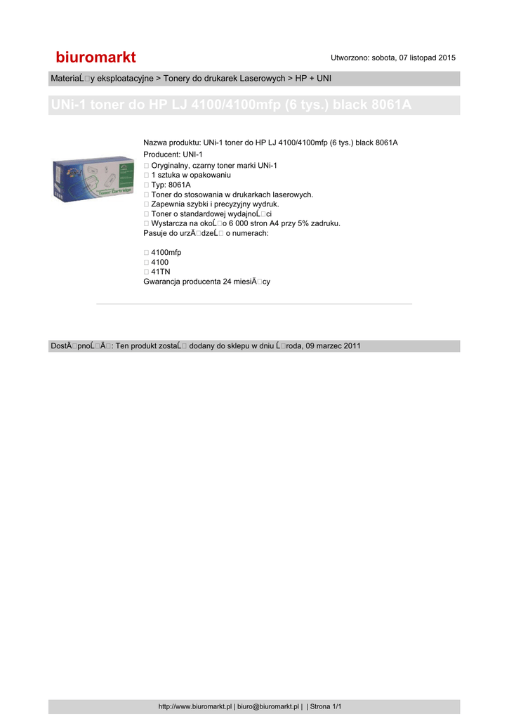 biuromarkt Utworzono: sobota, 07 listopad 2015 MateriaĹ y eksploatacyjne > Tonery do drukarek Laserowych > HP + UNI UNi-1 toner do HP LJ 4100/4100mfp (6 tys.) black 8061A Nazwa produktu: UNi-1 toner do HP LJ 4100/4100mfp (6 tys.) black 8061A Producent: UNI-1 Oryginalny, czarny toner marki UNi-1 1 sztuka w opakowaniu Typ: 8061A Toner do stosowania w drukarkach laserowych. Zapewnia szybki i precyzyjny wydruk. Toner o standardowej wydajnoĹ ci Wystarcza na okoĹ o 6 000 stron A4 przy 5% zadruku. Pasuje do urzÄ dzeĹ o numerach: 4100mfp 4100 41TN Gwarancja producenta 24 miesiÄ cy DostÄ pnoĹ Ä : Ten produkt zostaĹ dodany do sklepu w dniu Ĺ roda, 09 marzec 2011 http://www.biuromarkt.pl | [email protected] | | Strona 1/1