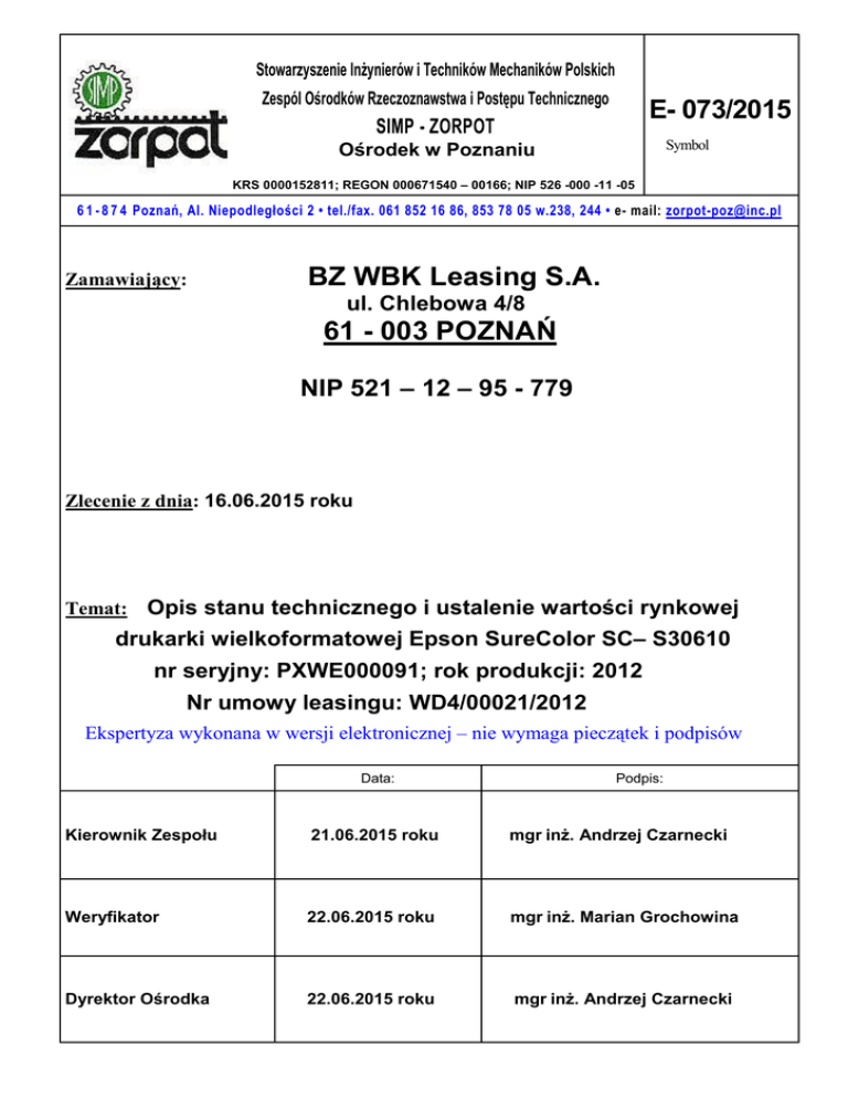 Stowarzyszenie InŜynierów i Techników Mechaników Polskich Zespól Ośrodków Rzeczoznawstwa i Postępu Technicznego E- 073/2015 SIMP - ZORPOT Symbol Ośrodek w Poznaniu KRS 0000152811; REGON 000671540 – 00166; NIP 526 -000 -11 -05 6 1 - 8 7 4 Poznań, Al. Niepodległości 2 • tel./fax. 061 852 16 86, 853 78 05 w.238, 244 • e- mail: [email protected] Zamawiający: BZ WBK Leasing S.A. ul. Chlebowa 4/8 61 - 003 POZNAŃ NIP 521 – 12 – 95 - 779 Zlecenie z dnia: 16.06.2015 roku Temat: Opis stanu technicznego i ustalenie wartości rynkowej drukarki wielkoformatowej Epson SureColor SC– S30610 nr seryjny: PXWE000091; rok produkcji: 2012 Nr umowy leasingu: WD4/00021/2012 Ekspertyza wykonana w wersji elektronicznej – nie wymaga pieczątek i podpisów Data: Podpis: Kierownik Zespołu 21.06.2015 roku mgr inŜ. Andrzej Czarnecki Weryfikator 22.06.2015 roku mgr inŜ. Marian Grochowina Dyrektor Ośrodka 22.06.2015 roku mgr inŜ. Andrzej Czarnecki ZORPOT – POZNAŃ Al. Niepodległości 2 61 874 Poznań 061/852 16 86, 853 78 05 wew. 238, 244; e-mail: [email protected] 2 WYCIĄG Z OPRACOWANIA: OKREŚLENIE SZACUNKOWEJ WARTOŚCI RYNKOWEJ PRZEDMIOTU OSZACOWANIA DLA POTRZEB SPRZEDAśY L. Nazwa środka technicznego, p. Dane identyfikacyjne 1 Szacunkowa wartość rynkowa w zł netto Drukarka wielkoformatowa Epson SureColor SC-S30610 Nr seryjny: PXWE000091, rok produkcji: 2012 Producent: SEIKO EPSON CORPORATION Ltd. Chiny WARTOŚĆ OGÓŁEM: 37 700,00 37 700,00 Oszacowana bieŜąca wartość drukarki wielkoformatowej Epson SureColor S30610, Nr seryjny: PXWE000091, rok produkcji: 2012 wynosi: WR = 37 700,00 zł netto słownie: trzydzieści siedem tysięcy siedemset zł netto Poznań, dnia 21.06.2015 roku Rzeczoznawca SIMP mgr inŜ. Andrzej Czarnecki Nr Cert. 9790 ZORPOT – POZNAŃ Al. Niepodległości 2 61 874 Poznań 061/852 16 86, 853 78 05 wew. 238, 244; e-mail: [email protected] 3 1. PODSTAWA FORMALNA Podstawą formalną opracowania jest zlecenie BZWBK Leasing S.A. ul. Chlebowa 4/8 61-003 Poznań z dnia 16.06.2015r. 2. PODSTAWA MERYTORYCZNA - Standardy Zawodowe Rzeczoznawców Majątkowych – standard VI.1 - Standardy Zawodowe Rzeczoznawców Majątkowych SIMP - Ustawa z dnia 29 sierpnia 1997r. Prawo bankowe Dz.U. Nr140 poz. 939, z późniejszymi zmianami - Ustawa z dnia 23 sierpnia 2001r. o zmianie ustawy Prawo bankowe oraz o zmianie innych ustaw. Dz. U. Nr 111 z 2001 r., poz. 1195. - Ustawa z dnia 29 sierpnia 1997r. o listach zastawnych i bankach hipotecznych, tekst jednolity Dz. U. nr 99 z 2003r. poz. 919. - Ustawa z dn. 23.04.1964r – Kodeks Cywilny Dz. U. nr 16 poz. 93 z 1964r z późniejszymi zmianami, - informacje z rynku wtórnego dotyczące drukarek wielkoformatowych - własne doświadczenia i baza danych. MATERIAŁY POMOCNICZE : - Cenniki WACETOB, BISTYP – Maszyny i urządzenia, informacje od producentów, oraz informatory branŜowe , - Oferty kupna – sprzedaŜy z firm specjalistycznych zajmującymi się zbytem nowych i uŜywanych urządzeń do będących przedmiotem oszacowania o zbliŜonych parametrach, - informacje uzyskane z Internetu: www.epson.pl, www.swiatobrazu.pl/wielkogabarytowy www.drukarkiwielkoformatowe.com ,www.allegro.pl , www.pcworld.pl , www.cortland.pl www.swiatdruku.eu ,http:/dodruku24.pl/drukarki-epson/epson-SureColor-SC-S30610/html - bank danych autora i ZORPOT Poznań, - Stowarzyszenie InŜynierów i Techników Mechaników Polskich – materiały z konferencji nt. SZACOWANIE WARTOŚCI TECHNICZNEGO MAJĄTKU RUCHOMEGO Łódź – Arturówek 5-6 czerwca 2001 - J. Napiórkowski – R. Źróbek –Metody wyceny maszyn i urządzeń – wydanie Zachodnie Wydawnictwo Organizacji – Zielona Góra2001 3. Zakres opracowania. Wizja lokalna, Identyfikacja maszyny, Opis i ocena stanu technicznego, Wycena wartości rynkowej, Wykonanie dokumentacji fotograficznej. ZORPOT – POZNAŃ Al. Niepodległości 2 61 874 Poznań 061/852 16 86, 853 78 05 wew. 238, 244; e-mail: [email protected] 4 4.CEL OPRACOWANIA Opracowanie ma na celu ustalenie wartości rynkowej dla celów sprzedaŜy na rynku wtórnym. 5. Przedmiot wyceny: drukarka wielkoformatowa Epson, SureColor SC-S30610 Drukarka wielkoformatowa firmy Epson, model SureColor SC-S30610 Opis drukarki: Drukarka wielkoformatowa Epson SureColor SC-S30610 Skonstruowana od początku z myślą o wydajnej i przyjaznej dla środowiska produkcji po najniŜszym całkowitym koszcie uŜytkowania, drukarka SC-S30610 umoŜliwia drukarniom, producentom reklamy wielkoformatowej, punktom usługowym zajmującym się drukiem cyfrowym i centrom powielania poszerzenie gamy oferowanych usług. Posiada większe moŜliwości niŜ dotychczasowe rozwiązania: Drukarka SC-S30610 moŜe drukować wszystko począwszy od plakatów, znaków, bannerów, podświetlanych paneli i materiałów POS po folię do oklejania pojazdów, dekoracji wnętrz i elementów wystaw targowych. Wszechstronność drukarki jest zauwaŜalna między innymi dzięki obsłudze szerokiej gamy mediów. Z powodzeniem ZORPOT – POZNAŃ Al. Niepodległości 2 61 874 Poznań 061/852 16 86, 853 78 05 wew. 238, 244; e-mail: [email protected] 5 moŜna drukować na winylu, płótnie a takŜe na folii do podświetleń (backlite), papierze fotograficznym oraz na popularnych podłoŜach stosowanych przy produkcji bannerów o maksymalnej szerokości 162,6 centymetrów. Łatwa w obsłudze Dzięki podnośnikowi umieszczonemu z tyłu ładowanie nowej rolki jest zadaniem tylko dla jednej osoby, a napręŜenie nośników moŜe być z łatwością nadzorowane z przodu i z tyłu drukarki, redukując czas potrzebny na ustawienie urządzenia i maksymalizując wydajność. Większa wydajność Wysokonakładowe prace są wykonywane z łatwością dzięki marce Epson, która zapewnia wydajność, niezawodność i ergonomiczną obsługę urządzenia. W zaleŜności od trybu pracy drukarki SC-S30610 moŜe ona drukować z prędkością od 7,3 m2/godzinę do 29,4m2/godzinę. NiŜsze koszty i mniejszy wpływ na ś