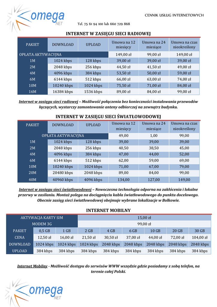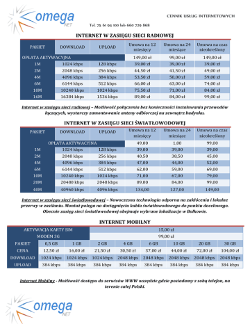 CENNIK USŁUG INTERNETOWYCH Tel. 75 61 94 100 lub 660 729 868 INTERNET W ZASIĘGU SIECI RADIOWEJ PAKIET DOWNLOAD UPLOAD Umowa na 12 miesięcy Umowa na 24 miesiące Umowa na czas nieokreślony 149,00 zł 99,00 zł 149,00 zł OPŁATA AKTYWACYJNA 1M 1024 kbps 128 kbps 39,00 zł 39,00 zł 39,00 zł 2M 2048 kbps 256 kbps 44,50 zł 41,50 zł 49,00 zł 4M 4096 kbps 384 kbps 53,50 zł 50,00 zł 59,00 zł 6M 6144 kbps 512 kbps 66,00 zł 63,00 zł 74,00 zł 10M 10240 kbps 1024 kbps 75,50 zł 71,00 zł 84,00 zł 16M 16384 kbps 1536 kbps 89,00 zł 84,00 zł 99,00 zł Internet w zasięgu sieci radiowej – Możliwość połączenia bez konieczności instalowania przewodów łączących, wystarczy zamontowanie anteny odbiorczej na zewnątrz budynku. INTERNET W ZASIĘGU SIECI ŚWIATŁOWODOWEJ PAKIET DOWNLOAD UPLOAD Umowa na 12 miesięcy Umowa na 24 miesiące Umowa na czas nieokreślony 49,00 1,00 99,00 OPŁATA AKTYWACYJNA 1M 1024 kbps 128 kbps 39,00 39,00 39,00 2M 2048 kbps 256 kbps 40,50 38,50 45,00 4M 4096 kbps 384 kbps 47,00 44,00 52,00 6M 6144 kbps 512 kbps 62,00 59,00 69,00 10M 10240 kbps 1024 kbps 71,00 67,00 79,00 20M 20480 kbps 2048 kbps 89,00 84,00 99,00 40M 40960 kbps 4096 kbps 134,00 127,00 149,00 Internet w zasięgu sieci światłowodowej – Nowoczesna technologia odporna na zakłócenia i lokalne przerwy w zasilaniu. Montaż polega na dociągnięciu kabla światłowodowego do punktu docelowego. Obecnie zasięg sieci światłowodowej obejmuje wybrane lokalizacje w Bolkowie. INTERNET MOBILNY AKTYWACJA KARTY SIM 15,00 zł MODEM 3G 99,00 zł PAKIET 0,5 GB 1 GB 2 GB 4 GB 6 GB 10 GB 20 GB 30 GB CENA 12,50 zł 16,00 zł 21,50 zł 30,50 zł 37,00 zł 44,00 zł 72,00 zł 104,00 zł DOWNLOAD 1024 kbps 1024 kbps 1024 kbps 2048 kbps 2048 kbps 2048 kbps 2048 kbps 2048 kbps UPLOAD 384 kbps 384 kbps 384 kbps 384 kbps 384 kbps 384 kbps 384 kbps 384 kbps Internet Mobilny - Możliwość dostępu do serwisów WWW wszędzie gdzie posiadamy z sobą telefon, na terenie całej Polski. CENNIK USŁUG POZOSTAŁYCH TELEFONIA VOIP Podstawowy 99,00zł Komfortowy 99,00zł Zaawansowany 99,00zł 12,30 zł 22,00zł 39,00zł 60 200 500 Połączenia wewnątrz sieci OmegaNet 0,03zł 0,03zł 0,02zł Połączenia lokalne i międzymiastowe 0,09zł 0,08zł 0,07zł Połączenia na komórki 0,42zł 0,41zł 0,39zł Aktywacja usługi Abonament Liczba darmowych minut w abonamencie Telefonia VoIP - Technika umożliwiająca przesyłanie dźwięków mowy za pomocą łączy internetowych lub dedykowanych sieci wykorzystujących protokół IP, popularnie nazywana "telefonią internetową". TNK – TELEWIZJA NA KARTĘ Okres trwania umowy Zestaw Instalacyjny 12 miesięcy 24 miesiące Abonament Standard 30,00 zł 25,00 zł Zestaw instalacyjny składa się z anteny satelitarnej, dekodera oraz karty. WYSOKOŚĆ RABATÓW PRZY WYBORZE KILKU USŁUG INTERNET 1 USŁUGA 2 USŁUGI 3 USŁUGI 4 USŁUGI INTERNET MOBILNY TELEFONIA VOIP TELEWIZJA TNK RABAT 0% RABAT 15 % RABAT 25% RABAT 35% POZOSTAŁE OPŁATY Router Standard N 150 mbps 80,00 zł Router Standard N 300 mbps 99,00 zł Wymiana anteny na 5GHz w technologii N umowa 12 miesięcy 149,00 zł Wymiana anteny na 5GHz w technologii N umowa 24 miesiące 99,00 zł Przeniesienie Instalacji (jeśli istnieje możliwość) 50,00 zł Zawieszenie usług na okres nie dłuższy niż 3 miesiące w roku 5,29 zł za m/c Nieuzasadnione wezwanie serwisu 30,00 zł Rozwiązanie umowy przed terminem upływu 100,00 zł Aktywacja usługi dla abonenta posiadającego własny zestaw abonencki 10,00 zł Zmiana abonamentu na niższy 20,00 zł Interwencja serwisowa w domu abonenta za każdą rozpoczętą godzinę 30,00 zł Ponowne przyłączenie do sieci (opóźnienia w spłatach do 60pracy dni) 12,30 zł Ponowne przyłączenie do sieci (odłączono z powodu braku wpłat) 100,00 zł