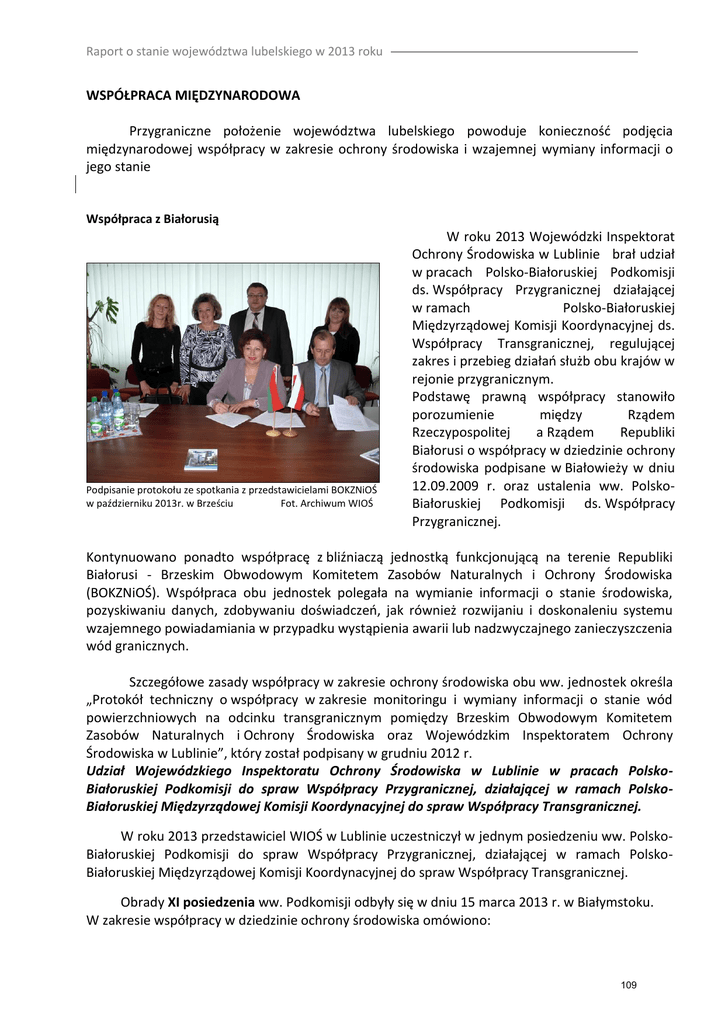 Raport o stanie województwa lubelskiego w 2013 roku WSPÓŁPRACA MIĘDZYNARODOWA Przygraniczne położenie województwa lubelskiego powoduje konieczność podjęcia międzynarodowej współpracy w zakresie ochrony środowiska i wzajemnej wymiany informacji o jego stanie Współpraca z Białorusią Podpisanie protokołu ze spotkania z przedstawicielami BOKZNiOŚ w październiku 2013r. w Brześciu Fot. Archiwum WIOŚ W roku 2013 Wojewódzki Inspektorat Ochrony Środowiska w Lublinie brał udział w pracach Polsko-Białoruskiej Podkomisji ds. Współpracy Przygranicznej działającej w ramach Polsko-Białoruskiej Międzyrządowej Komisji Koordynacyjnej ds. Współpracy Transgranicznej, regulującej zakres i przebieg działań służb obu krajów w rejonie przygranicznym. Podstawę prawną współpracy stanowiło porozumienie między Rządem Rzeczypospolitej a Rządem Republiki Białorusi o współpracy w dziedzinie ochrony środowiska podpisane w Białowieży w dniu 12.09.2009 r. oraz ustalenia ww. PolskoBiałoruskiej Podkomisji ds. Współpracy Przygranicznej. Kontynuowano ponadto współpracę z bliźniaczą jednostką funkcjonującą na terenie Republiki Białorusi - Brzeskim Obwodowym Komitetem Zasobów Naturalnych i Ochrony Środowiska (BOKZNiOŚ). Współpraca obu jednostek polegała na wymianie informacji o stanie środowiska, pozyskiwaniu danych, zdobywaniu doświadczeń, jak również rozwijaniu i doskonaleniu systemu wzajemnego powiadamiania w przypadku wystąpienia awarii lub nadzwyczajnego zanieczyszczenia wód granicznych. Szczegółowe zasady współpracy w zakresie ochrony środowiska obu ww. jednostek określa „Protokół techniczny o współpracy w zakresie monitoringu i wymiany informacji o stanie wód powierzchniowych na odcinku transgranicznym pomiędzy Brzeskim Obwodowym Komitetem Zasobów Naturalnych i Ochrony Środowiska oraz Wojewódzkim Inspektoratem Ochrony Środowiska w Lublinie”, który został podpisany w grudniu 2012 r. Udział Wojewódzkiego Inspektoratu Ochrony Środowiska w Lublinie w pracach PolskoBiałoruskiej Podkomisji do spraw Współpracy Przygranicznej, działającej w ramach PolskoBiałoruskiej Międzyrządowej Komisji Koordynacyjnej do spraw Współpracy Transgranicznej. W roku 2013 przedstawiciel WIOŚ w Lublinie uczestniczył w jednym posiedzeniu ww. PolskoBiałoruskiej Podkomisji do spraw Współpracy Przygranicznej, działającej w ramach PolskoBiałoruskiej Międzyrządowej Komisji Koordynacyjnej do spraw Współpracy Transgranicznej. Obrady XI posiedzenia ww. Podkomisji odbyły się w dniu 15 marca 2013 r. w Białymstoku. W zakresie współpracy w dziedzinie ochrony środowiska omówiono: 109 Raport o stanie województwa lubelskiego w 2013 roku - realizację zapisów X posiedzenia ww. Podkomisji, - współpracę polsko-białoruskich służb ochrony środowiska, - realizację monitoringu wód powierzchniowych na odcinkach granicznych rzeki Bug i jej dopływach, - zatwierdzenie protokołu technicznego o współpracy w zakresie monitoringu i wymiany informacji o stanie środowiska wód powierzchniowych na odcinku transgranicznym. Podkomisja przyjęła sprawozdanie z ustaleń podjętych podczas X posiedzenia Podkomisji oraz zobowiązała służby ochrony środowiska do kontynuowania współpracy. Kolejne, XII posiedzenie ww. Podkomisji, odbyło się w dniu 29 listopada 2013 r. w Brześciu (Republika Białorusi). Wojewódzki Inspektorat Ochrony Środowiska w Lublinie uzgadniał dokumenty oraz przygotował prezentację dotyczącą przebiegu współpracy z Brzeskiem Obwodowym Komitetem Zasobów Naturalnych i Ochrony Środowiska. Stanowisko WIOŚ w Lublinie na posiedzeniu podkomisji reprezentował Podlaski Wojewódzki Inspektor Ochrony Środowiska – Pani Grażyna Żyła – Pietkiewicz. W części dotyczącej współpracy w dziedzinie ochrony środowiska omówiono: - realizację zapisów XI posiedzenia Podkomisji przez stronę polską i białoruską, - współpracę służb ochrony środowiska na wodach granicznych, - problemy związane z przekraczaniem granicy w ramach wspólnych spotkań roboczych. Podkomisja, po przyjęciu sprawozdania z realizacji ustaleń podjętych podczas XI posiedzenia, wskazała potrzebę kontynuowania współpracy przygranicznej w zakresie monitoringu wód granicznych. Strony zobowiązane zostały do rozpatrzenia sprawy wydania broszury o stanie wód powierzchniowych na odcinku granicznym pod kątem możliwości technicznych i finansowych. Ponadto podkomisja zobowiązała strony do rozszerzenia współpracy w zakresie stworzenia transgranicznych ochronionych naturalnych obszarów oraz podjęcia działań zapewniających sprawne przekraczanie granicy. Współpraca Wojewódzkiego Inspektoratu Ochrony Środowiska w Lublinie z Brzeskim Obwodowym Komitetem Zasobów Naturalnych i Ochrony Środowiska w Brześciu (Republika Białorusi). Wojewódzki Inspektorat Ochrony Środowiska w Lublinie w roku 2013 odbył dwa spotkania z przedstawicielami Brzeskiego Obwodowego Komitetu Zasobów Naturalnych i Ochrony Środowiska. Jedno ze spotkań odbyło się po stronie polskiej (w dniu 16.04.2013 r. w Białej Podlaskiej) i jedno po stronie białoruskiej (w dniu 29.10.2013 r. w Brześciu). Spotkania te były wynikiem realizacji ustaleń ww. Podkomisji ds. Współpracy Przygranicznej. Głównym ich celem była wymiana doświadczeń w zakresie transgranicznej kontroli stanu środowiska i szybkiego informowania o ewentualnych zagrożeniach. Podczas spotkań zrealizowanych w 2013 roku dokonano 2 wspólnych poborów wód rzeki Bug na odcinku granicznym oraz omówiono następujące tematy: uzgodniono i przedstawiono założenia realizacji monitoringu wód rzeki Bug oraz jej głównych dopływów w roku 2013, zaprezentowano i omówiono wyniki badań wód rzeki Bug przeprowadzonych podczas wspólnych poborów, które odbyły się w dniu w dniu 10.10.2012 r. oraz 16.04.2013 r., zaprezentowało i omówiono wyniki badań odcinka granicznego wód rze