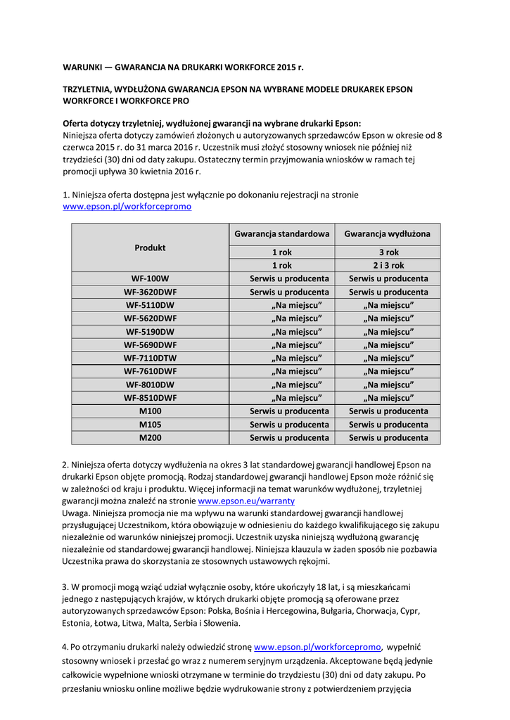WARUNKI — GWARANCJA NA DRUKARKI WORKFORCE 2015 r