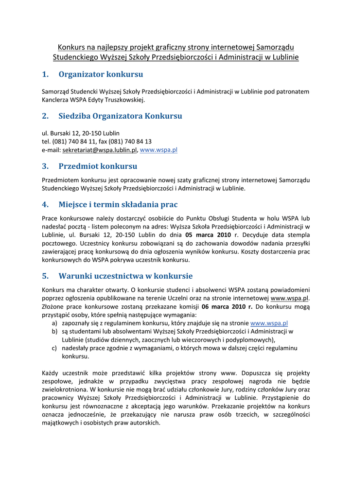 Konkurs na najlepszy projekt graficzny strony internetowej Samorządu Studenckiego Wyższej Szkoły Przedsiębiorczości i Administracji w Lublinie 1. Organizator konkursu Samorząd Studencki Wyższej Szkoły Przedsiębiorczości i Administracji w Lublinie pod patronatem Kanclerza WSPA Edyty Truszkowskiej. 2. Siedziba Organizatora Konkursu ul. Bursaki 12, 20‐150 Lublin tel. (081) 740 84 11, fax (081) 740 84 13 e‐mail: [email protected], www.wspa.pl 3. Przedmiot konkursu Przedmiotem konkursu jest opracowanie nowej szaty graficznej strony internetowej Samorządu Studenckiego Wyższej Szkoły Przedsiębiorczości i Administracji w Lublinie. 4. Miejsce i termin składania prac Prace konkursowe należy dostarczyć osobiście do Punktu Obsługi Studenta w holu WSPA lub nadesłać pocztą ‐ listem poleconym na adres: Wyższa Szkoła Przedsiębiorczości i Administracji w Lublinie, ul. Bursaki 12, 20‐150 Lublin do dnia 05 marca 2010 r. Decyduje data stempla pocztowego. Uczestnicy konkursu zobowiązani są do zachowania dowodów nadania przesyłki zawierającej pracę konkursową do dnia ogłoszenia wyników konkursu. Koszty dostarczenia prac konkursowych do WSPA pokrywa uczestnik konkursu. 5. Warunki uczestnictwa w konkursie Konkurs ma charakter otwarty. O konkursie studenci i absolwenci WSPA zostaną powiadomieni poprzez ogłoszenia opublikowane na terenie Uczelni oraz na stronie internetowej www.wspa.pl. Złożone prace konkursowe zostaną przekazane komisji 06 marca 2010 r. Do konkursu mogą przystąpić osoby, które spełnią następujące wymagania: a) zapoznały się z regulaminem konkursu, który znajduje się na stronie www.wspa.pl b) są studentami lub absolwentami Wyższej Szkoły Przedsiębiorczości i Administracji w Lublinie (studiów dziennych, zaocznych lub wieczorowych i podyplomowych), c) nadesłały prace zgodnie z wymaganiami, o których mowa w dalszej części regulaminu konkursu. Każdy uczestnik może przedstawić kilka projektów strony www. Dopuszcza się projekty zespołowe, jednakże w przypadku zwycięstwa pracy zespołowej nagroda nie będzie zwielokrotniona. W konkursie nie mogą brać udziału członkowie Jury, rodziny członków Jury oraz pracownicy Wyższej Szkoły Przedsiębiorczości i Administracji w Lublinie. Przystąpienie do konkursu jest równoznaczne z akceptacją jego warunków. Przekazanie projektów na konkurs oznacza jednocześnie, że przekazujący nie narusza praw osób trzecich, w szczególności majątkowych i osobistych praw autorskich. 6. Warunki techniczne a) Projekty prac konkursowych należy przesyłać w postaci wydruku projektu w wersji kolorowej. Należy również dołączyć do wydruków zapis na nośniku elektronicznym na płycie CD (opatrzone imieniem i nazwiskiem). Każda praca konkursowa musi się znajdować w zamkniętym opakowaniu, oznaczonym wyłącznie godłem autora oraz dopiskiem „Konkurs na projekt graficzny strony internetowej SS WSPA”. Prace należy opatrzyć godłem złożonym z sześciu cyfr (wpisanych w prawym dolnym rogu planszy). b) Każda praca konkursowa musi być oznaczona odrębnym godłem. 7. Kryteria oceny prac konkursowych Jury dokonuje oceny prac konkursowych zgodnie z następującymi kryteriami: • Praca nad nową szatą graficzną może być realizowana przy użyciu dowolnego oprogramowania. • Rozdzielczość pracy 1024x 768 • Wynikiem pracy powinien być plik w formacie BMP lub JPG (nieskompresowany) – prace w Adobe PhotoShop lub Point Shop Pro bardzo mile widziane. • W nowej szacie graficznej powinny znajdować się następujące linki/przyciski (dozwolona zmiana nazwy linku na inną o podobnym znaczeniu): o AKTUALNOŚCI / KOMUNIKATY o LUDZIE o WYDARZENIA o GALERIE o O SAMORZADZIE o PARTNERZY o DZIAŁ STUDENCKI o KONTAKT/DYŻURY • Na stronie głównej powinno znaleźć się miejsce na najświeższe informacje oraz banery. • W projekcie oceniane będą zarówno walory estetyczne jak i funkcjonalne strony. 8. Jury 1. Prace zostaną poddane ocenie przez Komisję Konkursową w składzie: a. Kanclerz WSPA – Edyta Truszkowska b. Dyrektor Działu Marketingu – Anna Selwa c. Webmaster /grafik – Marcin Stelmaszczuk d. Asystent ds. informatyki – Bernard Bondos e. Przewodnicząca Samorządu Studenckiego ‐ Katarzyna Krupińska f. Obsługa informatyczna WSPA – Janusz Olek g. Członek Samorządu Studenckiego – ………………………………………………. 2. Jury większością głosów wyłania zwycięzcę konkursu, któremu przyznaje Nagrodę Główną, oraz przyznaje dwie nagrody dodatkowe: Nagrodę Drugą i Nagrodę Trzecią. 3. Z przebiegu konkursu Jury sporządza protokół i na którego podstawie zostaną wręczone nagrody. 9. Nagrody Jury przyzna nagrody: 1. Nagroda Pierwsza ‐ Główna – Netbook o wartości około 1200 zł brutto. 2. Nagroda Dodatkowa ‐ Druga – MP3/MP4 ‐ Creative Labs Zen 8GB – o wartości około 450 zł brutto. 3. Nagroda Dodatkowa ‐ Trzecia – Pendrive ‐ SanDisk Cruzer Contour 16GB RB – o wartości około 270 zł brutto. 10. Rozstrzygnięcie konkursu Planowana data ogłoszenia wyników prac komisji to 12 marca 2010 roku. Wyniki konkursu zostaną podane do wiadomości publicznej na stronie internetowej Wyższej Szkoły Przedsiębiorczości i Administracji w Lublinie. Autorzy nagrodzonych prac zostaną poinformowani o zwycięstwie listownie i telefonicznie. 11. Postanowienia końcowe 1. Członkowie Jury nie mogą zadawać tematu konkursu jako zadania dydaktycznego, ani udzielać konsultacji w tym zakresie. 2. Prace konkursowe niespełniające wymagań, o których mowa w regulaminie konkursu lub nadesłane po upływie terminu, nie będą podlegały ocenie Jury. 3. Autor najlepszego projektu zobowiązany jest do przeniesienia na WSPA majątkowych praw autorskich do opracowanego przez siebie projektu graficznego strony internetowej oraz prawa własności egzemplarzy utworu złożonych w ramach konkursu. W tym celu Autor zawrze z WSPA u