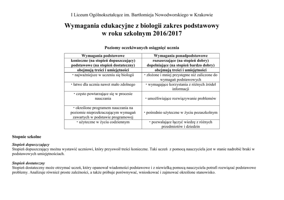 I Liceum Ogólnokształcące im. Bartłomieja Nowodworskiego w Krakowie Wymagania edukacyjne z biologii zakres podstawowy w roku szkolnym 2016/2017 Poziomy oczekiwanych osiągnięć ucznia Wymagania podstawowe konieczne (na stopień dopuszczający) podstawowe (na stopień dostateczny) obejmują treści i umiejętności najważniejsze w uczeniu się biologii łatwe dla ucznia nawet mało zdolnego często powtarzające się w procesie nauczania określone programem nauczania na poziomie nieprzekraczającym wymagań zawartych w podstawie programowej użyteczne w życiu codziennym Wymagania ponadpodstawowe rozszerzające (na stopień dobry) dopełniające (na stopień bardzo dobry) obejmują treści i umiejętności złożone i mniej przystępne niż zaliczone do wymagań podstawowych wymagające korzystania z różnych źródeł informacji umożliwiające rozwiązywanie problemów pośrednio użyteczne w życiu pozaszkolnym pozwalające łączyć wiedzę z różnych przedmiotów i dziedzin Stopnie szkolne Stopień dopuszczający Stopień dopuszczający można wystawić uczniowi, który przyswoił treści konieczne. Taki uczeń z pomocą nauczyciela jest w stanie nadrobić braki w podstawowych umiejętnościach. Stopień dostateczny Stopień dostateczny może otrzymać uczeń, który opanował wiadomości podstawowe i z niewielką pomocą nauczyciela potrafi rozwiązać podstawowe problemy. Analizuje również proste zależności, a także próbuje porównywać, wnioskować i zajmować określone stanowisko. Stopień dobry Stopień dobry można wystawić uczniowi, który przyswoił treści rozszerzające, właściwie stosuje terminologię przedmiotową, a także wiadomości w sytuacjach typowych wg wzorów znanych z lekcji i podręcznika, rozwiązuje typowe problemy z wykorzystaniem poznanych metod, samodzielnie pracuje z podręcznikiem i materiałem źródłowym oraz aktywnie uczestniczy w zajęciach. Stopień bardzo dobry Stopień bardzo dobry może otrzymać uczeń, który opanował treści dopełniające. Potrafi on samodzielnie interpretować zjawiska oraz bronić swych poglądów. Stopień celujący Stopień celujący może otrzymać uczeń, który opanował treści wykraczające poza informacje zawarte w podręczniku. Potrafi on selekcjonować i hierarchizować wiadomości, z powodzeniem bierze udział w konkursach i olimpiadach przedmiotowych, a także pod okiem nauczyciela prowadzi własne prace badawcze Wymagania edukacyjne. Zakres podstawowy Dział programu I. Od genu do cechy Lp. Temat Poziom wymagań konieczny (K) podstawowy (P) rozszerzający (R) • wyjaśnia, z czego wynika komplementarność zasad • przedstawia graficznie regułę komplementarności zasad • wykazuje, że replikacja DNA ma charakter semikonserwatywny • wykazuje związek między kwasami nukleinowymi a cechami organizmów • przedstawia za pomocą schematycznego rysunku budowę nukleotydu DNA i RNA • wyjaśnia różnicę między eksonem a intronem • omawia organizację materiału genetycznego w jądrze komórkowym • wskazuje i nazywa miejsca występowania DNA w komórkach prokariotycznych i eukariotycznych • opisuje budowę chromatyny • charakteryzuje budowę i rodzaje chromosomów w kariotypie człowieka • określa rolę polimerazy DNA w replikacji DNA • wykazuje rolę replikacji DNA w zachowaniu niezmienionej informacji genetycznej • uzasadnia konieczność zachodzenia procesu replikacji DNA przed podziałem komórki • analizuje schemat przepływu informacji genetycznej • odczytuje kolejność aminokwasów kodowanych przez dany fragment mRNA • oblicza liczbę nukleotydów i kodonów kodujących określoną liczbę aminokwasów oraz liczbę aminokwasów 1 Budowa i funkcje kwasów nukleinowych • określa rolę DNA jako nośnika informacji genetycznej • wymienia elementy budowy DNA i RNA • wymienia zasady azotowe wchodzące w skład obu typów kwasów nukleinowych • definiuje pojęcia: genetyka, nukleotyd • wymienia rodzaje RNA • definiuje pojęcia: inżynieria genetyczna, replikacja DNA • wyjaśnia regułę komplementarności zasad • omawia proces replikacji DNA • określa rolę poszczególnych rodzajów RNA • porównuje budowę i rolę DNA z budową i rolą RNA • rozpoznaje na modelu lub ilustracji DNA i RNA 2 Geny i genomy • definiuje pojęcia: gen, genom, chromosom, chromatyna, kariotyp, pozagenowy DNA • przedstawia budowę chromosomu • wymienia organelle komórki zawierające DNA 3 Kod genetyczny • wyjaśnia pojęcia: kod genetyczny, kodon • wymienia cechy kodu genetycznego • definiuje pojęcia: nukleosom, chromosom homologiczny, komórka haploidalna, komórka diploidalna • podaje liczbę chromosomów w komórkach somatycznych i rozrodczych człowieka • oblicza liczbę chromosomów w komórce haploidalnej, znając liczbę chromosomów w komórce diploidalnej danego organizmu • omawia sposób zapisania informacji genetycznej w DNA • wyjaśnia znaczenie kodu genetycznego dopełniający (D) • uzasadnia różnice w budowie genomów bakterii i organizmów jądrowych • podaje przykłady wykorzystania badań DNA w różnych dziedzinach życia człowieka • charakteryzuje cechy kodu genetycznego przy pomocy tabeli kodu genetycznego • nazywa cechy kodu genetycznego na podstawie schematów • wskazuje i nazywa poszczególne etapy ekspresji genów w komórce • określa znaczenie struktury przestrzennej dla funkcjonalności białek • opisuje budowę cząsteczki tRNA • omawia rolę rybosomów w ekspresji genu • omawia badania Mendla • wyjaśnia mechanizm dziedziczenia cech zgodnie z I i II prawem Mendla • wykonuje krzyżówki genetyczne dotyczące dziedziczenia dwóch genów • interpretuje krzyżówki genetyczne, używając określeń homozygota, heterozygota, cecha dominująca, cecha recesywna • omawia przykłady innych sposobów dziedziczenia cech • podaje przykłady mechanizmów dziedziczenia płci u innych organizmów 