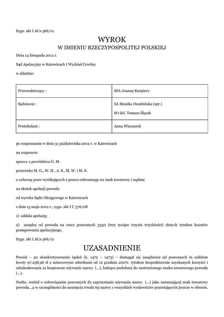 Sygn. akt I ACa 566/12 WYROK W IMIENIU RZECZYPOSPOLITEJ POLSKIEJ Dnia 14 listopada 2012 r. Sąd Apelacyjny w Katowicach I Wydział Cywilny w składzie: Przewodniczący : SSA Joanna Kurpierz Sędziowie : SA Monika Dembińska (spr.) SO del. Tomasz Ślęzak Protokolant : Anna Wieczorek po rozpoznaniu w dniu 31 października 2012 r. w Katowicach na rozprawie sprawy z powództwa G. M. przeciwko M. G., W. H., A. S., M. W. i M. S. o ochronę praw wynikających z prawa ochronnego na znak towarowy i zapłatę na skutek apelacji powoda od wyroku Sądu Okręgowego w Katowicach z dnia 15 maja 2012 r., sygn. akt I C 376/08 1) oddala apelację; 2) zasądza od powoda na rzecz pozwanych 3330 (trzy tysiące trzysta trzydzieści) złotych tytułem kosztów postępowania apelacyjnego. Sygn. akt I ACa 566/12 UZASADNIENIE Powód – po skonkretyzowaniu żądań (k. 1472 – 1473) – domagał się zasądzenia od pozwanych in solidum kwoty 97.238,96 zł z ustawowymi odsetkami od 12 grudnia 2007r. tytułem bezpodstawnie uzyskanych korzyści i odszkodowania za bezprawne używanie nazwy (...), łudząco podobnej do zastrzeżonego znaku towarowego powoda (...). Nadto, wniósł o zobowiązanie pozwanych do zaprzestania używania nazwy (...) jako naruszającej znak towarowy powoda, „a w szczególności do usunięcia trwale tej nazwy z wszystkich wydawnictw pozostających jeszcze w obrocie, a wydanych przez pozwanych tj. m.in. (...), (...), (...). Domagał się także zobowiązania pozwanych „do podania do publicznej wiadomości całości orzeczenia zapadłego w niniejszej sprawie, na ich koszt w periodykach o tematyce żeglarskiej: (...), (...) oraz gazecie lokalnej (...) w T., na stronie internetowej zespołu pozwanych i wskazanych przez powoda 3 portalach internetowych o tematyce żeglarskiej. Uzasadniając żądania podał, że w 1992 roku założył zespół artystyczny (...), wykonujący piosenki żeglarskie. W jego skład wchodzili również M. R., S. O., K. I. i P. W.. W listopadzie 1998 roku zespół opuścili K. I. i M. R., a w ich miejsce weszli pozwani M. G. i W. H.. W 2000 roku powód „zawiesił” na kilka miesięcy swoją działalność w zespole (ze względu na stan zdrowia), a w jego miejsce wszedł pozwany A. S.. W styczniu 2001 roku powód chciał wrócić do zespołu, lecz pozwani (wraz z ówczesnym członkiem zespołu (...)) odmówili powodowi prawa do uczestnictwa w grupie. Efektem tego było zastrzeżenie przez powoda znaku towarowego i nazwy (...) w Urzędzie Patentowym oraz rozpoczęcie przez pozwanych działalności pod łudząco podobną nazwą (...). W 2003 roku zespół opuścił S. O., który uczestniczył w pierwszym składzie grupy. Od tego czasu zespół składa się z osób, z których żadna nie uczestniczyła w jego założeniu. Powód jest właścicielem znaku towarowego, zastrzeżonego w Urzędzie Patentowym, obejmującego nazwę zespołu (...) oraz charakterystycznego logo (prawo ochronne (...)). Prawo ochronne zostało udzielone w klasach (...) oraz (...), uprawniających do produkcji płyt kompaktowych, kaset wideo i nośników z nagraniami audio – video, a także do organizacji imprez artystycznych, występów artystycznych, przygotowania materiału do produkcji fonograficznej, rejestrowania koncertów, imprez rozrywkowych, komponowania utworów muzycznych, komponowania tekstów artystycznych. Pozwani już w 2001 roku zostali wezwani do zaprzestania używania nazwy (...); powód podejmował także próby ugodowego załatwienia sporu, jednakże bez rezultatu. W związku z wieloletnim uporczywym naruszaniem przez pozwanych znaku towarowego powoda, poprzez posługiwanie się znakiem towarowym łudząco podobnym, pozwani uzyskali bezpodstawnie korzyści majątkowe w łącznej kwocie 95.689,56 zł (w okresie od 25.02.2001 r. do dnia 16.06.2008 r.). Są także zobowiązani do wyrównania strat związanych z uruchomieniem procedur zmierzających do ochrony znaku towarowego. Są to koszty wynagrodzenia rzecznika patentowego w kwocie 329,40 zł oraz koszt porady prawnej w kwocie 1220 zł. Suma tych należności (95.689,56 zł + 329,40 zł + 1220 zł) stanowi kwotę dochodzoną pozwem. Pozwani uzyskali także znaczne korzyści niematerialne poprzez przejęcie znaku towarowego, marki z nim związanej a prowadząc działalność artystyczną pod łudząco podobną nazwą celowo i świadomie wprowadzali swym działaniem w błąd odbiorców, co do pochodzenia twórczości i skutecznie uniemożliwili powodowi prowadzenie działalności artystycznej, promując się w środowisku artystycznym, w którym marka (...) była powszechnie znana i wiązana z powodem. W tych warunkach uzasadnione jest także w świetle przepisów Prawa własności przemysłowej żądanie nakazania pozwanym zaprzestania posługiwania się nazwą (...), łudząco podobną do znaku towarowego powoda. Z kolei żądanie dotyczące opublikowania treści orzeczenia jest uzasadnione chęcią odzyskania przez powoda należnego mu w środowisku artystów piosenki żeglarskiej prestiżu, na utratę którego został na skutek przedstawionych działań narażony. Pozwani wnieśli o oddalenie powództwa. Zarzucili, że większość twierdzeń podanych w pozwie „nie polega na prawdzie”; ponadto powód świadomie zataił pewne fakty mające istotne znaczenie dla sprawy. Bezspornym jest, że powód był jednym z założycieli zespołu artystycznego (...). Wbrew twierdzeniom pozwu, powód nie był liderem i kierownikiem zespołu do dnia 24 lutego 2001 r. Powód dobrowolnie opuścił zespół w lipcu 2000 roku; od tego dnia zaprzestał angażowania się w przedsięwzięcia realizowane przez zespół. Twierdzenia, iż zrezygnował z członkostwa w zespole z przyczyn zdrowotnych nie są prawdziwe. Powodem odejścia z zespołu był narastający konflikt między powodem a pozostałymi członkami. Nadto, wbrew twierdzeniom pozwu, powód nigdy nie zgłaszał członkom zespołu gotowości powrotu do zespołu. Do dnia podjęcia de