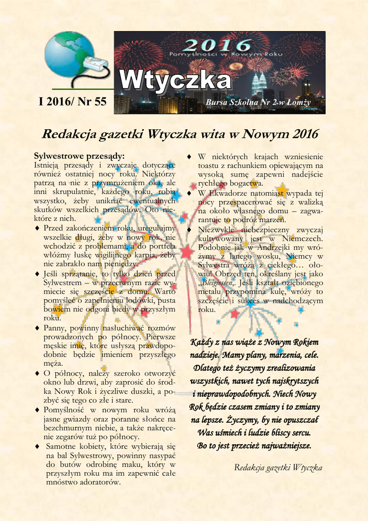 I 2016/ Nr 55 Bursa Szkolna Nr 2 w Łomży Redakcja gazetki Wtyczka wita w Nowym 2016 Sylwestrowe przesądy: Istnieją przesądy i zwyczaje dotyczące również ostatniej nocy roku. Niektórzy patrzą na nie z przymrużeniem oka, ale inni skrupulatnie, każdego roku, robią wszystko, żeby uniknąć ewentualnych skutków wszelkich przesądów. Oto niektóre z nich. Przed zakończeniem roku, uregulujmy wszelkie długi, żeby w nowy rok, nie wchodzić z problemami, a do portfela włóżmy łuskę wigilijnego karpia, żeby nie zabrakło nam pieniędzy. Jeśli sprzątanie, to tylko dzień przed Sylwestrem – w przeciwnym razie wymiecie się szczęście z domu. Warto pomyśleć o zapełnieniu lodówki, pusta bowiem nie odgoni biedy w przyszłym roku. Panny, powinny nasłuchiwać rozmów prowadzonych po północy. Pierwsze męskie imię, które usłyszą prawdopodobnie będzie imieniem przyszłego męża. O północy, należy szeroko otworzyć okno lub drzwi, aby zaprosić do środka Nowy Rok i życzliwe duszki, a pozbyć się tego co złe i stare. Pomyślność w nowym roku wróżą jasne gwiazdy oraz poranne słońce na bezchmurnym niebie, a także nakręcenie zegarów tuż po północy. Samotne kobiety, które wybierają się na bal Sylwestrowy, powinny nasypać do butów odrobinę maku, który w przyszłym roku ma im zapewnić całe mnóstwo adoratorów. W niektórych krajach wzniesienie toastu z rachunkiem opiewającym na wysoką sumę zapewni nadejście rychłego bogactwa. W Ekwadorze natomiast wypada tej nocy przespacerować się z walizką na około własnego domu – zagwarantuje to podróż marzeń. Niezwykle niebezpieczny zwyczaj kultywowany jest w Niemczech. Podobnie jak w Andrzejki my wróżymy z lanego wosku, Niemcy w Sylwestra wróżą z ciekłego… ołowiu! Obrzęd ten, określany jest jako „Bleigiessen‚. Jeśli kształt oziębionego metalu przypomina kulę, wróży to szczęście i sukces w nadchodzącym roku. Każdy z nas wiąże z Nowym Rokiem nadzieje. Mamy plany, marzenia, cele. Dlatego też życzymy zrealizowania wszystkich, nawet tych najskrytszych i nieprawdopodobnych. Niech Nowy Rok będzie czasem zmiany i to zmiany na lepsze. Życzymy, by nie opuszczał Was uśmiech i ludzie bliscy sercu. Bo to jest przecież najważniejsze. Redakcja gazetki Wtyczka Str. 2 Wtyczka Wtyczka Str. 3 Kodeks przeciw przemocy w cyberprzestrzeni Otrzymywanie obraźliwych i zastraszających wiadomości bądź czytanie nieprzyjemnych komentarze na swój temat w Internecie, może niepokoić. Ten kodeks wskaże, jak chronić siebie i swoich przyjaciół przed cyberprzemocą i poradzi, jak zgłosić, kiedy już do tego dojdzie. 1. Zawsze szanuj innych Pamiętaj, że kiedy wysyłasz komuś wiadomość nie możesz zobaczyć w jaki sposób Twoje słowa wpływają na drugą osobę. Dlatego ważne jest, aby zawsze okazywać szacunek innym i uważać na to, co się pisze w sieci lub jakie obrazy wysyła. To, co dla Ciebie jest zabawne komuś innemu może sprawić ból. Zawsze pytaj o pozwolenie zanim zrobisz komuś zdjęcie. Jeśli otrzymujesz niemiłe lub złośliwe wiadomości o kimś lub zdjęcia, nie przysyłaj ich dalej. Możesz w ten sposób uczestniczyć w znęcaniu się, a nawet zostać oskarżonym o cyberprzemoc. Możesz również w ten sposób złamać prawo. 2. Pomyśl zanim wyślesz Ważne jest, aby pomyśleć zanim wyślesz jakiekolwiek wiadomości o sobie przez email albo telefon komórkowy, albo zanim umieścisz je na stronie internetowej. Pamiętaj, że to co wyślesz może zostać upublicznione bardzo szybko i może zostać w sieci na zawsze. Czy naprawdę chcesz, aby Twoi nauczyciele, rodzice czy przyszli pracodawcy zobaczyli te zdjęcia? 3. Traktuj swoje hasło jak szczoteczkę do zębów – nie dziel się nim Nie podawaj nikomu swojego hasła. Dobrym pomysłem jest jego zmiana w regularnych odstępach czasu. Wybór trudnego do odgadnięcia hasła z symbolami lub numerami utrudni innym dostęp do Twojego konta i udawanie Ciebie. Pamiętaj, aby podawać numer komórki czy osobisty adres internetowy tylko zaufanym przyjaciołom. 4. Blokuj tyranów Większość odpowiedzialnych stron i serwisów umożliwia Ci blokowanie czy ujawnianie osób, które źle się zachowują. Zrób użytek z tych możliwości – są tam nie bez powodu! 5. Nie odwzajemniaj się i nie odpowiadaj Odpowiadanie na złośliwe wiadomości, na przykład w złości, jest tym, czego tyrani chcą. 6. Zachowaj dowody Naucz się, aby zachowywać rejestry obraźliwych wiadomości, zdjęć czy rozmów. Pomoże ci to pokazać innym co się dzieje i może być przydatne dla szkoły, telefonii komórkowych czy dla policji prowadzącej śledztwo związane z cyberprzemocą. Wtyczka Str. 4 Kącik dobrej książki Bardzo interesujący thriller, a może powinnam powiedzieć – dramat psychologiczny z wątkiem kryminalnym i świetnie nakreślonymi postaciami bohaterów oraz z nieprzewidywalnym zakończeniem. Autorka nie stworzyła powieści z nieprawdopodobnym tempem, ale i tak nie można się od niej oderwać. Zadowoli każdego wielbiciela gatunku. Grzeczna dziewczynka jest debiutem Mary Kubicy i jak na debiut zaskakująco dobra. Jestem ciekawa innych dokonań autorki. Tymczasem tę powieść gorąco polecam. Atmosfery powieści Mary Kubicy nie da się oddać w krótkiej recenzji. Grzeczną dziewczynkę należy samemu przeczytać! Nasza Redakcja: Grejman Kinga Kowalewska Karolina Stefanowska Anna Tadko Oliwia Opiekunowie: Monika Zaremba Sylwester Konopka