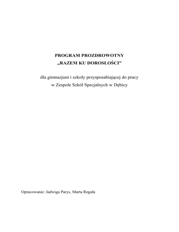 PROGRAM PROZDROWOTNY „RAZEM KU DOROSŁOŚCI” dla gimnazjum i szkoły przysposabiającej do pracy w Zespole Szkół Specjalnych w Dębicy Opracowanie: Jadwiga Parys, Marta Reguła GŁÓWNE ZAŁOŻENIA I CHARAKTERYSTYKA PROGRAMU: Dojrzewanie osoby z niepełnosprawnością intelektualną nie może być traktowane jako kolejny problem. Jest to zadanie, jakie stoi przed każdym nauczycielem – wychowawcą. „W podstawie programowej dla szkół podstawowych i gimnazjów, w których uczą się osoby umiarkowanie i znacznie niepełnosprawne intelektualnie znajduje się zapis, że celem jest „przygotowanie ucznia do pełnienia różnych ról społecznych ( w tym roli dorosłej kobiety i dorosłego mężczyzny)” – Dz. U. 2009, nr 4, poz. 17. Pomimo tego, iż sam termin „seksualność” nie pojawia się w tym zapisie, ale przygotowanie do roli dorosłego mężczyzny i kobiety zawiera: - przygotowanie do dojrzewania płciowego, - wprowadzenie prawidłowego nazewnictwa intymnych części ciała, - podjęcie tematu masturbacji, seksu, antykoncepcji, miłości, rodzicielstwa, - profilaktykę wykorzystania seksualnego. Z kolei w podstawie programowej dla szkół przysposabiających do pracy odnaleźć można następujące treści: - wzmacnianie prawidłowych relacji między osobami przeciwnej płci oraz aktywnego udziału w życiu rodziny, - ukazywanie wartości rodziny w życiu człowieka. Niepełnosprawność intelektualna nie oznacza niepełnosprawności seksualnej. Nasi wychowankowie, mimo iż są mniej sprawni, wolniej się uczą, mają cechy autystyczne czy też dodatkowy chromosom 21 są zdrowi seksualnie. Ich okres dojrzewania jest tak samo trudny i burzliwy, jak u rówieśników w normie intelektualnej. W nauczaniu osób z niepełnosprawnością intelektualną bardzo ważne są kwestie związane z codziennym życiem i problemami, z którymi dorastająca dziewczyna czy chłopiec prędzej czy później się zetkną. Poprzez realizację powyższego programu mamy zamiar w sposób dostosowany do możliwości psychofizycznych i potrzeb naszych uczniów przekazać im wiedzę na temat budowy ciała dziewcząt i chłopców, kobiet i mężczyzn z uwzględnieniem nazw narządów płciowych, dojrzewania płciowego, miłości, małżeństwa, rodzicielstwa, seksu, chorób przenoszonych drogą płciową, dystansu w relacjach z różnymi osobami. Realizując program przedstawimy młodzieży całościowe spojrzenie na proces dojrzewania człowieka. Obejmuje on przecież nie tylko sferę fizjologiczną, ale również emocjonalną, duchową i społeczną. Treści ujęte w programie ułatwią wychowankom podjęcie odpowiedzialności za kształt własnego życia, stosownie do wieku i ich możliwości. Program prozdrowotny pod hasłem „Razem ku dorosłości” skierowany jest do młodzieży niepełnosprawnej intelektualnie w stopniu umiarkowanym i znacznym, uczącej się w klasach gimnazjalnych oraz szkoły przysposabiającej do pracy. Program będzie realizowany podczas cyklicznych spotkań przez cały rok szkolny oraz na zajęciach funkcjonowania w środowisku i funkcjonowania osobistego i społecznego. Kryterium doboru grupy będzie nie wiek, ale przede wszystkim stopień niepełnosprawności i możliwości percepcyjnych podopiecznego. Zajęcia będą prowadziły p. M. Reguła i p. J. Parys. Ponadto do realizacji wybranych tematów będą zapraszani specjaliści. Treści zawarte w w/w programie mogą być realizowane w dowolnej kolejności i modyfikowane w zależności od potrzeb uczniów. CELE OGÓLNE PROGRAMU: - poszerzanie wiedzy ogólnej i wykorzystanie jej w praktyce, - wdrażanie wychowanków do promowania zdrowego stylu życia, - rozwijanie dojrzałości psychicznej, emocjonalnej, społecznej i duchowej, - dostarczanie informacji dotyczących rozwoju psychoseksualnego, - wspieranie wychowanków w poznawaniu samego siebie oraz rozwoju swojej osobowości, - ukazywanie niebezpieczeństw, trudności i ograniczeń „ bycia dorosłym”. CELE SZCZEGÓŁOWE: - zapoznanie z przejawami dojrzewania biologicznego, - wdrażanie do stosowania podstawowych zasad higieny osobistej, - poszerzanie wiedzy dotyczącej cyklu miesiączkowego, - przygotowanie do pierwszej wizyty u ginekologa, - nauka samobadania piersi, - zapoznanie z przejawami dojrzewania emocjonalnego, - budowanie wiary we własne siły, akceptowanie i szacunek wobec siebie, - zapoznanie z pojęciem asertywności, - wdrażanie do zachowań asertywnych, - budowanie dystansu w relacjach z różnymi osobami, - poznanie granic intymności, - poznanie sposobów reagowania w przypadku molestowania seksualnego, - poznanie różnic pomiędzy zakochaniem, zauroczeniem, a dojrzałą miłością, - poznanie znaczenia terminu „seks” - poznanie konsekwencji przypadkowych kontaktów seksualnych oraz przedwczesnej inicjacji seksualnej, - zdobycie wiadomości na temat infekcji przenoszonych drogą płciową, - zdobycie wiedzy dotyczącej płodności mężczyzny i kobiety - zapoznanie z metodami antykoncepcyjnymi - uzyskanie wiedzy na temat małżeństwa i rodzicielstwa FORMY I SPOSOBY REALIZACJI: Przekazanie treści na lekcjach funkcjonowania oraz podczas cyklicznych spotkań w wybranych grupach uczniów z wykorzystaniem: - pogadanki - dyskusji - ćwiczeń w grupach - „burzy mózgów”, - odgrywania scenek rodzajowych, - filmów edukacyjnych, ilustracji - prezentacji multimedialnych - internetu - zajęć praktycznych - spotkań ze specjalistami ( m.in. lekarz – ginekolog, psycholog) TREŚCI: Dobór treści będzie zależny od czynników tj: - etap rozwoju psychoseksualnego, na jakim się uczeń znajduje, - stopień sprawności intelektualnej, - występowanie dodatkowych sprzężeń, - poziom kompetencji w zakresie komunikacji, - dotychczasowe doświadczenia. 1. Budowa ciała kobiety i mężczyzny. Uwzględnienie zewnętrznych i wewnętrznych narządów płciowych. Nazewnictwo intymnych części ciała. 2. Dojrzewanie płciowe dziewcząt: zmiany w 