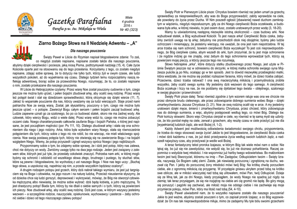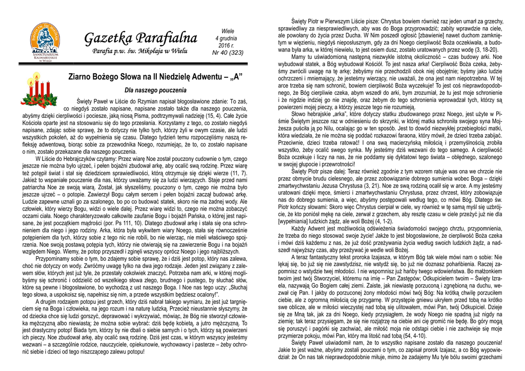 Gazetka Parafialna Parafia p.w. św. Mikołaja w Wielu Wiele 4 grudnia 2016 r. Nr 40 (323) Ziarno Bożego Słowa na II Niedzielę Adwentu – „A” Dla naszego pouczenia Święty Paweł w Liście do Rzymian napisał błogosławione zdanie: To zaś, co niegdyś zostało napisane, napisane zostało także dla naszego pouczenia, abyśmy dzięki cierpliwości i pociesze, jaką niosą Pisma, podtrzymywali nadzieję (15, 4). Całe życie Kościoła oparte jest na stosowaniu się do tego przesłania. Korzystamy z tego, co zostało niegdyś napisane, zdając sobie sprawę, że to dotyczy nie tylko tych, którzy żyli w owym czasie, ale ludzi wszystkich pokoleń, aż do wypełnienia się czasu. Dlatego tydzień temu rozpoczęliśmy naszą refleksję adwentową, biorąc sobie za przewodnika Noego, rozumiejąc, że to, co zostało napisane o nim, zostało przekazane dla naszego pouczenia. W Liście do Hebrajczyków czytamy: Przez wiarę Noe został pouczony cudownie o tym, czego jeszcze nie można było ujrzeć, i pełen bojaźni zbudował arkę, aby ocalić swą rodzinę. Przez wiarę też potępił świat i stał się dziedzicem sprawiedliwości, którą otrzymuje się dzięki wierze (11, 7). Jakież to wspaniałe pouczenie dla nas, którzy uważamy się za ludzi wierzących. Staje przed nami patriarcha Noe ze swoją wiarą. Został, jak słyszeliśmy, pouczony o tym, czego nie można było jeszcze ujrzeć – o potopie. Zawierzył Bogu całym sercem i pełen bojaźni zaczął budować arkę. Ludzie zapewne uznali go za szalonego, bo po co budować statek, skoro nie ma żadnej wody. Ale człowiek, który wierzy Bogu, widzi o wiele dalej. Przez wiarę widzi to, czego nie można zobaczyć oczami ciała. Noego charakteryzowało całkowite zaufanie Bogu i bojaźń Pańska, o której jest napisane, że jest początkiem mądrości (por. Ps 111, 10). Dlatego zbudował arkę i stała się ona schronieniem dla niego i jego rodziny. Arka, która była wykwitem wiary Noego, stała się równocześnie potępieniem dla tych, którzy sobie z tego nic nie robili, bo nie wierząc, nie mieli właściwego spojrzenia. Noe swoją postawą potępia tych, którzy nie otwierają się na zawierzenie Bogu i na bojaźń względem Niego. Wiemy, że potop przyszedł i zginęli wszyscy oprócz Noego i jego najbliższych. Przypominamy sobie o tym, bo zdajemy sobie sprawę, że i dziś jest potop, który nas zalewa, choć nie dotyczy on wody. Zwróćmy uwagę tylko na dwa jego rodzaje. Jeden jest związany z zalewem słów, których jest już tyle, że przestały cokolwiek znaczyć. Potrzeba nam arki, w której moglibyśmy się schronić i oddzielić od wszelkiego słowa złego, brudnego i pustego, by słuchać słów, które są pewne i błogosławione, bo wychodzą z ust naszego Boga. I Noe nas tego uczy: „Słuchaj tego słowa, a uspokoisz się, napełnisz się nim, a przede wszystkim będziesz ocalony!”. A drugim rodzajem potopu jest grzech, który dziś nabrał takiego wymiaru, że jest już targnięciem się na Boga i człowieka, na jego rozum i na naturę ludzką. Przecież nieustannie słyszymy, że od dziecka chce się ludzi gorszyć, deprawować i wykrzywiać, mówiąc, że Bóg nie stworzył człowieka mężczyzną albo niewiastą; że można sobie wybrać: dziś będę kobietą, a jutro mężczyzną. To jest drastyczny potop! Biada tym, którzy by nie dbali o siebie samych i o tych, którzy są powierzeni ich pieczy. Noe zbudował arkę, aby ocalić swą rodzinę. Dziś jest czas, w którym wszyscy jesteśmy wezwani – a szczególnie rodzice, nauczyciele, opiekunowie, wychowawcy i pasterze – żeby ochronić siebie i dzieci od tego niszczącego zalewu potopu! Święty Piotr w Pierwszym Liście pisze: Chrystus bowiem również raz jeden umarł za grzechy, sprawiedliwy za niesprawiedliwych, aby was do Boga przyprowadzić; zabity wprawdzie na ciele, ale powołany do życia przez Ducha. W Nim poszedł ogłosić [zbawienie] nawet duchom zamkniętym w więzieniu, niegdyś nieposłusznym, gdy za dni Noego cierpliwość Boża oczekiwała, a budowana była arka, w której niewielu, to jest osiem dusz, zostało uratowanych przez wodę (3, 18-20). Mamy tu uświadomioną następną niezwykle istotną okoliczność – czas budowy arki. Noe wybudował statek, a Bóg wybudował Kościół. To jest nasza arka! Cierpliwość Boża czeka, żebyśmy zwrócili uwagę na tę arkę; żebyśmy nie przechodzili obok niej obojętnie; byśmy jako ludzie ochrzczeni i mniemający, że jesteśmy wierzący, nie uważali, że ona jest nam niepotrzebna. W tej arce trzeba się nam schronić, bowiem cierpliwość Boża wyczekuje! To jest coś nieprawdopodobnego, że Bóg cierpliwie czeka, abym wszedł do arki, bym zrozumiał, że tu jest moje schronienie i że nigdzie indziej go nie znajdę, oraz żebym do tego schronienia wprowadzał tych, którzy są powierzeni mojej pieczy, a którzy jeszcze tego nie rozumieją. Słowo hebrajskie „arka”, które dotyczy statku zbudowanego przez Noego, jest użyte w Piśmie Świętym jeszcze raz w odniesieniu do skrzynki, w której matka schroniła swojego syna Mojżesza puściła ją po Nilu, ocalając go w ten sposób. Jest to dowód niezwykłej przebiegłości matki, która wiedziała, że nie można się poddać rozkazowi faraona, który mówił, że dzieci trzeba zabijać. Przeciwnie, dzieci trzeba ratować! I ona swą macierzyńską miłością i przemyślnością zrobiła wszystko, żeby ocalić swego synka. My jesteśmy dziś wezwani do tego samego. A cierpliwość Boża oczekuje i liczy na nas, że nie poddamy się dyktatowi tego świata – obłędnego, szalonego w swojej głupocie i przewrotności! Święty Piotr pisze dalej: Teraz również zgodnie z tym wzorem ratuje was ona we chrzcie nie przez obmycie brudu cielesnego, ale przez zobowiązanie dobrego sumienia wobec Boga – dzięki zmartwychwstaniu Jezusa Chrystusa (3, 21). Noe ze swą rodziną ocalił się w arce. A my jesteśmy uratowa