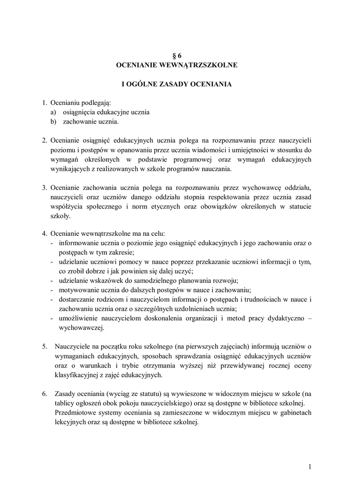 §6 OCENIANIE WEWNĄTRZSZKOLNE I OGÓLNE ZASADY OCENIANIA 1. Ocenianiu podlegają: a) osiągnięcia edukacyjne ucznia b) zachowanie ucznia. 2. Ocenianie osiągnięć edukacyjnych ucznia polega na rozpoznawaniu przez nauczycieli poziomu i postępów w opanowaniu przez ucznia wiadomości i umiejętności w stosunku do wymagań określonych w podstawie programowej oraz wymagań edukacyjnych wynikających z realizowanych w szkole programów nauczania. 3. Ocenianie zachowania ucznia polega na rozpoznawaniu przez wychowawcę oddziału, nauczycieli oraz uczniów danego oddziału stopnia respektowania przez ucznia zasad współżycia społecznego i norm etycznych oraz obowiązków określonych w statucie szkoły. 4. Ocenianie wewnątrzszkolne ma na celu: - informowanie ucznia o poziomie jego osiągnięć edukacyjnych i jego zachowaniu oraz o postępach w tym zakresie; - udzielanie uczniowi pomocy w nauce poprzez przekazanie uczniowi informacji o tym, co zrobił dobrze i jak powinien się dalej uczyć; - udzielanie wskazówek do samodzielnego planowania rozwoju; - motywowanie ucznia do dalszych postępów w nauce i zachowaniu; - dostarczanie rodzicom i nauczycielom informacji o postępach i trudnościach w nauce i zachowaniu ucznia oraz o szczególnych uzdolnieniach ucznia; - umożliwienie nauczycielom doskonalenia organizacji i metod pracy dydaktyczno – wychowawczej. 5. Nauczyciele na początku roku szkolnego (na pierwszych zajęciach) informują uczniów o wymaganiach edukacyjnych, sposobach sprawdzania osiągnięć edukacyjnych uczniów oraz o warunkach i trybie otrzymania wyższej niż przewidywanej rocznej oceny klasyfikacyjnej z zajęć edukacyjnych. 6. Zasady oceniania (wyciąg ze statutu) są wywieszone w widocznym miejscu w szkole (na tablicy ogłoszeń obok pokoju nauczycielskiego) oraz są dostępne w bibliotece szkolnej. Przedmiotowe systemy oceniania są zamieszczone w widocznym miejscu w gabinetach lekcyjnych oraz są dostępne w bibliotece szkolnej. 1 II. KLASYFIKACJA ŚRÓDROCZNA I ROCZNA 1. Uczeń podlega klasyfikacji śródrocznej, rocznej i końcowej. 2. Klasyfikacja śródroczna odbywa się na zakończenie I semestru nauki tj. do dnia 31 stycznia każdego roku. 3. Klasyfikacja śródroczna polega na okresowym podsumowaniu osiągnięć edukacyjnych ucznia z zajęć edukacyjnych oraz ustaleniu śródrocznych ocen klasyfikacyjnych z zajęć edukacyjnych oraz z zachowania. 4. Klasyfikacja roczna polega na podsumowaniu osiągnięć edukacyjnych ucznia z zajęć edukacyjnych i zachowania ucznia oraz ustaleniu rocznych ocen klasyfikacyjnych. 5. Przy wystawianiu oceny śródrocznej i rocznej z zajęć edukacyjnych w klasach IV-VI stosowana jest następująca skala ocen: celujący (6), bardzo dobry (5), dobry (4), dostateczny (3), dopuszczający (2), niedostateczny (1). 6. W klasach I-III ustala się jedną śródroczną i roczną ocenę opisową z obowiązkowych zajęć edukacyjnych, za wyjątkiem religii i etyki, gdzie jest stosowana sześciostopniowa skala ocen. 7. Przy ustalaniu oceny z wychowania fizycznego, zajęć technicznych, plastyki i muzyki należy przede wszystkim brać pod uwagę wysiłek wkładany przez ucznia w wywiązywanie się z obowiązków wynikających ze specyfiki tych zajęć, a w przypadku wychowania fizycznego – także systematyczność udziału ucznia w zajęciach oraz aktywność ucznia w działaniach podejmowanych przez szkołę na rzecz kultury fizycznej. 8. Terminy ustalania oceny śródrocznej: a) Poinformowanie uczniów o propozycjach przewidywanych śródrocznych ocen z zajęć edukacyjnych oraz przewidywanej ocenie z zachowania – na dwa tygodnie przed radą klasyfikacyjną; b) Wpisanie propozycji przewidywanych ocen do dziennika elektronicznego - na dwa tygodnie przed radą klasyfikacyjną; c) Poinformowanie rodziców (opiekunów prawnych) o propozycjach przewidywanych śródrocznych ocen z zajęć edukacyjnych oraz oceny z zachowania – na dwa tygodnie przed radą klasyfikacyjną poprzez dziennik elektroniczny; d) Wystawienie ostatecznej śródrocznej oceny z zajęć edukacyjnych i zachowania – na 3 dni przed radą klasyfikacyjną. e) Śródroczna rada klasyfikacyjna odbywa się w ostatni czwartek przed feriami lub (jeśli termin ferii wypada po 1 lutym) w ostatni czwartek przed końcem I semestru. 2 9. Terminy ustalania oceny rocznej: a) Poinformowanie uczniów o przewidywanych niedostatecznych rocznych ocenach z zajęć edukacyjnych oraz nagannej i nieodpowiedniej ocenie z zachowania – na miesiąc przed radą klasyfikacyjną podczas zajęć edukacyjnych; b) Wpisanie propozycji przewidywanych ocen niedostatecznych, nieodpowiednich i nagannych do dziennika elektronicznego - na miesiąc przed radą klasyfikacyjną; c) Poinformowanie rodziców (opiekunów prawnych) o przewidywanych rocznych ocenach niedostatecznych z zajęć edukacyjnych oraz nagannych i nieodpowiednich ocenach z zachowania – na miesiąc przed radą klasyfikacyjną podczas konsultacji lub zebrania z rodzicami oraz poprzez dziennik elektroniczny. W przypadku nieobecności rodzica na konsultacjach lub zebraniu wychowawca przekazuje informacje o przewidywanych ocenach osobiście, telefonicznie, listownie, przesyłając wiadomość poprzez dziennik elektroniczny lub poprzez dokonanie wpisu w dzienniczku ucznia albo w zeszycie przedmiotowym. d) Ustalenie propozycji ocen rocznych pozytywnych i oceny z zachowania oraz wpisanie propozycji do dziennika elektronicznego – na dwa tygodnie przed radą klasyfikacyjną; e) Poinformowanie uczniów o przewidywanych pozytywnych rocznych ocenach z zajęć edukacyjnych oraz ocenie z zachowania – na dwa tygodnie przed radą klasyfikacyjną podczas zajęć edukacyjnych; f) Poinformowanie rodziców (opiekunów prawnych) o przewidywanych pozytywnych śródrocznych i rocznych ocenach z zajęć edukacyjnych oraz ocenach z zachowania – na dwa tygodnie przed radą klasyfikacyjną poprzez dziennik elektroniczny oraz na ostatnim przed klasyfikacj