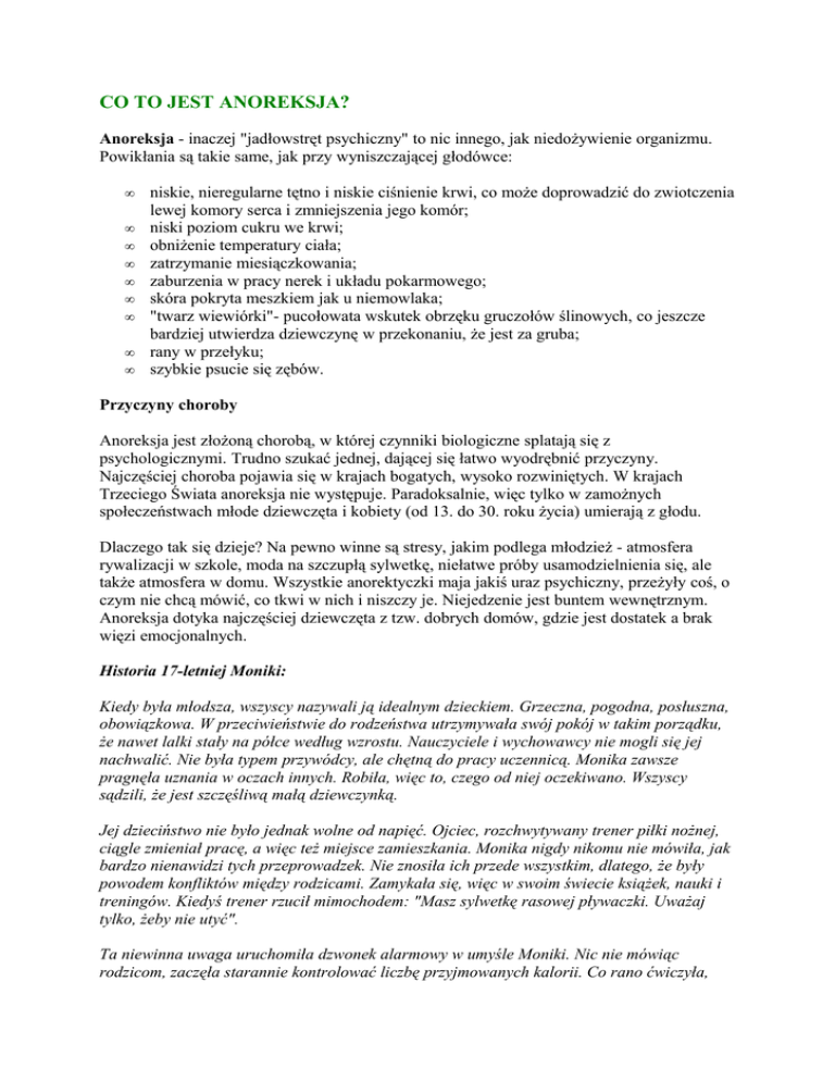 CO TO JEST ANOREKSJA? Anoreksja - inaczej "jadłowstręt psychiczny" to nic innego, jak niedożywienie organizmu. Powikłania są takie same, jak przy wyniszczającej głodówce: • • • • • • • • • niskie, nieregularne tętno i niskie ciśnienie krwi, co może doprowadzić do zwiotczenia lewej komory serca i zmniejszenia jego komór; niski poziom cukru we krwi; obniżenie temperatury ciała; zatrzymanie miesiączkowania; zaburzenia w pracy nerek i układu pokarmowego; skóra pokryta meszkiem jak u niemowlaka; "twarz wiewiórki"- pucołowata wskutek obrzęku gruczołów ślinowych, co jeszcze bardziej utwierdza dziewczynę w przekonaniu, że jest za gruba; rany w przełyku; szybkie psucie się zębów. Przyczyny choroby Anoreksja jest złożoną chorobą, w której czynniki biologiczne splatają się z psychologicznymi. Trudno szukać jednej, dającej się łatwo wyodrębnić przyczyny. Najczęściej choroba pojawia się w krajach bogatych, wysoko rozwiniętych. W krajach Trzeciego Świata anoreksja nie występuje. Paradoksalnie, więc tylko w zamożnych społeczeństwach młode dziewczęta i kobiety (od 13. do 30. roku życia) umierają z głodu. Dlaczego tak się dzieje? Na pewno winne są stresy, jakim podlega młodzież - atmosfera rywalizacji w szkole, moda na szczupłą sylwetkę, niełatwe próby usamodzielnienia się, ale także atmosfera w domu. Wszystkie anorektyczki maja jakiś uraz psychiczny, przeżyły coś, o czym nie chcą mówić, co tkwi w nich i niszczy je. Niejedzenie jest buntem wewnętrznym. Anoreksja dotyka najczęściej dziewczęta z tzw. dobrych domów, gdzie jest dostatek a brak więzi emocjonalnych. Historia 17-letniej Moniki: Kiedy była młodsza, wszyscy nazywali ją idealnym dzieckiem. Grzeczna, pogodna, posłuszna, obowiązkowa. W przeciwieństwie do rodzeństwa utrzymywała swój pokój w takim porządku, że nawet lalki stały na półce według wzrostu. Nauczyciele i wychowawcy nie mogli się jej nachwalić. Nie była typem przywódcy, ale chętną do pracy uczennicą. Monika zawsze pragnęła uznania w oczach innych. Robiła, więc to, czego od niej oczekiwano. Wszyscy sądzili, że jest szczęśliwą małą dziewczynką. Jej dzieciństwo nie było jednak wolne od napięć. Ojciec, rozchwytywany trener piłki nożnej, ciągle zmieniał pracę, a więc też miejsce zamieszkania. Monika nigdy nikomu nie mówiła, jak bardzo nienawidzi tych przeprowadzek. Nie znosiła ich przede wszystkim, dlatego, że były powodem konfliktów między rodzicami. Zamykała się, więc w swoim świecie książek, nauki i treningów. Kiedyś trener rzucił mimochodem: "Masz sylwetkę rasowej pływaczki. Uważaj tylko, żeby nie utyć". Ta niewinna uwaga uruchomiła dzwonek alarmowy w umyśle Moniki. Nic nie mówiąc rodzicom, zaczęła starannie kontrolować liczbę przyjmowanych kalorii. Co rano ćwiczyła, potem ważyła się i zapisywała wagę w notesie. Po lekcjach uprawiała jogging. Zostawiała na talerzu ryż, ziemniaki, nie brała do ust pieczywa. Wkrótce zaczęła też ograniczać jedzenie mięsa, ryb i jaj. Robiła to stopniowo, więc rodzice niczego nie zauważyli. W ciągu 3 miesięcy stosowania takiej diety Monika zrzuciła 4 kilogramy. Przez następne trzy miesiące - kolejne 6. Dla niepoznaki nosiła obszerne bluzki i swetry. Doszła do 39 kg wagi (przy wzroście 170 cm). Przestała miesiączkować. Diagnoza lekarza była jednoznaczna: anoreksja. Istnieje zespół cech charakterystycznych dla rodzin anorektyczek: Nadopiekuńczość - każdy członek rodziny troszczy się o pozostałych. Ale dziecko wzrasta w przeświadczeniu, że świat nie jest bezpieczny. Rodzice przekonują go, że nic tak nie chroni jak rodzina. Dziecku nie stwarza się możliwości stawiania czoła przeciwnościom losu. Rozwój jego osobowości zostaje zahamowany. Unikanie konfliktów - jasne sformułowanie problemu stanowi dla takich rodzin zagrożenie. Tuszuje się niektóre sprawy, aby zachować "harmonię" w rodzinie. Dlatego ignoruje się istnienie problemu. Sztywność - w rodzinach tego typu wszelka zmiana jest niebezpieczna i niepożądana. Wszyscy unikają jej jak mogą. Gdy staje się nieodzowna - pojawiają się kłopoty. "Sztywne" rodziny są bezbronne wobec kataklizmów, chorób, nieszczęść przychodzących z zewnątrz. Wciąganie dzieci w konflikty małżeńskie - jest regułą, że anoreksja pojawia się w tych rodzinach, w których rodzice nie umieli ze sobą otwarcie rozmawiać i unikali ujawniania wszelkich konfliktów. Dzieci takie doskonale wiedza, że konflikt istnieje. Sprzymierzają się albo z jednym z rodziców, albo pełnią rolę mediatora. Szansa wyleczenia: • • • • wcześnie rozpoczęte, intensywne leczenie przynosi dobre efekty; leczenie nie kończy się z chwila osiągnięcia przez dziewczynę normalnej wagi - jeśli nie uda się zapanować nad problemami, które doprowadziły do zaburzenia, nadal będzie chora; u 15-20 procent chorych anoreksja powoduje stałe uszkodzenia; około 2-5 procent osób z chroniczną anoreksja popełnia samobójstwo. Opracowano na podstawie książki Marthy Jablow "Anoreksja, bulimia, otyłość" wydanej przez Gdańskie Wydawnictwo Psychologiczne