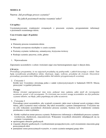 MODUŁ II Nazwa: Jak przebiega proces czytania? Na jakich poziomach można rozumieć tekst? Cel ogólny: Usystematyzowanie wiadomości związanych z procesem czytania, przypomnienie informacji o poziomach rozumianego tekstu. Czas trwania zajęć: (8 godzin) Treści: Elementy procesu rozumienia tekstu Warunki zewnętrzne niezbędne w czasie czytania Poziomy czytania: techniczny, semantyczny, krytyczno-twórczy Rodzaje czytania: pasywne, ciche, głośne 1. Wprowadzenie Zapoznanie uczestników z celem i treściami zajęć oraz harmonogramem zajęć w danym dniu. UWAGA Prowadzący przypomina, że na zajęciach przydadzą się podręczniki, z jakich korzystają w szkole. Tam będą wyszukiwane przykładowe teksty, ilustracje, mapy, wykresy, przydatne do ćwiczeń. Oczywiście prowadzący powinien mieć kilka podręczników lub tekstów przygotowanych wcześniej. 2. Ćwiczenie 1 Krótki test: Uczestnicy otrzymują jedno z zadań wykorzystywanych w badaniach OECD. Muszą przeczytać i wypełnić polecenia. Uwaga: Można również zaproponować inne testy, pokazać inne zadania, jakie mieli do rozwiązania uczniowie, prosić o ich rozwiązanie. To ćwiczenie ma zwrócić uwagę uczestników na zbyt pobieżne czytanie tekstów, na błędy, jakie popełniają nie tylko uczniowie. 3. Ćwiczenie 2 Prowadzący prosi uczestników, aby wypisali czynności, jakie musi wykonać uczeń czytający różne teksty, jakie czynności musi wykonać, aby tekst zrozumieć, a potem zinterpretować. Ćwiczenie ma na celu wskazanie uczestnikom złożoności procesu czytania. Synteza tych wiadomości zostania przekazana w mini-wykładzie. 4. Krótki wykład na temat procesu czytania. Podstawowe informacje o składnikach procesu czytania: wzrokowym, słuchowym, znaczeniowym. Wskazanie wszystkich elementów składających się na czytanie i rozumienie: spostrzeganie obrazów graficznych wiązanie obrazów graficznych z wyobrażeniami pozajęzykowymi, czyli zrozumienie znaczenia grup przeczytanych słów pamiętanie sensu przeczytanych wyrazów, w czasie czytania następnej grupy słów domyślanie się dalszego ciągu czytanego tekstu tj. przewidywanie kojarzenie znaczeń w pewne całości myślowe kontrola - weryfikacja przewidywań Celem czytania jest rozumienie treści czytanego tekstu. Wg L. Andersona: ” Umieć czytać, to tyle, co rozumieć wydrukowany tekst. Człowiek nierozumiejacy treści gazety nie umie jej przeczytać”. J. Bałachowicz twierdzi, że na proces rozumienia składa się: rozumienie sensu wyrazów i zdań zawartych w tekście poszukiwanie i wyjaśnianie związków rzeczowych i logicznych między elementami treści, ujecie ich w pewną całość, aby można było odebrać przekazany komunikat rozumienie i interpretacja przekazanego komunikatu Czytanie przy rozwiązywaniu zadań matematycznych: notowanie szczegółów odnalezienie w konkretnym problemie tego, co jest dane ustalenie, co jest wymagane w danym zagadnieniu zaplanowanie sposobu postępowania dla rozstrzygnięcia problemu skontrolowanie, czy uzyskana odpowiedź jest sensowna znajomość pojęć matematycznych 5. Zaprezentowanie przez prowadzącego planszy; „Wszystko jasne”, aby udowodnić, ze nie czytamy każdej z liter oddzielnie, ale wyraz jako całość. 6. Mini – wykład o warunkach zewnętrznych, niezbędnych we właściwej nauce czytania Warunki zewnętrzne: - Światło dzienne (biurko przy oknie) - Źródło oświetlenia za ramieniem, naprzeciwko ręki, którą się pisze - Światło niezbyt ostre, nie prosto na książkę (odbicie) - Właściwa postawa – proste plecy (niezbyt wygodny fotel) - Uda równolegle do podłogi lub nieznacznie wyżej - Blat biurka 20 cm wyżej niż siedzenie - Odległość 50 cm oczu od tekstu - Stopy płasko na podłodze Otoczenie: - Miłe (własny kącik lub pokój) - Przyjazne (obecność bliskiej osoby) - Cisza lub delikatna muzyka 7. Ćwiczenie 3 Prowadzący prezentuje planszę, zawierającą wyrazy z błędami, i prosi uczestników o odczytanie tekstu. Komentuje, informując, że drobne błędy w wyrazach nie muszą wpływać na rozumienie tekstu, ponieważ nie czytamy liter oddzielnie, ale wyrazy jako całość. Uczestnicy dostają do wykonania test dla studentów, sprawdzający umiejętność czytania ze zrozumieniem. Próbują rozwiązać test. Prowadzący wskazuje na przykładzie testu, że czytanie może przebiegać na różnych poziomach. 8. Mini wykład na temat poziomów czytania: technicznego, semantycznego i krytyczno- twórczego. Wyjaśnienie istoty każdego poziomu, przekazanie informacji o możliwościach sprawdzania u uczniów każdego poziomu. 9. Ćwiczenie 4 Uczestnicy wyszukują różne teksty, np. wykresy, mapy. Mają stworzyć pytania dla ucznia do poznanych 3 poziomów czytania. Np. czytanie techniczne: jakie oznaczenie ma oś rzędnych, jakie odciętych, z ilu lat są wyniki przedstawione na wykresie? czytanie semantyczne: o ile procent wzrósł poziom czytelnictwa w badanym okresie? czytanie krytyczno-twórcze: jak można zinterpretować wyniki badań? Wypełniają w grupach kartę pracy: Krótka informacja dotycząca omawianego tekstu: …………………………………………………………………… Czytanie techniczne czytanie semantyczne czytanie krytyczno-twórcze Uwaga: Można rozdać uczestnikom kartki w trzech kolorach, na których zapiszą wymyślone pytania, a następnie zaprezentują wyniki pracy w grupie, pokazując wybrany w podręczniku tekst. 10. Ćwiczenie 5 Uczestnicy wysłuchują czytany przez prowadzącego tekst: „Żabi król”. Odpowiadają na pytania. Następnie prowadzący czyta tekst zadania matematycznego. Zadaje pytania. Następnie czyta fragmenty wiersza L. Staffa „Jesienny deszcz” i zadaje szczegółowe pytania. Prosi uczestników o wskazanie, jakie trudności wystąpiły w odbiorze i rozumieniu tekstów? Jakie byłyby lepsze sposoby odczytania przedstawionych tekstów? Jakie czynności kształci się w odbiorze słucha