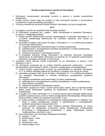 Zasady przyjmowania uczniów do Gimnazjum §116 1. Gimnazjum przeprowadza rekrutację uczniów w oparciu o zasadę powszechnej dostępności. 2. Liczbę uczniów, którzy mają być przyjęci do klas pierwszych określa, w porozumieniu z Dyrektorem organ prowadzący gimnazjum. 3. Terminy prowadzenia rekrutacji określa Dyrektor Gimnazjum na mocy zarządzenia. §117 1. O przyjęciu uczniów do wszystkich klas decyduje Dyrektor. 2. Do Gimnazjum przyjmuje się z urzędu - dzieci zamieszkałe w obwodzie Gimnazjum, w oparciu o następujące zasady: 1) rodzice (prawni opiekunowie) uczniów zamieszkałych w obwodzie Gimnazjum nr 11 w Lublinie potwierdzają telefonicznie lub osobiście zapisanie córki (syna) do Gimnazjum, 2) warunkiem przyjęcia córki (syna) do klasy I Gimnazjum nr 11 w Lublinie jest złożenie n/w kompletu dokumentów : a) oryginału świadectwa ukończenia klasy VI szkoły podstawowej, b) zaświadczenia o szczegółowych wynikach sprawdzianu w szkole podstawowej, c) karty zdrowia i szczepień, d) ankiety (do pobrania w sekretariacie szkoły), 3) w przypadku wybrania innego Gimnazjum, na rodzicach spoczywa obowiązek dostarczenia do sekretariatu Gimnazjum (w terminie do 10 września) potwierdzenia spełniania obowiązku szkolnego w innej szkole, 3. Uczniowie spoza obwodu szkoły przyjmowani są do Gimnazjum w oparciu o tryb określony w ust. 4. 4. Do Gimnazjum przyjmuje się na prośbę rodziców (prawnych opiekunów) - uczniów zamieszkałych poza obwodem szkoły, w oparciu o następujący tryb postępowania: 1) rodzice (prawni opiekunowie) uczniów nie zamieszkałych w obwodzie Gimnazjum nr 11 w Lublinie składają podania do Dyrektora o przyjęcie córki (syna) do szkoły, 2) warunkiem przyjęcia córki (syna) do klasy I Gimnazjum nr 11 w Lublinie jest złożenie n/w kompletu dokumentów w terminie określonym zarządzeniem dyrektora Gimnazjum: a) oryginału świadectwa ukończenia klasy VI szkoły podstawowej, b) zaświadczenia o szczegółowych wynikach sprawdzianu w szkole podstawowej, c) karty zdrowia i szczepień, d) ankiety (do pobrania w sekretariacie szkoły), 3) warunkiem przyjęcia do klasy I ucznia spoza rejonu szkoły, jest co najmniej bardzo dobra ocena zachowania uzyskana na świadectwie ukończenia kl. VI szkoły podstawowej, 4) o przyjęciu do I klasy Gimnazjum nr 11 uczniów spoza rejonu decyduje ogólna liczba punktów uzyskana przez ucznia w trakcie postępowania rekrutacyjnego (maksymalna liczba punktów możliwa do uzyskania wynosi 80), w tym: a) liczba punktów uzyskanych na sprawdzianie przeprowadzonym w ostatnim roku nauki w szkole podstawowej zawarta w zaświadczeniu o szczegółowych wynikach sprawdzianu (maksymalnie 40), b) liczba punktów przyznana przez Szkolną Komisję Rekrutacyjną za oceny uzyskane na świadectwie ukończenia szkoły podstawowej, (maksymalnie 35 punktów) z następujących przedmiotów: j. polski, matematyka, historia i społeczeństwo, przyroda, j. obcy, 5) przy przeliczaniu ocen na punkty obowiązuje punktacja: a) celujący – 7 pkt, b) bardzo dobry – 6 pkt, c) dobry – 5 pkt, d) dostateczny 4 pkt, e) dopuszczający 3 pkt, 5. 6. 7. 8. 9. 6) punkty dodatkowe za udokumentowane osiągnięcia: a) za udział w wojewódzkim etapie konkursów przedmiotowych, artystycznych, sportowych – 5 pkt, b) za udział w okręgowym etapie konkursów przedmiotowych, artystycznych, sportowych – 3 pkt, c) nie sumuje się punktów za udział w konkursach okręgowych i wojewódzkich, lub kilku różnych, 7) laureaci konkursów o zasięgu wojewódzkim i ponadwojewódzkim, których program obejmuje w całości lub poszerza treści podstawy programowej co najmniej jednego przedmiotu (bloku przedmiotowego) przyjmowani są do Gimnazjum niezależnie od kryteriów, o których mowa powyżej, 8) w przypadku równej ilości uzyskanych punktów pierwszeństwo w przyjęciu do Gimnazjum mają dzieci: a) będące absolwentami Szkoły Podstawowej nr 28 w Lublinie, b) rodziców wychowujących samotnie dzieci. Dyrektor Gimnazjum powołuje Szkolną Komisję Rekrutacyjną (w terminie do 20 czerwca) w składzie: 1) wicedyrektor szkoły – przewodniczący, 2) pedagog szkolny – członek, 3) dwóch przedstawicieli Rady Pedagogicznej – członkowie. Szkolna Komisja Rekrutacyjna sporządza listy uczniów przyjętych do klasy pierwszej Gimnazjum. Od decyzji Szkolnej Komisji Rekrutacyjnej przysługuje odwołanie do Dyrektora Gimnazjum w terminie 7 dni od daty wywieszenia listy uczniów przyjętych do klas pierwszych. Przyjęcie do Gimnazjum dziecka spoza obwodu Gimnazjum wymaga zawiadomienia dyrektora gimnazjum, w którego obwodzie dziecko mieszka. Do oddziałów integracyjnych, sportowych, oddziałów realizujących dodatkową godzinę wychowania fizycznego uczniowie przyjmowani są w oparciu o następujący tryb postępowania: 1) oddziały integracyjne: a) warunkiem objęcia ucznia niepełnosprawnego rekrutacją do klasy integracyjnej jest złożenie następujących dokumentów: aktualnej opinii psychologicznopedagogicznej (nie wcześniejszej niż z szóstej klasy szkoły podstawowej), aktualnego orzeczenia do kształcenia specjalnego, b) spotkanie kandydatów z Komisją Kwalifikacyjną, c) decyzję o przyjęciu do klasy integracyjnej podejmuje Dyrektor szkoły na podstawie opinii i orzeczenia z Poradni Psychologiczno-Pedagogicznej, oraz opinii Komisji Kwalifikacyjnej w składzie: wychowawca klasy, nauczyciel specjalista, pedagog i psycholog, 2) oddziały sportowe oraz realizujące dodatkową godzinę wychowania fizycznego: a) kandydaci do tych oddziałów powinni posiadać pisemną zgodę rodziców (prawnych opiekunów) oraz bardzo dobry stan zdrowia potwierdzony zaświadczeniem lekarskim, b) rekrutacja obejmuje zaliczenie prób sprawności fizycznej ustalonych przez trenera prowadzącego zajęcia w danej dyscyplinie sportu, c) decyzję o przyjęciu podejmuje Dyrektor szkoły na wniosek trenera prowadzącego zajęcia z uwzględnieniem prób sprawnościowych.