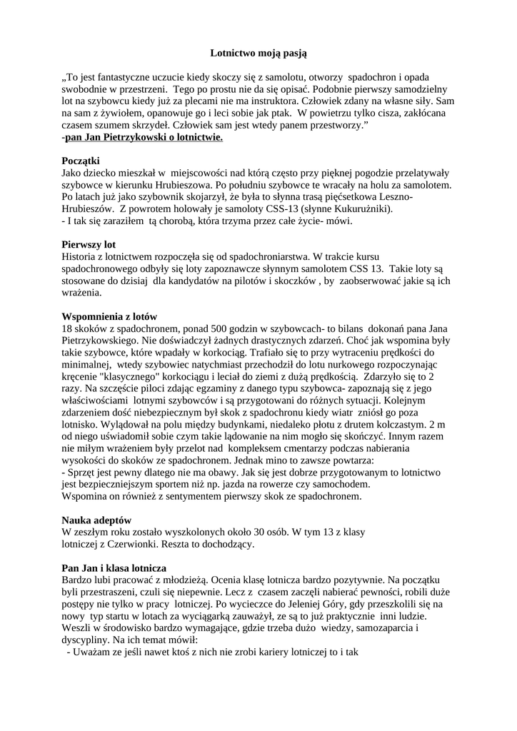Lotnictwo moją pasją „To jest fantastyczne uczucie kiedy skoczy się z samolotu, otworzy spadochron i opada swobodnie w przestrzeni. Tego po prostu nie da się opisać. Podobnie pierwszy samodzielny lot na szybowcu kiedy już za plecami nie ma instruktora. Człowiek zdany na własne siły. Sam na sam z żywiołem, opanowuje go i leci sobie jak ptak. W powietrzu tylko cisza, zakłócana czasem szumem skrzydeł. Człowiek sam jest wtedy panem przestworzy.” -pan Jan Pietrzykowski o lotnictwie. Początki Jako dziecko mieszkał w miejscowości nad którą często przy pięknej pogodzie przelatywały szybowce w kierunku Hrubieszowa. Po południu szybowce te wracały na holu za samolotem. Po latach już jako szybownik skojarzył, że była to słynna trasą pięćsetkowa LesznoHrubieszów. Z powrotem holowały je samoloty CSS-13 (słynne Kukurużniki). - I tak się zaraziłem tą chorobą, która trzyma przez całe życie- mówi. Pierwszy lot Historia z lotnictwem rozpoczęła się od spadochroniarstwa. W trakcie kursu spadochronowego odbyły się loty zapoznawcze słynnym samolotem CSS 13. Takie loty są stosowane do dzisiaj dla kandydatów na pilotów i skoczków , by zaobserwować jakie są ich wrażenia. Wspomnienia z lotów 18 skoków z spadochronem, ponad 500 godzin w szybowcach- to bilans dokonań pana Jana Pietrzykowskiego. Nie doświadczył żadnych drastycznych zdarzeń. Choć jak wspomina były takie szybowce, które wpadały w korkociąg. Trafiało się to przy wytraceniu prędkości do minimalnej, wtedy szybowiec natychmiast przechodził do lotu nurkowego rozpoczynając kręcenie "klasycznego" korkociągu i leciał do ziemi z dużą prędkością. Zdarzyło się to 2 razy. Na szczęście piloci zdając egzaminy z danego typu szybowca- zapoznają się z jego właściwościami lotnymi szybowców i są przygotowani do różnych sytuacji. Kolejnym zdarzeniem dość niebezpiecznym był skok z spadochronu kiedy wiatr zniósł go poza lotnisko. Wylądował na polu między budynkami, niedaleko płotu z drutem kolczastym. 2 m od niego uświadomił sobie czym takie lądowanie na nim mogło się skończyć. Innym razem nie miłym wrażeniem były przelot nad kompleksem cmentarzy podczas nabierania wysokości do skoków ze spadochronem. Jednak mino to zawsze powtarza: - Sprzęt jest pewny dlatego nie ma obawy. Jak się jest dobrze przygotowanym to lotnictwo jest bezpieczniejszym sportem niż np. jazda na rowerze czy samochodem. Wspomina on również z sentymentem pierwszy skok ze spadochronem. Nauka adeptów W zeszłym roku zostało wyszkolonych około 30 osób. W tym 13 z klasy lotniczej z Czerwionki. Reszta to dochodzący. Pan Jan i klasa lotnicza Bardzo lubi pracować z młodzieżą. Ocenia klasę lotnicza bardzo pozytywnie. Na początku byli przestraszeni, czuli się niepewnie. Lecz z czasem zaczęli nabierać pewności, robili duże postępy nie tylko w pracy lotniczej. Po wycieczce do Jeleniej Góry, gdy przeszkolili się na nowy typ startu w lotach za wyciągarką zauważył, ze są to już praktycznie inni ludzie. Weszli w środowisko bardzo wymagające, gdzie trzeba dużo wiedzy, samozaparcia i dyscypliny. Na ich temat mówił: - Uważam ze jeśli nawet ktoś z nich nie zrobi kariery lotniczej to i tak pozostanie pozytywny ślad w ich życiu. Taki utrwalony pozytywnie ślad. O predyspozycjach przyszłych lotników Trzeba być przeciętnie zdrowym. Uważa ze każdego można nauczyć latać, choć może nie każdy będzie później super pilotem, gwiazdorem lub wyścigowcem. Praktycznie jeśli tylko ktoś ma chęci może się nauczyć latać. Jest to kwestia ilości czasu poświęconego na naukę pilotażu. Niektórzy nauczą się latać w 6 godzin a inni w 12. To zależy od człowieka. Na kursy zapisują się nie tylko chłopcy lecz również dziewczyny. Na kursie spadochronowym jest kilka dziewcząt. - Śmiem stwierdzić, że są bardziej dokładne i pilne jeśli chodzi o naukę i do opanowania wiedzy podchodzą bardziej konkretnie. Praca Instruktorem szybowcowym zastał niedawno. Pracuje z młodzieżą 40 kilka lat. Od 1964 roku jest instruktorem modelarskim. Przez jego ręce przewinęło się kilka set a może nawet ponad tysiąc osób. Niektórzy z nich zostali lotnikami. Modelarstwo kiedyś było podstawowym przygotowaniem do lotnictwa. Jest to ogromna ilość wiedzy do opanowania. Każdego roku wszyscy instruktorzy, piloci czy świeżo szkolący się muszą zdawać egzaminy z wiedzy teoretycznej (21 przedmiotów). Co jest konieczne dla zachowania bezpieczeństwa w powietrzu. Aby zostać instruktorem trzeba mieć wylatane 150 godzin na szybowcach. Zaliczyć kurs teoretyczny, odbyć loty metodyczne. Zdać egzaminy państwowe i odbyć praktykę w ośrodku szkolenia lotniczego. Trzeba wyszkolić od podstaw 3 osoby niezwiązane wcześniej z lotnictwem. Dowiedzieliśmy się także, ze instruktor musi posiadać cierpliwość, opanowanie, powinien do pewnych spraw podchodzić z dystansem . Bardzo dziękujemy za rozmowę. Monika Bobrzyk, Justyna Kołodziejczyk, Aneta Malczyk.