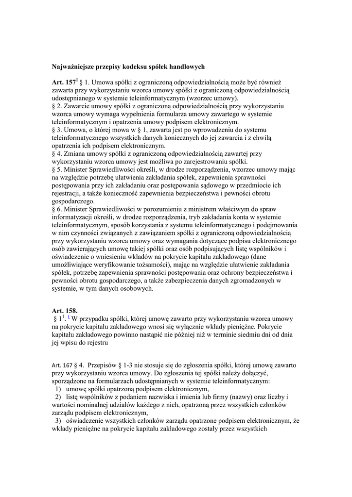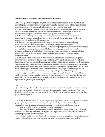 NajwaŜniejsze przepisy kodeksu spółek handlowych Art. 1571 § 1. Umowa spółki z ograniczoną odpowiedzialnością moŜe być równieŜ zawarta przy wykorzystaniu wzorca umowy spółki z ograniczoną odpowiedzialnością udostępnianego w systemie teleinformatycznym (wzorzec umowy). § 2. Zawarcie umowy spółki z ograniczoną odpowiedzialnością przy wykorzystaniu wzorca umowy wymaga wypełnienia formularza umowy zawartego w systemie teleinformatycznym i opatrzenia umowy podpisem elektronicznym. § 3. Umowa, o której mowa w § 1, zawarta jest po wprowadzeniu do systemu teleinformatycznego wszystkich danych koniecznych do jej zawarcia i z chwilą opatrzenia ich podpisem elektronicznym. § 4. Zmiana umowy spółki z ograniczoną odpowiedzialnością zawartej przy wykorzystaniu wzorca umowy jest moŜliwa po zarejestrowaniu spółki. § 5. Minister Sprawiedliwości określi, w drodze rozporządzenia, wzorzec umowy mając na względzie potrzebę ułatwienia zakładania spółek, zapewnienia sprawności postępowania przy ich zakładaniu oraz postępowania sądowego w przedmiocie ich rejestracji, a takŜe konieczność zapewnienia bezpieczeństwa i pewności obrotu gospodarczego. § 6. Minister Sprawiedliwości w porozumieniu z ministrem właściwym do spraw informatyzacji określi, w drodze rozporządzenia, tryb zakładania konta w systemie teleinformatycznym, sposób korzystania z systemu teleinformatycznego i podejmowania w nim czynności związanych z zawiązaniem spółki z ograniczoną odpowiedzialnością przy wykorzystaniu wzorca umowy oraz wymagania dotyczące podpisu elektronicznego osób zawierających umowę takiej spółki oraz osób podpisujących listę wspólników i oświadczenie o wniesieniu wkładów na pokrycie kapitału zakładowego (dane umoŜliwiające weryfikowanie toŜsamości), mając na względzie ułatwienie zakładania spółek, potrzebę zapewnienia sprawności postępowania oraz ochrony bezpieczeństwa i pewności obrotu gospodarczego, a takŜe zabezpieczenia danych zgromadzonych w systemie, w tym danych osobowych. Art. 158. § 11. ( W przypadku spółki, której umowę zawarto przy wykorzystaniu wzorca umowy na pokrycie kapitału zakładowego wnosi się wyłącznie wkłady pienięŜne. Pokrycie kapitału zakładowego powinno nastąpić nie później niŜ w terminie siedmiu dni od dnia jej wpisu do rejestru Art. 167 § 4. Przepisów § 1-3 nie stosuje się do zgłoszenia spółki, której umowę zawarto przy wykorzystaniu wzorca umowy. Do zgłoszenia tej spółki naleŜy dołączyć, sporządzone na formularzach udostępnianych w systemie teleinformatycznym: 1) umowę spółki opatrzoną podpisem elektronicznym, 2) listę wspólników z podaniem nazwiska i imienia lub firmy (nazwy) oraz liczby i wartości nominalnej udziałów kaŜdego z nich, opatrzoną przez wszystkich członków zarządu podpisem elektronicznym, 3) oświadczenie wszystkich członków zarządu opatrzone podpisem elektronicznym, Ŝe wkłady pienięŜne na pokrycie kapitału zakładowego zostały przez wszystkich wspólników w całości wniesione, jeŜeli wkłady zostały wniesione najpóźniej w chwili zgłoszenia spółki. § 5. Zarząd spółki, o której mowa w § 4, w terminie siedmiu dni od dnia jej wpisu do rejestru, składa do sądu rejestrowego: 1) oświadczenie wszystkich członków zarządu, Ŝe wkłady pienięŜne na pokrycie kapitału zakładowego zostały przez wszystkich wspólników w całości wniesione, jeŜeli oświadczenie takie nie zostało dołączone do zgłoszenia spółki, 2) złoŜone wobec sądu albo poświadczone notarialnie wzory podpisów członków zarządu. Art. 206. §1. Pisma i zamówienia handlowe składane przez spółkę w formie papierowej i elektronicznej, a takŜe informacje na stronach internetowych spółki, powinny zawierać: 1) firmę spółki, jej siedzibę i adres, 2) oznaczenie sądu rejestrowego, w którym przechowywana jest dokumentacja spółki oraz numer pod którym spółka jest wpisana do rejestru, 3) numer identyfikacji podatkowej (NIP), 4) wysokość kapitału zakładowego, a dla spółki, której umowę zawarto przy wykorzystaniu wzorca umowy, do czasu pokrycia kapitału zakładowego, takŜe informację, Ŝe wymagane wkłady na kapitał zakładowy nie zostały wniesione.