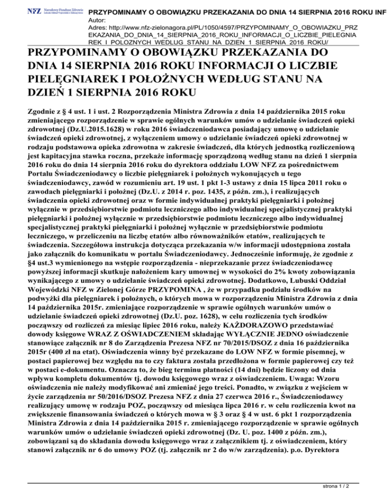 PRZYPOMINAMY O OBOWIĄZKU PRZEKAZANIA DO DNIA 14 SIERPNIA 2016 ROKU INFO Autor: Adres: http://www.nfz-zielonagora.pl/PL/1050/4597/PRZYPOMINAMY_O_OBOWIAZKU_PRZ EKAZANIA_DO_DNIA_14_SIERPNIA_2016_ROKU_INFORMACJI_O_LICZBIE_PIELEGNIA REK_I_POLOZNYCH_WEDLUG_STANU_NA_DZIEN_1_SIERPNIA_2016_ROKU/ PRZYPOMINAMY O OBOWIĄZKU PRZEKAZANIA DO DNIA 14 SIERPNIA 2016 ROKU INFORMACJI O LICZBIE PIELĘGNIAREK I POŁOŻNYCH WEDŁUG STANU NA DZIEŃ 1 SIERPNIA 2016 ROKU Zgodnie z § 4 ust. 1 i ust. 2 Rozporządzenia Ministra Zdrowia z dnia 14 października 2015 roku zmieniającego rozporządzenie w sprawie ogólnych warunków umów o udzielanie świadczeń opieki zdrowotnej (Dz.U.2015.1628) w roku 2016 świadczeniodawca posiadający umowę o udzielanie świadczeń opieki zdrowotnej, z wyłączeniem umowy o udzielanie świadczeń opieki zdrowotnej w rodzaju podstawowa opieka zdrowotna w zakresie świadczeń, dla których jednostką rozliczeniową jest kapitacyjna stawka roczna, przekaże informację sporządzoną według stanu na dzień 1 sierpnia 2016 roku do dnia 14 sierpnia 2016 roku do dyrektora oddziału LOW NFZ za pośrednictwem Portalu Świadczeniodawcy o liczbie pielęgniarek i położnych wykonujących u tego świadczeniodawcy, zawód w rozumieniu art. 19 ust. 1 pkt 1-3 ustawy z dnia 15 lipca 2011 roku o zawodach pielęgniarki i położnej (Dz.U. z 2014 r. poz. 1435, z późn. zm.), i realizujących świadczenia opieki zdrowotnej oraz w formie indywidualnej praktyki pielęgniarki i położnej wyłącznie w przedsiębiorstwie podmiotu leczniczego albo indywidualnej specjalistycznej praktyki pielęgniarki i położnej wyłącznie w przedsiębiorstwie podmiotu leczniczego albo indywidualnej specjalistycznej praktyki pielęgniarki i położnej wyłącznie w przedsiębiorstwie podmiotu leczniczego, w przeliczeniu na liczbę etatów albo równoważników etatów, realizujących te świadczenia. Szczegółowa instrukcja dotycząca przekazania w/w informacji udostępniona została jako załącznik do komunikatu w portalu Świadczeniodawcy. Jednocześnie informuję, że zgodnie z §4 ust.3 wymienionego na wstępie rozporządzenia - nieprzekazanie przez świadczeniodawcę powyższej informacji skutkuje nałożeniem kary umownej w wysokości do 2% kwoty zobowiązania wynikającego z umowy o udzielanie świadczeń opieki zdrowotnej. Dodatkowo, Lubuski Oddział Wojewódzki NFZ w Zielonej Górze PRZYPOMINA , że w przypadku podziału środków na podwyżki dla pielęgniarek i położnych, o których mowa w rozporządzeniu Ministra Zdrowia z dnia 14 października 2015r. zmieniające rozporządzenie w sprawie ogólnych warunków umów o udzielanie świadczeń opieki zdrowotnej (Dz.U. poz. 1628), w celu rozliczenia tych środków począwszy od rozliczeń za miesiąc lipiec 2016 roku, należy KAŻDORAZOWO przedstawiać dowody księgowe WRAZ Z OŚWIADCZENIEM składając WYŁĄCZNIE JEDNO oświadczenie stanowiące załącznik nr 8 do Zarządzenia Prezesa NFZ nr 70/2015/DSOZ z dnia 16 października 2015r (400 zł na etat). Oświadczenia winny być przekazane do LOW NFZ w formie pisemnej, w postaci papierowej bez względu na to czy faktura została przedłożona w formie papierowej czy też w postaci e-dokumentu. Oznacza to, że bieg terminu płatności (14 dni) będzie liczony od dnia wpływu kompletu dokumentów tj. dowodu księgowego wraz z oświadczeniem. Uwaga: Wzoru oświadczenia nie należy modyfikować ani zmieniać jego treści. Ponadto, w związku z wejściem w życie zarządzenia nr 50/2016/DSOZ Prezesa NFZ z dnia 27 czerwca 2016 r., Świadczeniodawcy realizujący umowę w rodzaju POZ, począwszy od miesiąca lipca 2016 r. w celu rozliczenia kwot na zwiększenie finansowania świadczeń o których mowa w § 3 oraz § 4 w ust. 6 pkt 1 rozporządzenia Ministra Zdrowia z dnia 14 października 2015 r. zmieniającego rozporządzenie w sprawie ogólnych warunków umów o udzielanie świadczeń opieki zdrowotnej (Dz. U. poz. 1400 z późn. zm.), zobowiązani są do składania dowodu księgowego wraz z załącznikiem tj. z oświadczeniem, który stanowi załącznik nr 6 do umowy POZ (tj. załącznik nr 2 do w/w zarządzenia). p.o. Dyrektora strona 1 / 2 PRZYPOMINAMY O OBOWIĄZKU PRZEKAZANIA DO DNIA 14 SIERPNIA 2016 ROKU INFO Autor: Adres: http://www.nfz-zielonagora.pl/PL/1050/4597/PRZYPOMINAMY_O_OBOWIAZKU_PRZ EKAZANIA_DO_DNIA_14_SIERPNIA_2016_ROKU_INFORMACJI_O_LICZBIE_PIELEGNIA REK_I_POLOZNYCH_WEDLUG_STANU_NA_DZIEN_1_SIERPNIA_2016_ROKU/ Lubuskiego Oddziału Wojewódzkiego Narodowego Funduszu Zdrowia w Zielonej Górze Piotr Bromber strona 2 / 2 Powered by TCPDF (www.tcpdf.org)