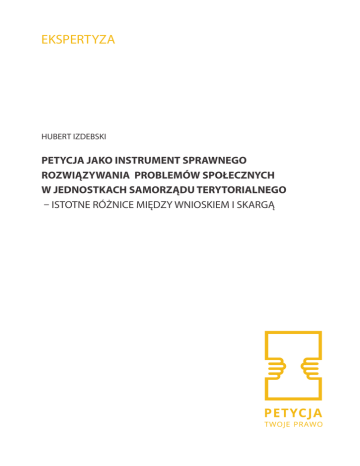 EKSPERTYZA HUBERT IZDEBSKI PETYCJA JAKO INSTRUMENT SPRAWNEGO ROZWIĄZYWANIA PROBLEMÓW SPOŁECZNYCH W JEDNOSTKACH SAMORZĄDU TERYTORIALNEGO – ISTOTNE RÓŻNICE MIĘDZY WNIOSKIEM I SKARGĄ Warszawa, 11 maja 2015 r Prof. zwycz. Hubert Izdebski Wydział Prawa i Administracji Uniwersytet Warszawski Petycja jako instrument sprawnego rozwiązywania problemów społecznych w jednostkach samorządu terytorialnego – istotne różnice między wnioskiem i skargą 1. Uwagi wstępne Przedmiotem niniejszej ekspertyzy 1 jest zastosowanie w jednostkach samorządu terytorialnego instytucji petycji mającej umocowanie w historycznych i współczesnych aktach konstytucyjnych (w art. 107 Konstytucji z 1921 r. zw. marcową 2 i w art. 63 Konstytucji RP z dnia 2 kwietnia 1997 r. 3). Ponadto wzmiankowana jest w treści art. 221 Kodeksu postępowania administracyjnego (dalej k.p.a.), powtarzającym treść art. 63 Konstytucji RP) 4 i stanowi przedmiot w nowej, odrębnej ustawie o petycjach z dnia 11 lipca 2014 r. 5, która wejdzie w życie z dniem 6 września b.r. 1 Ekspertyza została przygotowana we współpracy z dr Igorem Zachariaszem. 2 „Obywatele mają prawo wnosić pojedyncze lub zbiorowe petycje do wszelkich ciał reprezentacyjnych i władz publicznych, państwowych i samorządowych”. Przepis ten utracił moc wraz z wejściem w życie Konstytucji kwietniowej (por. jej art. 81 ust. 2), natomiast można mówić o uznawaniu obowiązywania jego treści przed wejściem w życie Konstytucji z 1952 r. (dalej Konstytucja PRL), w szczególności wobec zadeklarowania przez Sejm Ustawodawczy (w deklaracji z dnia 22 lutego 1947 r. w przedmiocie realizacji praw i wolności obywatelskich) kontynuowania realizacji „prawa wnoszenia skarg, petycji i podań do organów władzy państwowej i samorządowej”. W Konstytucji PRL była już mowa jedynie o prawie zwracania się do wszystkich organów państwa ze skargami i zażaleniami (art. 73 – art. 82 w tekście jednolitym z 1976 r.). 3 „Każdy ma prawo składać petycje, wnioski i skargi w interesie publicznym, własnym lub innej osoby za jej zgodą do organów władzy publicznej oraz do organizacji i instytucji społecznych w związku z wykonywanymi przez nie zadaniami zleconymi z zakresu administracji publicznej. Tryb rozpatrywania petycji, wniosków i skarg określa ustawa”. Piotr Winczorek wymienił, poza art. 44 Karty Praw Podstawowych Unii Europejskiej, odpowiednie przepisy m. in. trzynastu współczesnych konstytucji zapewniających prawo petycji (Komentarz do Konstytucji Rzeczypospolitej Polskiej z dnia 2 kwietnia 1997 roku, wyd. 2, Warszawa 2008, s. 152). 4 Por. J. Lang, Kilka refleksji na temat najnowszej historii regulacji prawa petycji, wniosków i skarg, „Studia Iuridica”, 2003, t. 42, s. 113 i nast. 5 Dz. U. z 2014 r. poz. 1195. 1 Od 2009 roku tryb rozpatrywania petycji skierowanych do Senatu RP jest również przedmiotem unormowania odrębnego działu Xa Regulaminu Senatu – jednak bez wskazania, co rozumie się przez pojęcie petycja. Treść ustawy o petycjach wskazuje na odrębność instytucji petycji od – wymienionych w tym samym przepisie Konstytucji i w tym samym artykule k.p.a. – instytucji skarg i wniosków, które zostały wprowadzone do polskiego porządku prawnego (z tym, że wnioski były określone jako zażalenia) w 1950 r. na podstawie samoistnej uchwały Rady Ministrów, stanowiąc adaptację rozwiązań radzieckich 6, a następnie stały się przedmiotem unormowania Działu VIII k.p.a. (który nosi cały czas tytuł „Skargi i wnioski”, mimo że w otwierającym go art. 221 jest mowa także o petycjach). Celem niniejszej ekspertyzy jest wskazanie różnicy pomiędzy petycją a skargą lub wnioskiem. Ze względu na bliski termin wejścia w życie ustawy o petycjach, ekspertyza dotyczy również stanu prawnego, jaki powstanie wraz z wejściem w życie tej ustawy. 2. Zakres podmiotowy i przedmiotowy określenia „petycja” W stanie prawnym obowiązującym przed wejściem w życie ustawy o petycjach nie występuje definicja „petycja”, a nawet brak jest, uwzględniając także brzmienie art. 63 Konstytucji RP, wystarczających elementów definicyjnych tego określenia, pozwalających wskazać jego zakres jako odrębny od zakresu skarg i wniosków. Należy jednak zauważyć, że podejmowano próby takiego wskazania przed 2014 r. Konieczne jest zatem przypomnienie rządowego projektu ustawy o zmianie ustawy – Kodeks postępowania administracyjnego, wniesionego do Sejmu w dniu 14 października 1999 r. 7, wycofanego jednak w dniu 23 listopada 2000 r., po pierwszym czytaniu, w następstwie wniosku Komisji Nadzwyczajnej do spraw zmian w kodyfikacjach postulującego jego odrzucenie. Projekt ten, który szerzej wprowadzał unormowanie instytucji petycji do k.p.a., poczynając od art. 2, proponował nowe brzmienie całemu Działowi VIII k.p.a. Nie definiując instytucji petycji, zawierał jej elementy definicyjne. W zaproponowanym art. 251 k.p.a. wskazywał, iż „Przedmiotem petycji mogą być w szczególności sprawy określone dla skarg lub wniosków, jeśli dotyczą zagadnień życia zbiorowego”. W § 1 tego artykułu użycie określenia „w szczególności” oznaczało jedynie przykładowy charakter sformułowania Uchwała Rady Ministrów z dnia 14 grudnia 1950 r. w sprawie rozpatrywania i załatwiania odwołań, listów i zażaleń ludności oraz krytyki prasowej (MP-A z 1951 r. Nr 1, poz. 1), obowiązująca do wejścia w życie k.p.a. 7 Sejm III kadencji – druk nr 1453. 6 2 zakresu petycji – „petycja wskazuje sprawę, której dotyczy, a może ona wskazywać sposób jej załatwienia” (§ 2) oraz, co wprost wynikało z Konstytucji, iż petycję można wnieść również w imieniu grupy zainteresowanych po uzyskaniu ich pisemnej zgody” (§ 3). W uzasadnieniu projektu zawarto znacznie konkretniejsze sformułowania, odbiegające jednak od brzmienia projektu: „w odróżnieniu od wniosku petycja to żą