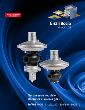 WYPRODUKOWANO WE WŁOSZECH Gas pressure regulator Reduktor ciśnienia gazu FG/FGB 100/110 - 200/210 - 300/310 - 500/510 Gas pressure regulator Reduktory ciśnienia gazu FG/FGB 100/110 - 200/210 - 300/310 - 500/510 The pressure regulators FG/FGB are designed to reduce natural gas and lp gas pressure for industrial and commercial applications. They are suitable for low, medium and high pressure. The FG series pressure regulators are direct acting type, controlled by a diaphragm and counter spring. Designed to deliver high regulation accuracy, these devices are suitable for use with non-corrosive gases, previously filtered. The FG series pressure regulators are widely used in natural gas, manufactured and LP gas plants, in both civil and industrial installations, and are designed to be installed in pressure reducing stations of pipeline networks. The FG series pressure regulators are “top entry” design, which allows an easy maintenance without removing the body from the line. The FGB version are with incorporated safety shutt off device for minimum and maximum outlet pressure. Reduktory ciśnienia FG/FGB. zostały zaprojektowane do obniżania ciśnienia gazu ziemnego i LPG dla dużych instalacji. Pracują na niskim, średnim oraz wysokim ciśnieniu. Serie FG są typem działania bezpośredniego, kontrolowane poprzez membranę i sprężynę kontrującą. Pracują na niekorozyjnych gazach, wstępnie przefiltrowanych, w celu wysokiej dokładności regulacji ciśnienia. Serie FG są powszechnie używane dla gazu ziemnego, rozlewniach LPG, zarówno w instalacjach cywilnych, jak i przemysłowych. Mogą być stosowane w stacjach redukcyjnych na sieciach gazowych. Serie FG zostały zaprojektowane tak, aby maksymalnie uprościć ich serwis. Wszystkie czynności serwisowe tych reduktorów wykonuje się bez ich demontażu z rurociągu. Wersja FGB jest wyposażona w zawory bezpieczeństwa UPSO&OPSO dla minimalnego i maksymalnego ciśnienia. Reduktory ciśnienia FG/FGB wystepują również w wersji “internal pulse”, czyli bez rurki impulsowej, co ułatwia montaż reduktora i obniża koszty instalacji. FG/FGB MAIN ADVANTAGES GŁÓWNE ZALETY FG/FGB • 2 choices of regulators according to required accuracy: balanced type (100/200/300/500) in order to obtain maximum regulation accuracy against any inlet pressure variation; unbalanced type (110/210/310/510) in order to obtain a good accuracy and reasonable price • Ability to select the diameter of the seat (for versions with unbalanced obturator) • Extreme simplicity and rapidity of maintenance • Compact design also with incorporated shut off device • Safety device: built-in shut off valve for over pressure or under pressure • Incorporated relief valve • 2 typy do wyboru w zależności od wymaganej dokładności: - zbalansowany (100-500) w celu zapewnienia maksymalnej dokładności regulacji w każdym zakresie ciśnień wlotowych - niezbalansowany (110-510) w celu zapewnienia dobrej jakości w rozsądnej cenie • Możliwość wyboru średnicy siodła grzybka (dla niezbalansowanych) • Extremalnie prosta i szybka obsługa • Kompaktowy design również z zaworami Upso&Opso • Wbudowany zawór zamykający dla nadciśnienia i podciśnienia • Wbudowany zawór bezpieczeństwa Technical Features Charakterystyka techniczna • Pressure regulator: design according to EN 334:2009 • Shut-off device: design according to EN 14382: 2009 • Body: ductile cast iron • Covers: die cast aluminium • Diaphragms: synthetic rubber with canvas • Seals: nitrile rubber • Resistance to freeze-up • Reduktory: zaprojektowane zgodnie z EN 334:2009 • Zawory blokujące: zaprojektowane zgodnie z EN 14382:2009 • Korpus: żeliwny • Pokrywy: odlew aluminiowy • Membrany: guma syntetyczna ze wzmocnieniem z tkaniny • Uszczelki: guma nitrylowa • Odporność na zamrożenia Technical features Dane techniczne FG/FGB 100/110 FG/FGB 200/210 FG/FGB 300/310 Nominal diameters (threaded - flanged) Wymiary nominalne (gwitowane - kołnierzowe) Size (inches) Wymiar Connections Typ złącza Design Pressure Ps Ciśnienie pracy F-F 1”½ x 1” ½ DN 40 x 40 F-F 2” x 2” DN 50 x 50 1” 1 1/2” 1 1/2” 2” 15 ÷ 4000 mbar / 0,21÷60 psi AG% Closing pressure class Klasa zamykająca SG% Design temperature Temperatura pracy F-F 1” x 1”½ DN 25 x 40 0,5 ÷ 5 bar / 7,5 ÷ 75 psi 0,5 ÷ 20 bar / 7,5 ÷ 290 psi Outlet pressure Ciśnienie wylotowe Accuracy class Klasa dokładności F-F 1” x 1” DN 25 x 25 threaded / gwintowane Rp ISO 7/1 NPT flanged / kołnierzowe UNI - ANSI Max inlet pressure Max ciśnienie wlotowe 5 / 10 / 20 up to / do 10 Ts FG/FGB 500/510 -20 ÷ +60 °C 20 bar / 290 psi Typical installations - Typowe zastosowania pressure regulator only without shut off valve / reduktor bez zaworu bezpieczeństwa pressure regulator with shut off valve / reduktor z zaworem bezpieczeństwa pressure regulator and double shut off valve / reduktor z podwójnym zaworem bezpieczeństwa MODELE FG-FGB A [mm] DN Flanged 182 ± 1,5 Kołnierzowe 100 110 Threaded Gwintowane - 210 - Flanged 222 ± 1,5 Kołnierzowe 300 310 - Flanged 254 ± 1,5 Kołnierzowe 500 510 - F [mm] 210 200 180 55 210 210 190 65 210 210 190 65 300 330 215 70 130 - 130 - Rp 2” x 2” Threaded Gwintowane E [mm] - Rp 1”½ x 1”½ Threaded Gwintowane D [mm] 100 Rp 1” x 1”½ Threaded Gwintowane C [mm] - Rp 1” x 1” Flanged 217 ± 1,5 Kołnierzowe 200 B [mm] 180 technologia kontroli gazu i wody gas controls production Fuel thermal shut off valves Gas governors and filters Lpg regulators Valves and fittings for gas meters Pressure relief and shut off valves Gas valves MONDIAL GAS REGULATORS it is a trade mark of Gnali Bocia srl / è un marchio di Gnali Bocia srl GNALI BOCIA SRL via Brescia 41/M,N - 25066 Lumezzane Valle (Bs) Italy - www.gnalibocia.com Regulators Customer Service/ Assistenza Clienti Regolatori - [email protected] Gas fittings