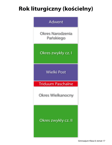 Rok liturgiczny (kościelny) Adwent Okres Narodzenia Pańskiego Okres zwykły cz. I Wielki Post Triduum Paschalne Okres Wielkanocny Okres zwykły cz. II Gimnazjum Klasa II, temat 17 Przeczytajcie fragment „Składu apostolskiego”. Jakie fakty z życia Jezusa on przypomina? Przeanalizujcie czas tych wydarzeń i zaznaczcie je na osi czasu. „Wierzę (…) w Jezusa Chrystusa (…), który się począł z Ducha Świętego, narodził się z Maryi Panny, umęczon pod Ponckim Piłatem, ukrzyżowan, umarł i pogrzebion (…), trzeciego dnia zmartwychwstał, wstąpił na niebiosa, przyjdzie sądzić…” ŻYCIE JEZUSA – ROK LITURGICZNY I r. n.e. ok. 33 r. n.e. sąd ostateczny Przeczytajcie fragment „Składu apostolskiego”. Jakie fakty z życia Jezusa on przypomina? Przeanalizujcie czas tych wydarzeń i zaznaczcie je na osi czasu. „Wierzę (…) w Jezusa Chrystusa (…), który się począł z Ducha Świętego, narodził się z Maryi Panny, umęczon pod Ponckim Piłatem, ukrzyżowan, umarł i pogrzebion (…), trzeciego dnia zmartwychwstał, wstąpił na niebiosa, przyjdzie sądzić…” ŻYCIE JEZUSA – ROK LITURGICZNY I r. n.e. ok. 33 r. n.e. sąd ostateczny Gimnazjum Klasa II, temat 17 Jezus począł się z Ducha Świętego narodził się umęczony umarł złożony do grobu zmartwychwstał wstąpił do nieba przyjdzie sądzić Gimnazjum Klasa II, temat 17 Grupa 1 Przeczytajcie tekst i odpowiedzcie na pytania. Adwent „Okres Adwentu ma podwójny charakter. Jest okresem przygotowania do uroczystości Narodzenia Pańskiego, przez którą wspominamy pierwsze przyjście Syna Bożego do ludzi. Równocześnie jest okresem, w którym przez wspomnienie pierwszego przyjścia Chrystusa kieruje się dusze ku oczekiwaniu Jego powtórnego przyjścia na końcu czasów. Z obu tych względów Adwent jest okresem pobożnego i radosnego oczekiwania. Okres Adwentu zaczyna się od I Nieszporów niedzieli, która wypada 30 listopada lub jest najbliższa tego dnia, i kończy się przed I Nieszporami Narodzenia Pańskiego [po Wigilii 24 grudnia]. Niedziele tego okresu nazywają się pierwszą, drugą, trzecią i czwartą Adwentu”. (Ogólne normy roku liturgicznego i kalendarza, 39-41) – Kiedy rozpoczyna się Adwent? – Jak długo trwa Adwent? – Na czym polega podwójny charakter Adwentu? – Jakie wydarzenia z życia Jezusa wspominamy w okresie Adwentu? Grupa 2 Przeczytajcie tekst i odpowiedzcie na pytania. Okres Narodzenia Pańskiego Okres Narodzenia Pańskiego zaczyna się od I Nieszporów Narodzenia Pańskiego (jest to wieczór 24 grudnia po Wigilii), i trwa aż do niedzieli po uroczystości Objawienia Pańskiego, czyli do niedzieli po 6 stycznia. O północy 25 grudnia odprawiana jest Msza Święta zwana pasterką. W okresie Narodzenia Pańskiego obchodzimy następujące święta i uroczystości: W pierwszą niedzielę po Bożym Narodzeniu – Święto Świętej Rodziny, 26 grudnia – święto św. Szczepana, pierwszego męczennika, 27 grudnia – święto św. Jana Apostoła i Ewangelisty, 28 grudnia – święto Świętych Młodzianków, 1 stycznia – uroczystość Świętej Bożej Rodzicielki Maryi. W tym dniu wspomina się również nadanie Synowi Bożemu Najświętszego Imienia Jezus. 6 stycznia – uroczystość Objawienia Pańskiego (święto Trzech Króli). (oprac. na podst.: Ogólne normy roku liturgicznego i kalendarza, 33.35.37) – Kiedy rozpoczyna się okres Narodzenia Pańskiego? – Do kiedy trwa? – Jakie święta obchodzone są w okresie Narodzenia Pańskiego? – Jakie wydarzenia z życia Jezusa wspominamy w tym okresie? Grupa 3 Przeczytajcie tekst i odpowiedzcie na pytania. Okres zwykły „Oprócz okresów mających własny charakter zostają trzydzieści trzy lub trzydzieści cztery tygodnie w ciągu cyklu rocznego, w których nie obchodzi się żadnej szczegółowej tajemnicy Chrystusa, lecz wspomina się misterium Chrystusa w jego pełni, zwłaszcza w niedziele. Okres zwykły (I część) zaczyna się w poniedziałek, który następuje po niedzieli wypadającej po dniu 6 stycznia i trwa do wtorku przed Wielkim Postem, i powtórnie (II część) zaczyna się w poniedziałek po Niedzieli Zesłania Ducha Świętego i kończy się przed I Nieszporami pierwszej niedzieli Adwentu”. (Ogólne normy roku liturgicznego i kalendarza, 43-44) – Ile jest niedziel w ciągu okresu zwykłego? – Kiedy rozpoczynają się I i II część okresu zwykłego? – Dlaczego ten okres jest nazywany zwykłym? Gimnazjum Klasa II, temat 17 Grupa 4 Przeczytajcie tekst i odpowiedzcie na pytania. Okres Wielkiego Postu Okres Wielkiego Postu trwa od Środy Popielcowej, a kończy się w Wielki Czwartek przed Mszą Wieczerzy Pańskiej. Od początku Wielkiego Postu do Wigilii Paschalnej w Wielką Sobotę nie śpiewa się „alleluja”. W Środę Popielcową, która jest dniem postu, posypuje się głowy popiołem. Niedziele tego okresu nazywają się: pierwszą, drugą, trzecią, czwartą i piątą niedzielą Wielkiego Postu. Szósta niedziela, od której rozpoczyna się Wielki Tydzień, nazywa się Niedzielą Męki Pańskiej lub Niedzielą Palmową. W Wielkim Tygodniu wspominamy mękę Chrystusa, poczynając od Jego wjazdu do Jerozolimy. (oprac. na podst.: Ogólne normy roku liturgicznego i kalendarza, 28-31) – Kiedy rozpoczyna się i kończy Wielki Post? – Jak długo trwa? – Co rozpoczyna szósta niedziela Wielkiego Postu? – Jakie są formy pokuty w tym czasie? – Jakie wydarzenia z życia Jezusa wspominamy w tym okresie? Grupa 5 Przeczytajcie tekst i odpowiedzcie na pytania. Święte Triduum Paschalne Paschalne Triduum Męki i Zmartwychwstania Pańskiego rozpoczyna się od wieczornej Mszy Wieczerzy Pańskiej (w Wielki Czwartek), a kończy się II Nieszporami Niedzieli Zmartwychwstania. Wigilię Paschalną obchodzoną w świętą noc Zmartwychwstania Pańskiego uważa się za „matkę wszystkich świętych wigilii”. Kościół czuwając, oczekuje zmartwychwstania Chrystusa i obchodz