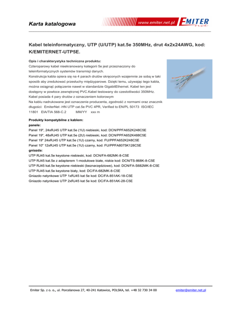 Karta katalogowa ___________________________________________________________________________ Kabel teleinformatyczny, UTP (U/UTP) kat.5e 350MHz, drut 4x2x24AWG, kod: K/EMITERNET-UTP5E. Opis i charakterystyka techniczna produktu: Czteroparowy kabel nieekranowany kategorii 5e jest przeznaczony do teleinformatycznych systemów transmisji danych. Konstrukcja kabla opiera się na 4 parach drutów skręconych wzajemnie ze sobą w taki sposób aby zredukować przesłuchy międzyparowe. Dzięki temu, używając tego kabla, można osiągnąć połączenie nawet w standardzie GigabitEthernet. Kabel ten jest dostępny w powłoce zewnętrznej PVC.Kabel testowany do czestotliwości 350MHz. Kabel posiada 4 pary drutów z oznaczeniem kolorowym Na kablu nadrukowane jest oznaczenie producenta, zgodność z normami oraz znacznik długości: EmiterNet -HN UTP cat.5e PVC 4PR, Verified to EN/PL 50173 ISO/IEC 11801 EIA/TIA 568-C.2 MM/YY xxx m Produkty kompatybilne z kablem: panele: Panel 19", 24xRJ45 UTP kat.5e (1U) niebieski, kod: DCN/PPFA652K248C5E Panel 19", 48xRJ45 UTP kat.5e (2U) niebieski, kod: DCN/PPFA652K488C5E Panel 19" 24xRJ45 UTP kat.5e (1U) czarny, kod: FU/PPFA652K248C5E Panel 10" 12xRJ45 UTP kat.5e (1U) czarny, kod: FU/PPFA8075K128C5E gniazda: UTP RJ45 kat.5e keystone niebieski, kod: DCN/FA-682MK-8-C5E UTP RJ45 kat.5e z adapterem 1-modułowe białe, niskie kod: DCN/TS-868K-8-C5E UTP RJ45 kat.5e keystone niebieski (beznarzędziowe), kod: DCN/FA-S682MK-8-C5E UTP RJ45 kat.5e keystone biały, kod: DC/FA-682MK-8-C5E Gniazdo natynkowe UTP 1xRJ45 kat 5e kod: DC/FA-851AK-18-C5E Gniazdo natynkowe UTP 2xRJ45 kat 5e kod: DC/FA-851AK-28-C5E Emiter Sp. z o. o., ul. Porcelanowa 27, 40-241 Katowice, POLSKA, tel. +48 32 730 34 00 [email protected] Karta katalogowa ___________________________________________________________________________ Parametry techniczne: Średnica zewnętrzna kabla Średnica pojedynczej żyły Izolacja zewnętrzna kabla Kolor izolacji zewnętrznej Izolacja żył Impedancja falowa 5mm 0,5mm ± 0,01mm; 24 AWG PCV biały PE 100Ω +/- 15Ω dla 1 - 100 MHz Rezystancja dowolnej pary dla nap. stałego NVP Rezystancja izolacji dowolnej żyły (min) Pojemność skuteczna dowolnej pary (f=1kHz) Promień gięcia podczas układania Promień gięcia podczas eksploatacji Temperatury pracy Temperatura podczas układania Waga Opakowanie 100Ω +/- 20Ω dla 101 - 350 MHz 97,5Ω/km 66% 150MΩ/km 50nF/km 40mm 20mm -20ºC - +70 ºC 0ºC - +50 ºC 30,5 kg/km karton, 305m Częstotliwość Tłumienność (max) Next (min) ACR (min) (MHz) (dB/100m) (dB) (dB) 10 6,2 50,4 44,1 16 7,9 47,5 39,5 62,5 16,3 38,4 21,9 100 21,1 35,4 14,6 155 26,5 33,1 6,5 250 36,4 29,4 -- 350 44,5 27,2 -- Gwarancja produktowa 5 lat od daty zakupu. Przeznaczony do instalacji z systemem EmiterNet serii certyfikowanej lub standard. Możliwość uzyskania 25 letniej Gwarancji Systemowej (po spełnieniu warunków określonych w Programie Gwarancji Systemu Okablowania Strukturalnego EmiterNet). Dołożyliśmy wszelkich starań, aby przedstawione informacje były rzetelne i kompletne. Jednak nie ponosimy odpowiedzialności za dokładność i kompletność danych oraz w szczególności nie możemy zagwarantować, że niniejsza specyfikacja nie zawiera błędów lub pomyłek. Informacje zawarte w niniejszej specyfikacji mogą zostać zmienione w każdej chwili bez powiadomienia. Emiter Sp. z o. o., ul. Porcelanowa 27, 40-241 Katowice, POLSKA, tel. +48 32 730 34 00 [email protected]