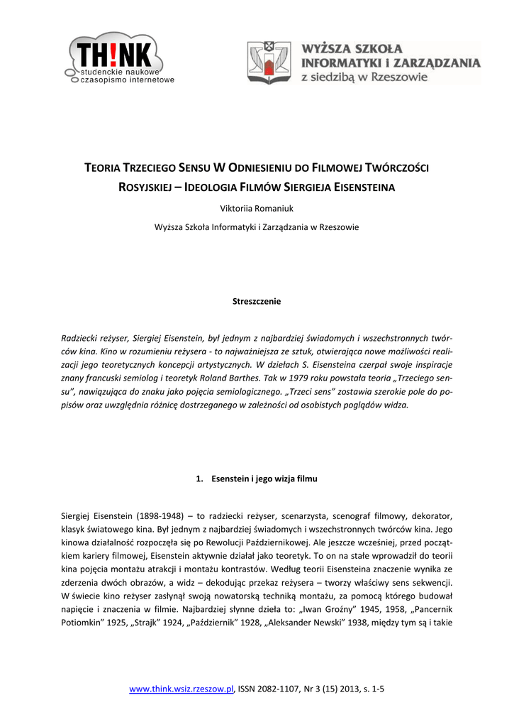 TEORIA TRZECIEGO SENSU W ODNIESIENIU DO FILMOWEJ TWÓRCZOŚCI ROSYJSKIEJ – IDEOLOGIA FILMÓW SIERGIEJA EISENSTEINA Viktoriia Romaniuk Wyższa Szkoła Informatyki i Zarządzania w Rzeszowie Streszczenie Radziecki reżyser, Siergiej Eisenstein, był jednym z najbardziej świadomych i wszechstronnych twórców kina. Kino w rozumieniu reżysera - to najważniejsza ze sztuk, otwierająca nowe możliwości realizacji jego teoretycznych koncepcji artystycznych. W dziełach S. Eisensteina czerpał swoje inspiracje znany francuski semiolog i teoretyk Roland Barthes. Tak w 1979 roku powstała teoria „Trzeciego sensu”, nawiązująca do znaku jako pojęcia semiologicznego. „Trzeci sens” zostawia szerokie pole do popisów oraz uwzględnia różnicę dostrzeganego w zależności od osobistych poglądów widza. 1. Esenstein i jego wizja filmu Siergiej Eisenstein (1898-1948) – to radziecki reżyser, scenarzysta, scenograf filmowy, dekorator, klasyk światowego kina. Był jednym z najbardziej świadomych i wszechstronnych twórców kina. Jego kinowa działalność rozpoczęła się po Rewolucji Październikowej. Ale jeszcze wcześniej, przed początkiem kariery filmowej, Eisenstein aktywnie działał jako teoretyk. To on na stałe wprowadził do teorii kina pojęcia montażu atrakcji i montażu kontrastów. Według teorii Eisensteina znaczenie wynika ze zderzenia dwóch obrazów, a widz – dekodując przekaz reżysera – tworzy właściwy sens sekwencji. W świecie kino reżyser zasłynął swoją nowatorską techniką montażu, za pomocą którego budował napięcie i znaczenia w filmie. Najbardziej słynne dzieła to: „Iwan Groźny” 1945, 1958, „Pancernik Potiomkin” 1925, „Strajk” 1924, „Październik” 1928, „Aleksander Newski” 1938, między tym są i takie www.think.wsiz.rzeszow.pl, ISSN 2082-1107, Nr 3 (15) 2013, s. 1-5 Teoria trzeciego sensu w odniesieniu do filmowej twórczości rosyjskiej – ideologia filmów Siergieja Eisensteina filmy jak „Stare i nowe” 1929, „Romans sentymentalny” 1930, „Niech żyje Meksyk!” 1932, „Łąki bieżyńskie” 19341. Jako zadeklarowany komunista, Eisenstein marzył o rewolucji artystycznej, która, nieskrępowana żadnymi ograniczeniami, miała stanowić integralny element rewolucji społecznej. Ale pomimo wielu wspaniałych osiągnięć reżyser doznał niestety wielu krzywd i upokorzeń ze strony aparatu stalinowskiej biurokracji, która na wszystkich płaszczyznach odeszła od idei jakiejkolwiek rewolucji czy rewolucyjności. W życiorysie Eisensteina, jak w pryzmacie skupił się dramat rozbudzonych nadziei europejskiej lewicowej inteligencji, zmiażdżonych przez stalinowską dyktaturę. 2. Filmowy dorobek Eisensteina Kino w rozumieniu Eisensteina, to najważniejsza ze sztuk, otwierająca nowe możliwości realizacji jego teoretycznych koncepcji artystycznych. W 1924 roku, na zamówienie partii komunistycznej, reżyser nagrał swój debiutancki obraz „Strajk” który odniósł spory sukces artystyczny. Eisensteinowski „Strajk”, jak i większość jego filmów, niesie (zawiera) w sobie bardzo wyraźne przesłanie ideologiczne. Szczególnie wielki ładunek propagandowy wyświetla scena masakry robotniczej zestawionej z ujęciami z rzeźni. Kolejny film Eisensteina, „Pancernik Potiomkin”, nakręcony w roku 1925, okazał się jeszcze większym sukcesem artystycznym, a za razem i ideologicznym. W obrazie harmoniuje awangardowa i tradycyjna forma narracji. Scena masakry ludności cywilnej na schodach odesskich została nieśmiertelną klasyką kina2. Trzecim obrazem zrealizowanym przez Eisensteina był film nakręcony z okazji 10 rocznicy rewolucji październikowej, noszący tytuł „Październik”. Główną rolę w przedstawieniu rewolucji odgrywały nie jednostki, lecz rewolucyjne masy robotnicze i żołnierskie. „Październik” był również przykładem nowej koncepcji Eisensteina tak zwanego montażu intelektualnego, w którym to „ze zderzenia dwóch kontrastujących kadrów powstaje trzecia idea, w kadrze nie istniejąca”. Dzieło spotkało się z bardzo negatywnym przyjęciem partyjnej krytyki. Samemu Eisensteinowi zarzucono „grzechy formalizmu” i zbliżenie się do socrealizmu. Następny obraz „Stare i Nowe” – przedstawiający zalety kolektywnej pracy na wsi, doprowadził do zmiany polityki partyjnej w kwestii wsi, co skutkowało nieprzychylnym przyjęciem ze strony Stalina. Ogólnie rzecz biorąc ten film również został poddany ostrej krytyce. Po „Łąkach bieżyńskich” i „Niech żyje Meksyk!” do Eisensteina powróciła łaska partii Stalina. Reżyserowi zlecono realizację historycznego filmu „Aleksander Newski”. Dzieło przedstawiające wydarzenia z roku 1242, kiedy to książę włodzimierski Aleksander Jarosławicz, zwany Newskim, pokonał wojska zakonu krzyżackiego. Film ten stanowił krok wstecz w nowatorskich koncepcjach Eisensteina. Pomimo tego zapisał się on złotymi zgłoskami w historii światowego kina. W Związku Radzieckim spotkał się z bardzo pozytywnym przyjęciem, czego dowodem jest uhonorowanie Eisensteina Orderem Lenina. Partia zadowolona z tego dzieła powierzyła Eisensteinowi realizację jeszcze większej historycznej produkcji przedstawiającej panowanie Iwana IV Groźnego. Stalin był zachwycony pierwszą częścią filmu przedstawiającą cara jako wielkiego męża stanu – twórcę nowożytnego państwa rosyjskiego. Czego nie można powiedzieć o drugiej części obrazu – „Spisek bojarów”. Przez to po raz pierwszy drugą część pokazano dopiero w roku 1958. Niestety reżyser nie dożył do tej pory - umarł w roku 1 2 B. Machalica, Życie niewyreżyserowane, http://www.lewica.pl/?id=12717, 11.06.13. Siergiej Eisenstein, http://www.filmweb.pl/person/Siergiej+Eisenstein-73443/biography, 11.06.13. 2 Teoria trzeciego sensu w odniesieniu do filmowej twórczości rosyjskiej – ideologia filmów Siergieja Eisensteina 1948 otoczony 